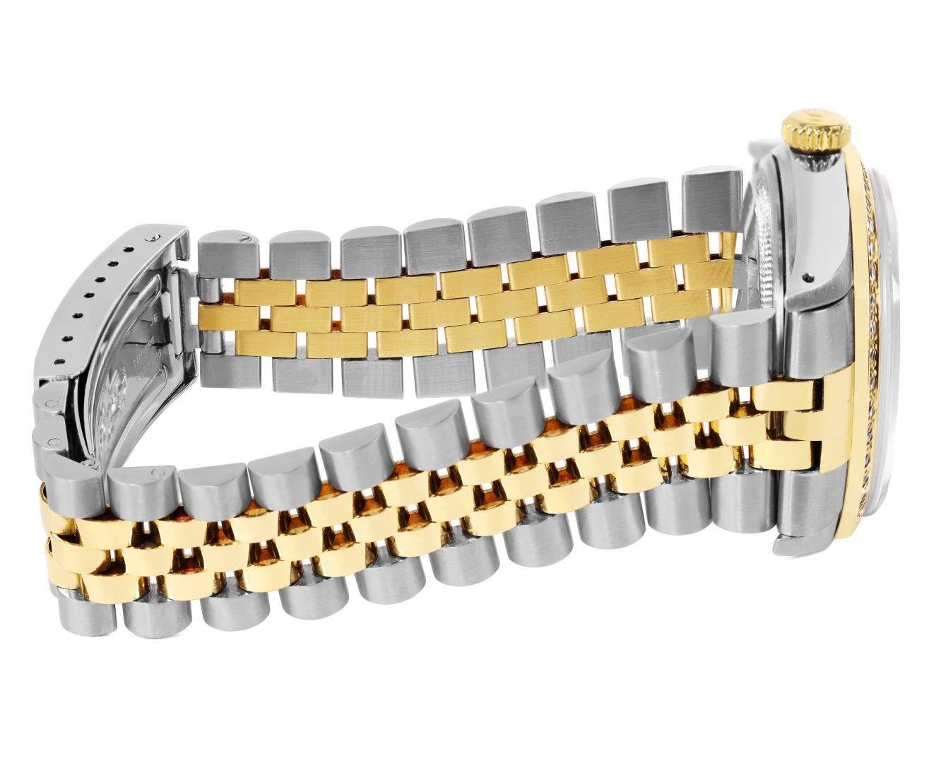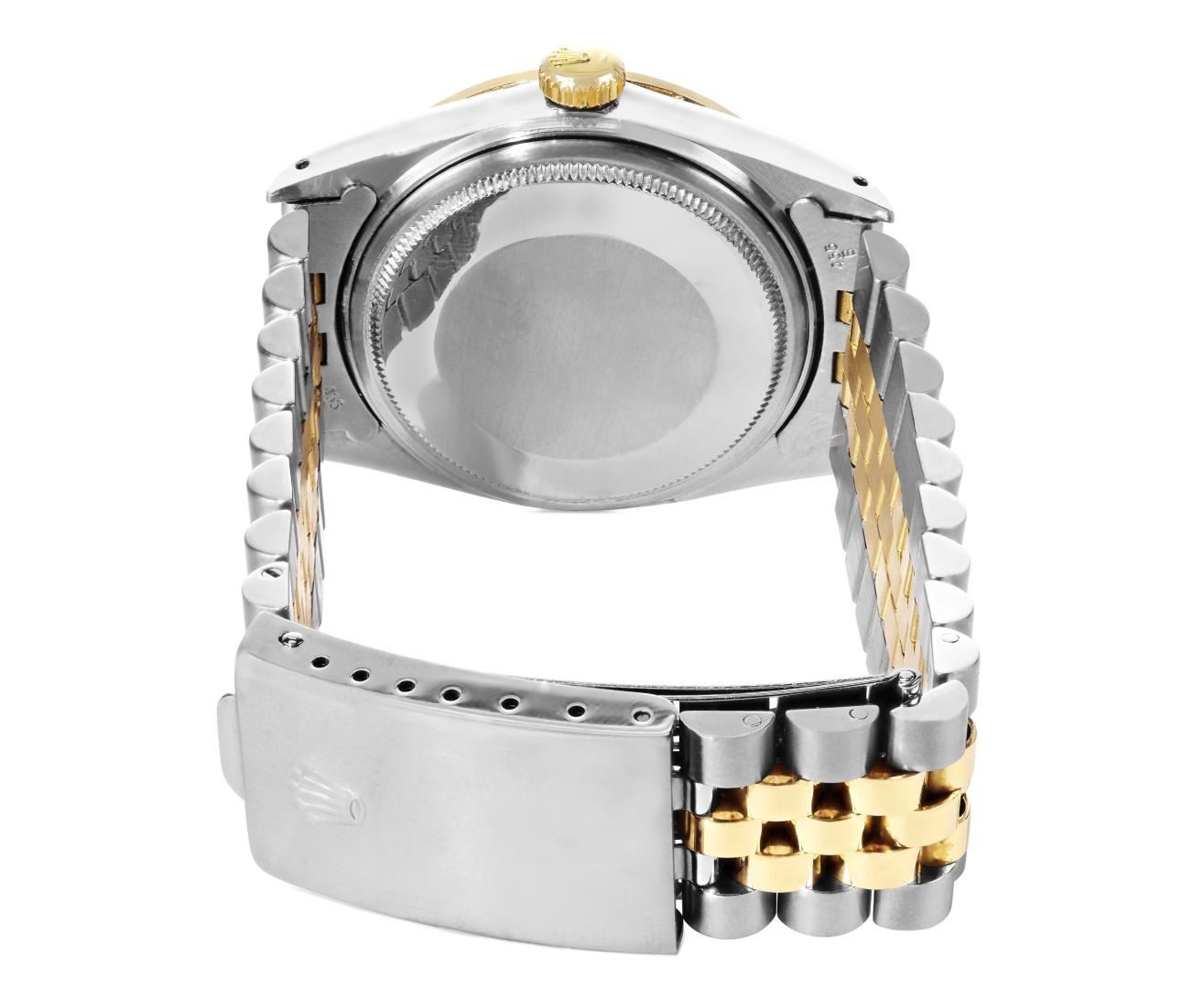 One Mens Pre Owned Yellow Gold Two Tone Rolex Datejust Polished, Serviced And Electronically Tested, Rolex Yellow Gold And Stainless Steel Case: 36mm, Rolex Yellow Gold Crown, Custom Bezel: New 18K Yellow Gold Beadset Diamond Bezel, Diamond Count: 44 Diamonds. Custom Crystal: New Sapphire With Magnified Date Window. Custom Hands: New Luminecent Hands. Rolex Movement: Automatic Winding Movement 3035. Rolex Dial: Champagne Linen Dial With Index Hour Markers and Dash Track With Lumi Dots. Date Window: 3 O'Clock Position Date Display, Quickset, Model: Quickset Datejust. Condition: G-6 Extra Fine. Rolex Bracelet: Two Tone Yellow Gold And Stainless Steel Jubilee Band. Bright Polish. 7.0 Inch Length, Adjustable. Standard Clasp, With Rolex Logo. This Watch Has Been Serviced Time Tested And Is In Excellent Condition It Is Free Of All Scratches And Dents.