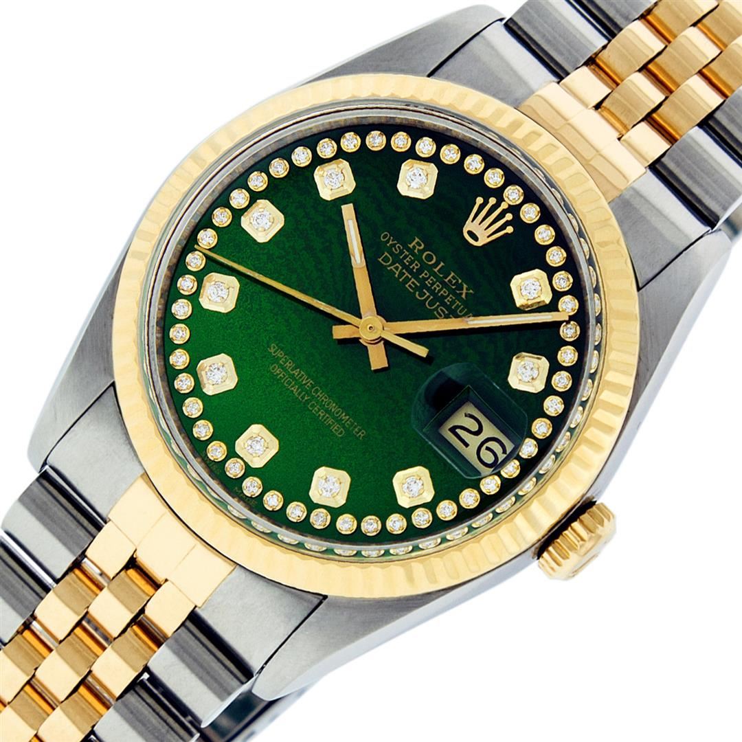 One Mens Yellow Gold Two Tone Rolex Datejust Polished, Serviced & Electronically Tested, Yellow Gold & Stainless Steel Case: 36mm, Yellow Gold Crown, Bezel: Yellow Gold Fluted Bezel. Custom Crystal: New Acrylic Cyclops Lens. Custom Hands: New Luminecent Hands. Movement: Automatic Winding Movement.. Custom Dial: Green String Dial Set With Diamond Hour Markers, Diamond Count: 58 Diamonds in Dial, G To H In Color, SI-VS Clarity. Date Window: 3 O'Clock Position Date Display, Quickset, Model: Datejust, Condition: G-6 Extra Fine. Bracelet: Two Tone Yellow Gold & Stainless Steel Jubilee Band. Bright Polish. 7.0 Inch Length, Adjustable. Standard Clasp, With Rolex Logo. This Watch Has Been Serviced And Polished It Is Free Of All Scratches And Dents.