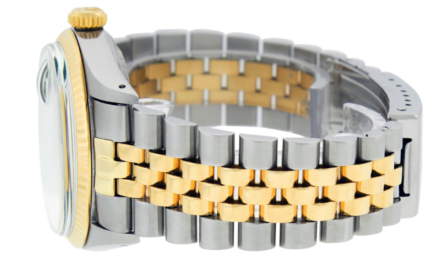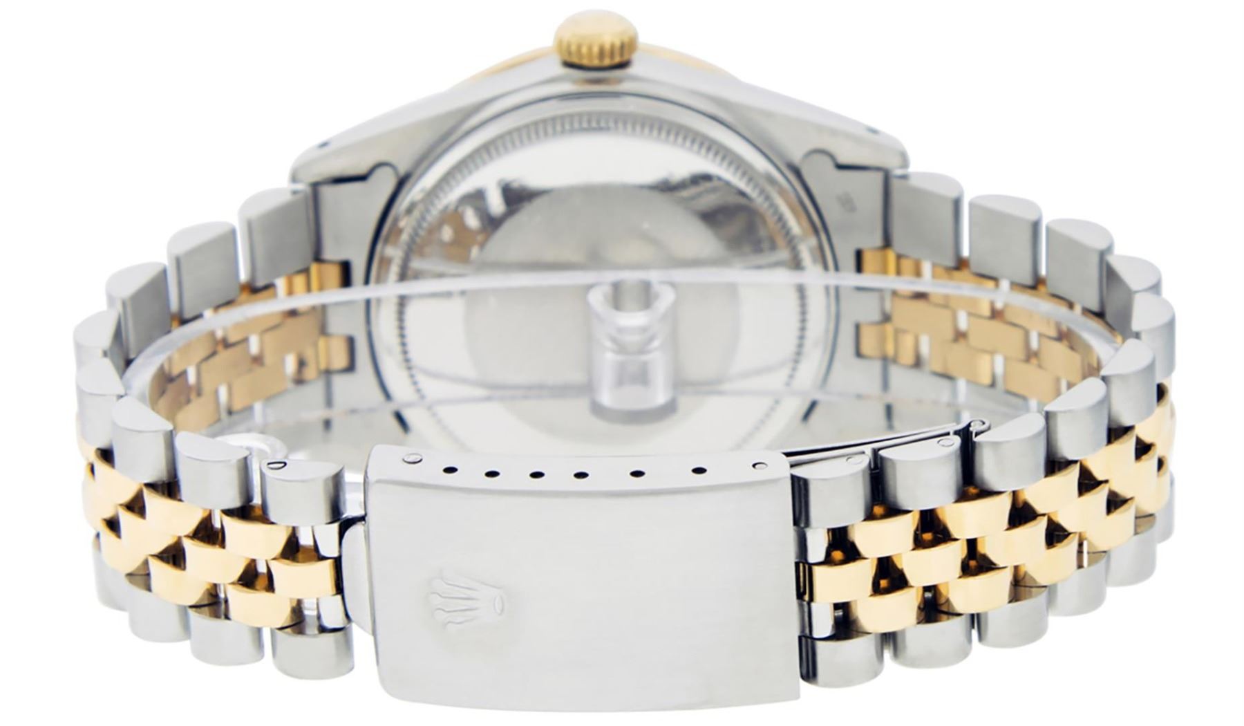 One Mens Pre Owned Yellow Gold Two Tone Rolex Datejust Polished, Serviced & Electronically Tested, Rolex Yellow Gold & Stainless Steel Case: 36mm, Rolex Yellow Gold Crown, Rolex Bezel: Yellow Gold Fluted Bezel. Custom Crystal: New Acrylic Cyclops Lens. Custom Hands: New Luminecent Hands. Rolex Movement: Automatic Winding Movement. Custom Dial: Refinished To Green String With Added Diamond Hour Markers, Diamond Count: 58 Diamonds in Dial, G To H In Color, SI-VS Clarity. Date Window: 3 O'Clock Position Date Display, Quickset, Model: Datejust, Condition: G-6 Extra Fine. Rolex Bracelet: Two Tone Yellow Gold & Stainless Steel Jubilee Band. Bright Polish. 7.0 Inch Length, Adjustable. Standard Clasp, With Rolex Logo. This Watch Has Been Serviced And Polished It Is Free Of All Scratches And Dents.