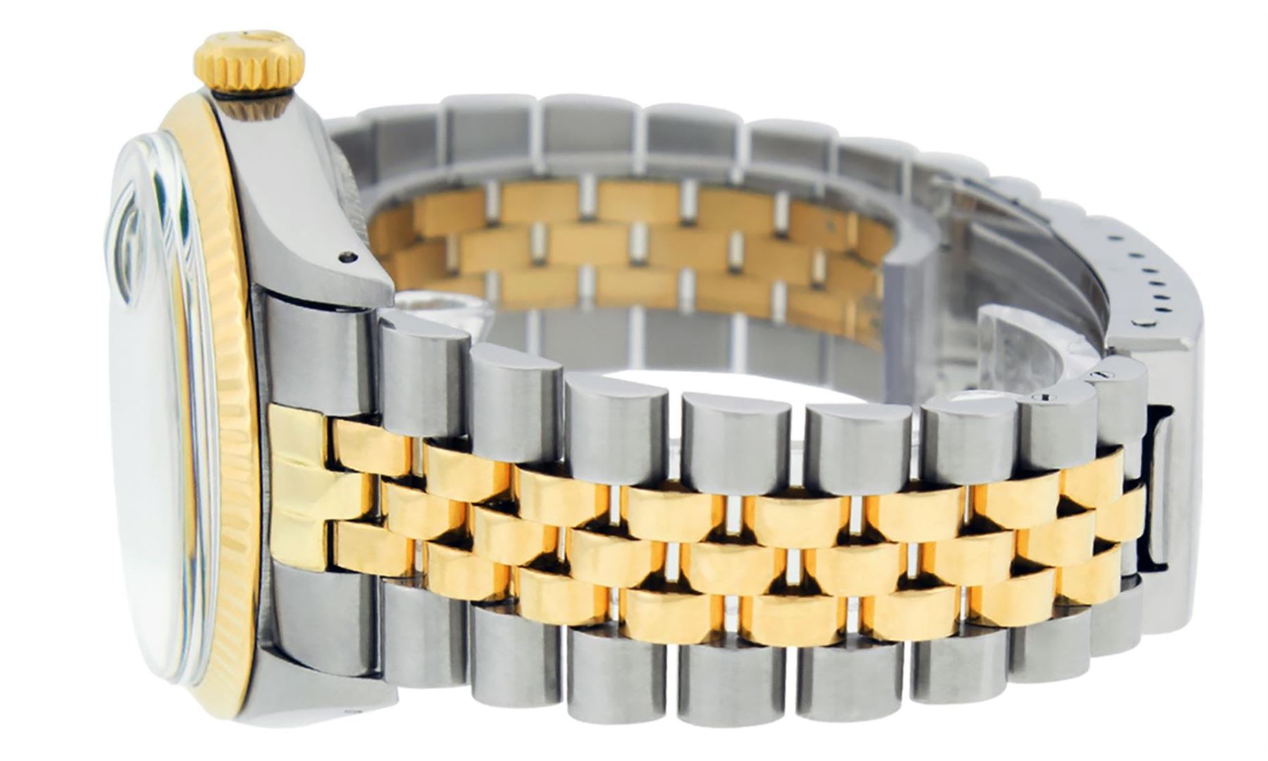 One Mens Pre Owned Yellow Gold Two Tone Rolex Datejust Polished, Serviced & Electronically Tested, Rolex Yellow Gold & Stainless Steel Case: 36mm, Rolex Yellow Gold Crown, Rolex Bezel: Yellow Gold Fluted Bezel. Custom Crystal: New Acrylic Cyclops Lens. Custom Hands: New Luminecent Hands. Rolex Movement: Automatic Winding Movement. Custom Dial: Refinished To Green String With Added Diamond Hour Markers, Diamond Count: 58 Diamonds in Dial, G To H In Color, SI-VS Clarity. Date Window: 3 O'Clock Position Date Display, Quickset, Model: Datejust, Condition: G-6 Extra Fine. Rolex Bracelet: Two Tone Yellow Gold & Stainless Steel Jubilee Band. Bright Polish. 7.0 Inch Length, Adjustable. Standard Clasp, With Rolex Logo. This Watch Has Been Serviced And Polished It Is Free Of All Scratches And Dents.
