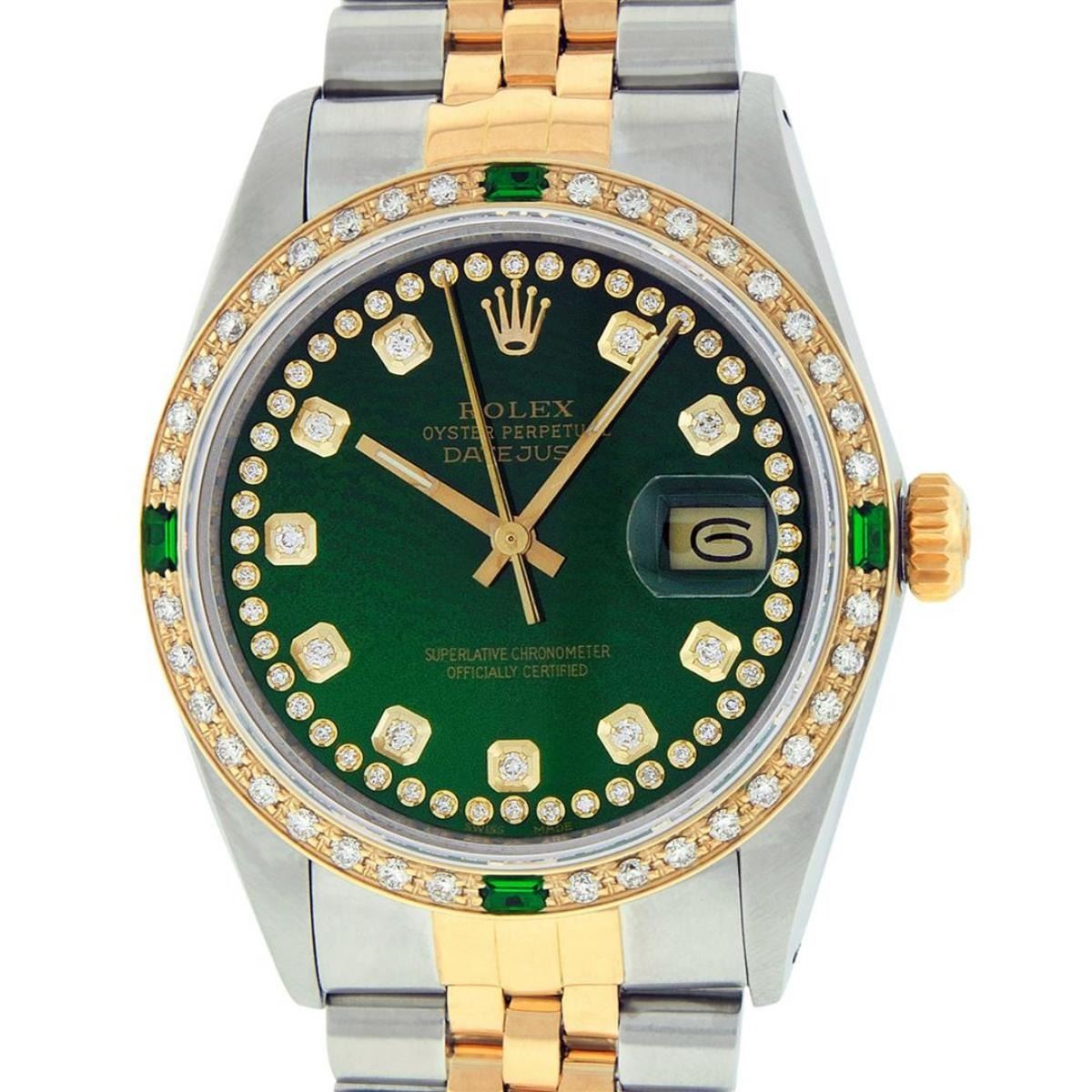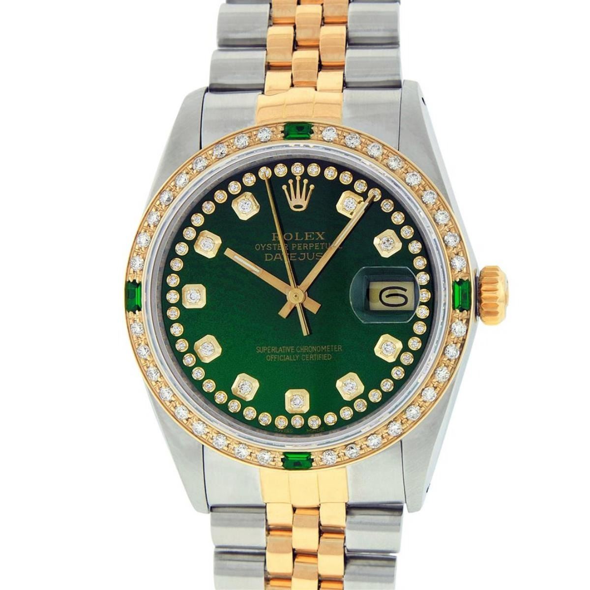 One Mens Yellow Gold Two Tone Rolex Datejust Polished, Serviced & Electronically Tested, Yellow Gold & Stainless Steel Case: 36mm, Yellow Gold Crown, Custom Bezel: New 18K Yellow Gold Emerald Beadset Diamond Bezel, Diamond Count: 36 Diamonds + 4 Emeralds, Total Weight 1.00 Carat, Clarity: SI-VS, Color: G to H. Custom Crystal: New Scratch Resistant Synthetic Sapphire Cyclops Lens. Custom Hands: New Luminecent Hands. Movement: Automatic Winding Movement. Custom Dial: Green String Diamond Dial, Diamond Count: 58 Diamonds in Dial, G To H In Color, SI-VS Clarity. Date Window: 3 O'Clock Position Date Display, Quickset, Model: Datejust. Condition: G-6 Extra Fine. Bracelet: Two Tone Yellow Gold & Stainless Steel Jubilee Band. Bright Polish. 7.0 Inch Length, Adjustable. Standard Clasp, With Rolex Logo. This Watch Has Been Serviced Time Tested And Is In Excellent Condition It Is Free Of All Scratches And Dents.