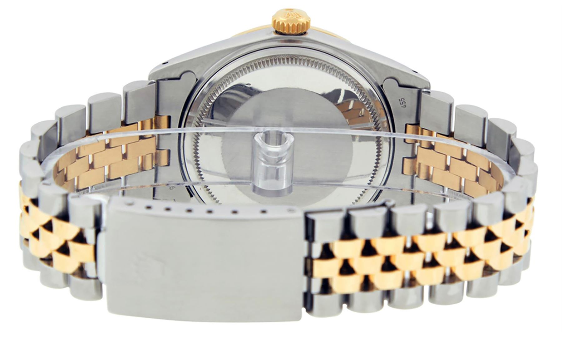 One Mens Pre Owned Yellow Gold Two Tone Rolex Datejust Polished, Serviced & Electronically Tested, Rolex Yellow Gold & Stainless Steel Case: 36mm, Rolex Yellow Gold Crown, Custom Bezel: New 18K Yellow Gold Emerald Bead set Diamond Bezel, Diamond Count: 36