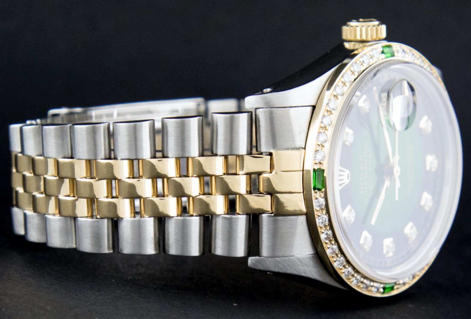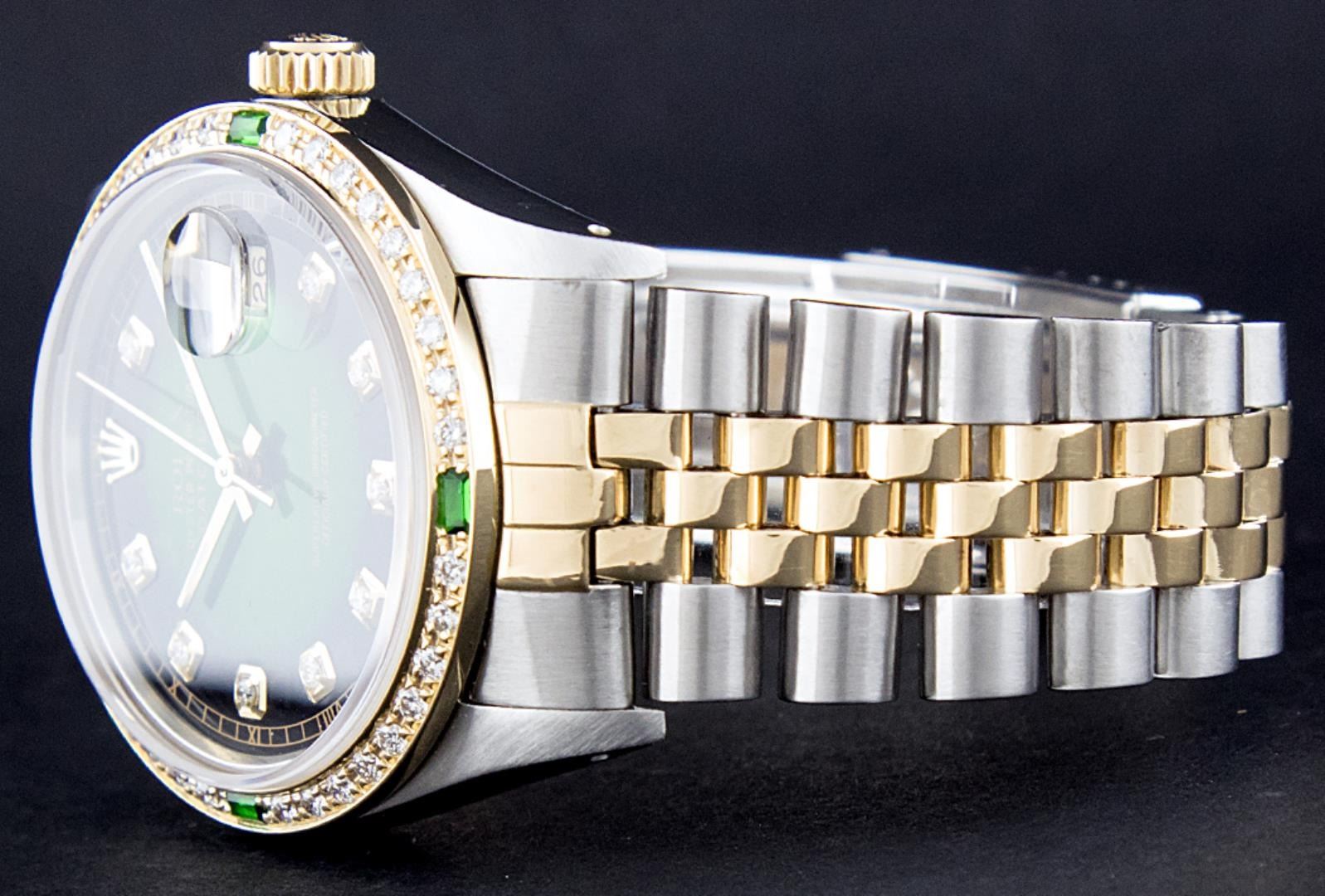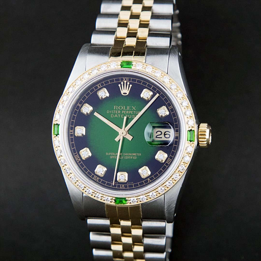 One Mens Pre Owned Yellow Gold Two Tone Rolex Datejust Polished, Serviced And Electronically Tested, Rolex Case: Yellow Gold And Stainless Steel Case: 36mm, Rolex Yellow Gold Crown, Custom Bezel: New 18K Yellow Gold Beadset Bezel + Emerald Baguettes, Diamond Count: 36 Diamonds + 4 Emeralds. Custom Crystal: New Sapphire With Magnified Date Window, Custom Hands: New Luminescent Hands. Rolex Movement: Automatic Winding Movement 3035. Custom Dial: Custom Green Vignette With Added Diamonds, Diamond Count: 58 Diamonds in Dial. Date Window: 3 O'Clock Position Date Display, Quickset, Model: Quickset Datejust, Condition: G-6 Extra Fine. Rolex Bracelet: Two Tone Yellow Gold And Stainless Steel Jubilee Band. Bright Polish. 7.0 Inch Length, Adjustable. Standard Clasp, With Rolex Logo. This Watch Has Been Serviced And Polished It Is Free Of All Scratches And Dents.