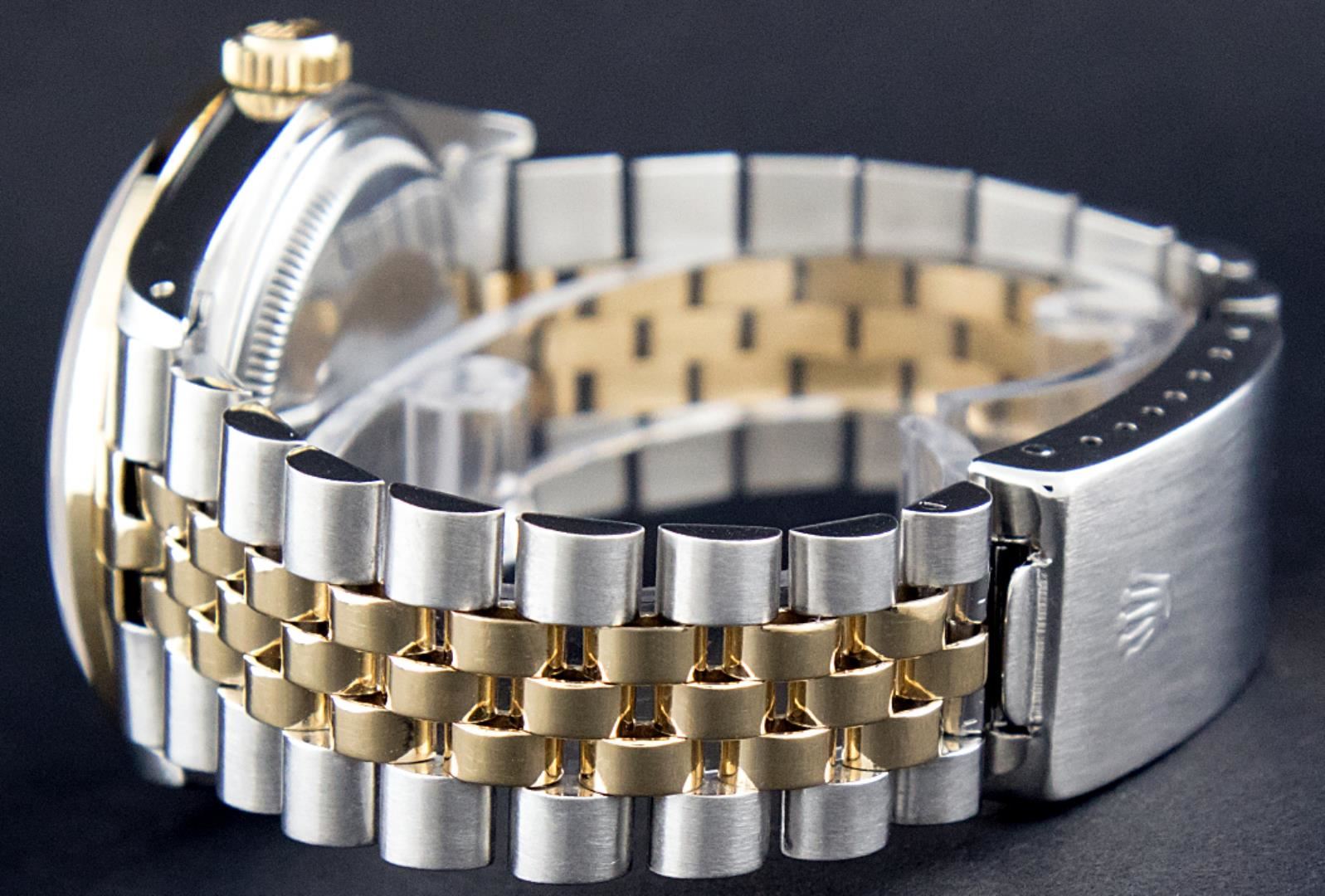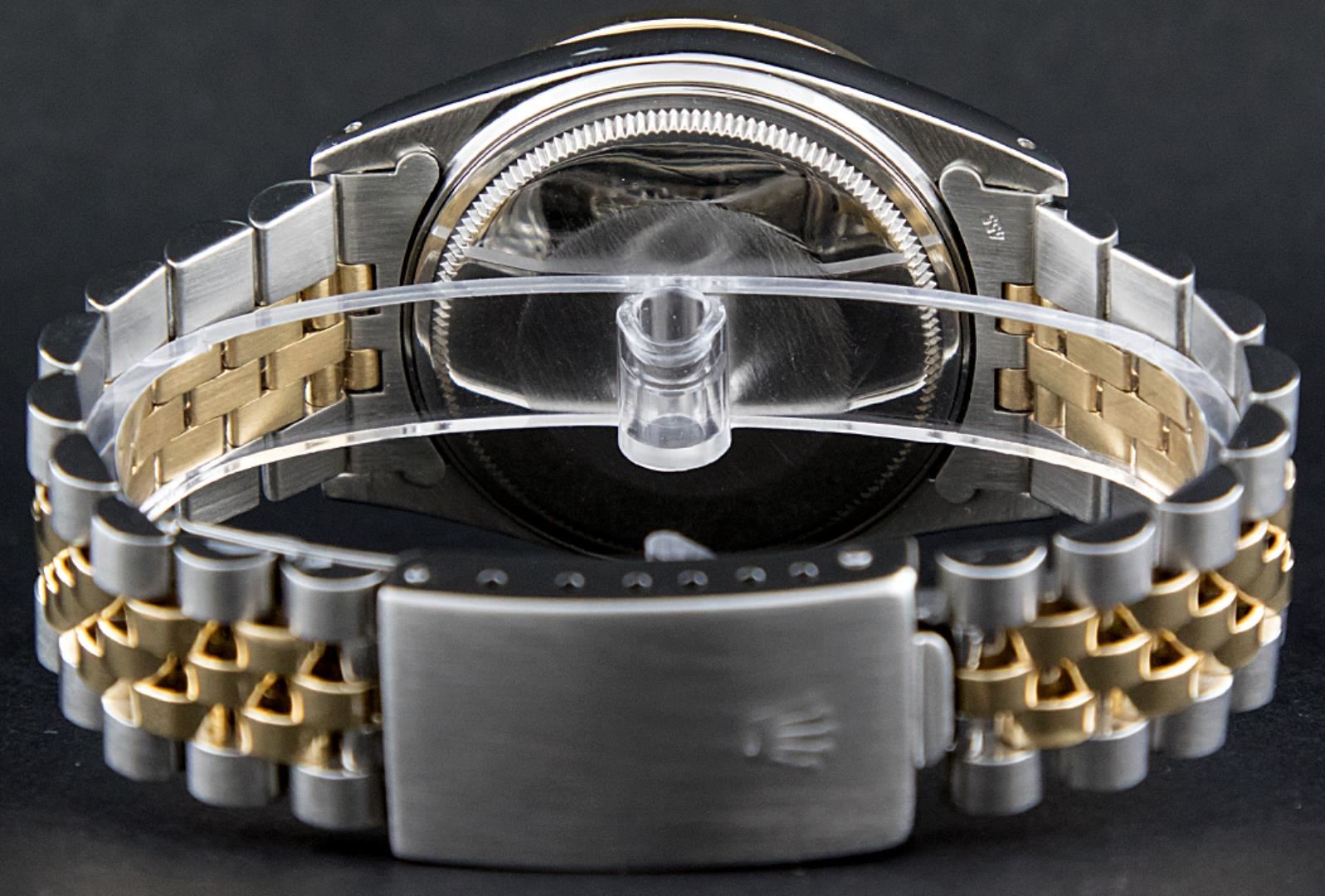 One Mens Pre Owned Yellow Gold Two Tone Rolex Datejust Polished, Serviced And Electronically Tested, Rolex Case: Yellow Gold And Stainless Steel Case: 36mm, Rolex Yellow Gold Crown, Custom Bezel: New 18K Yellow Gold Beadset Bezel + Emerald Baguettes, Diamond Count: 36 Diamonds + 4 Emeralds. Custom Crystal: New Sapphire With Magnified Date Window, Custom Hands: New Luminescent Hands. Rolex Movement: Automatic Winding Movement 3035. Custom Dial: Custom Green Vignette With Added Diamonds, Diamond Count: 58 Diamonds in Dial. Date Window: 3 O'Clock Position Date Display, Quickset, Model: Quickset Datejust, Condition: G-6 Extra Fine. Rolex Bracelet: Two Tone Yellow Gold And Stainless Steel Jubilee Band. Bright Polish. 7.0 Inch Length, Adjustable. Standard Clasp, With Rolex Logo. This Watch Has Been Serviced And Polished It Is Free Of All Scratches And Dents.
