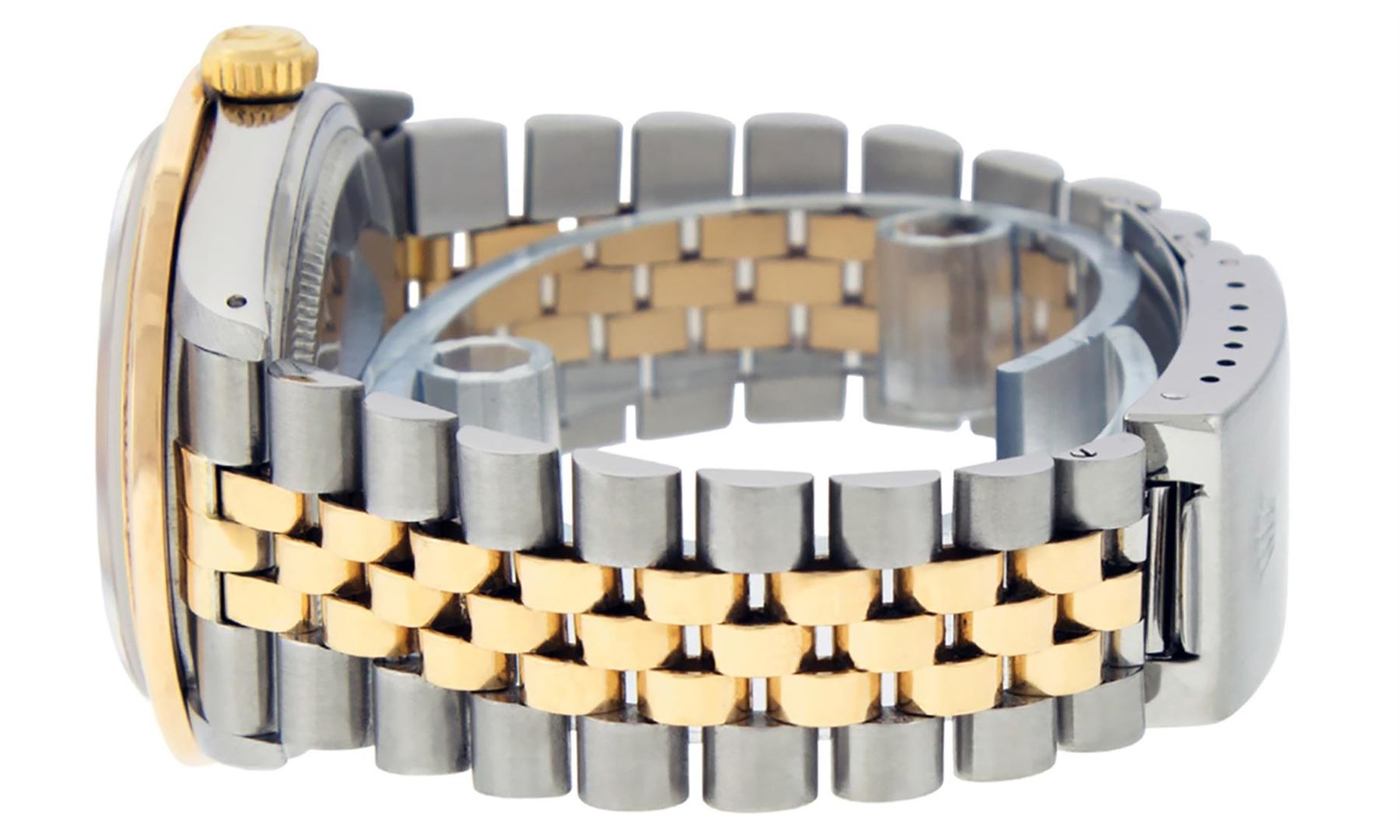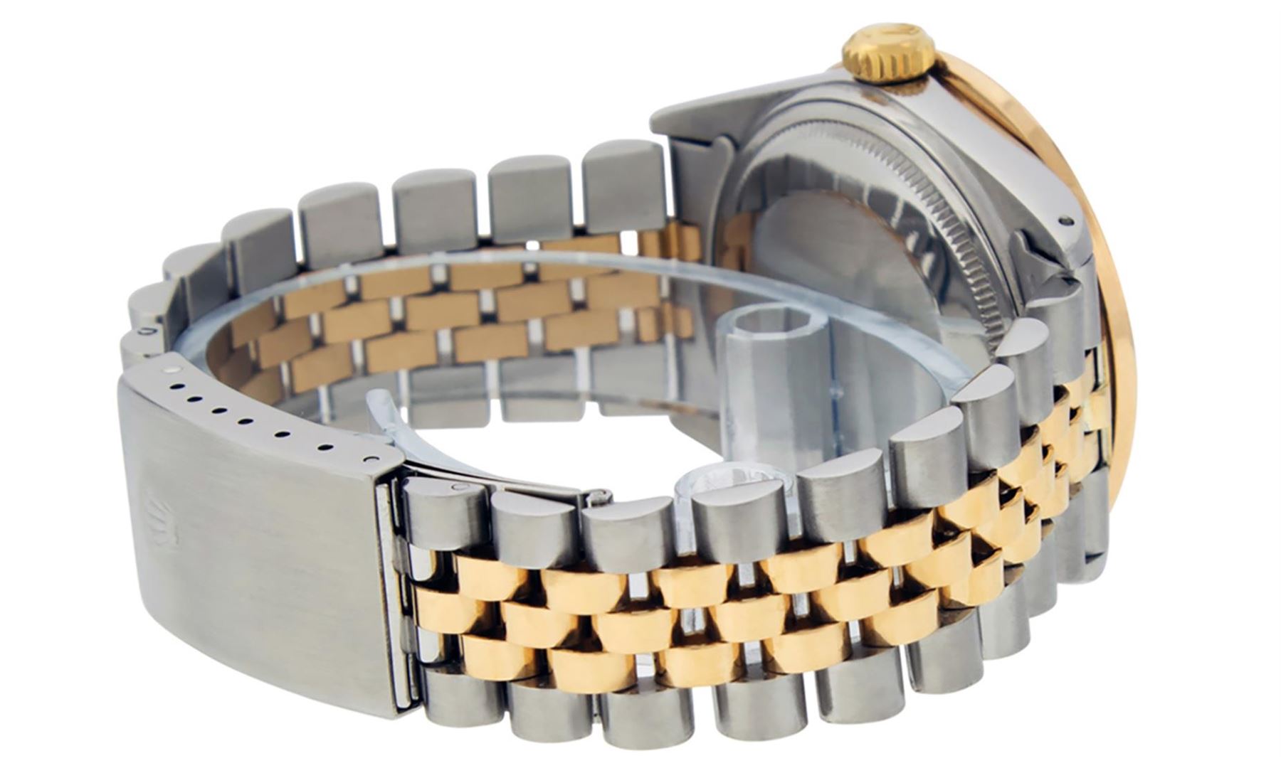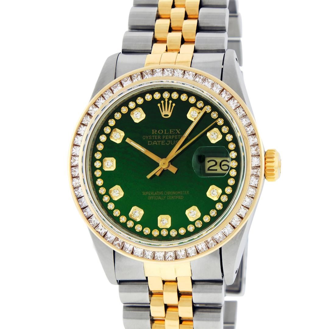 One Mens Pre Owned Yellow Gold Two Tone Rolex Datejust Polished Bright with Satin Finish, Serviced & Electronically Tested, Rolex Yellow Gold And Stainless Steel Case: 36mm, Rolex Yellow Gold Crown, Custom Bezel: New 14K Yellow Gold Princess Cut Diamond Bezel, Diamond Count: 53 Diamonds, Total Weight 2.75 Carat, Clarity: SI-VS, Color: G to H. Custom Crystal: New Sapphire Magnified Date. Custom Hands: New Luminescent Hands. Rolex Movement: Automatic Winding Movement. Custom Dial: Refinished Green String With Custom Added Diamonds, Diamond Count: 58 Diamond in Dial, Dial Color: G To H In Color, Clarity: VS2-SI1. Date Window: 3 O'Clock Position Date Display, Quickset, Model: Datejust. Condition: G-6 Extra Fine. Rolex Bracelet: Yellow Gold And Stainless Steel Jubilee. Bright Polish & Satin Finish. 7.0 Inch Length, Adjustable. Standard Clasp, With Rolex Logo. This Watch Has Been Serviced and Polished And It Is Free Of All Dents And Scratches And Has Been Time Tested.