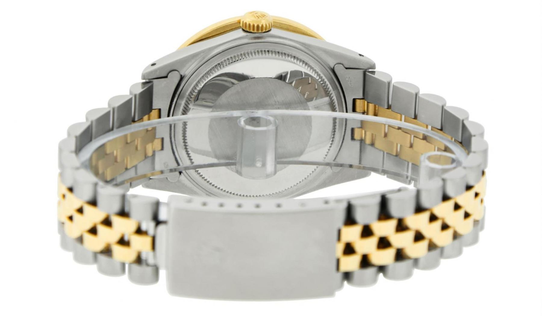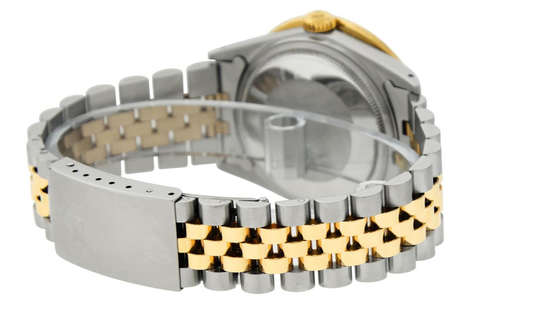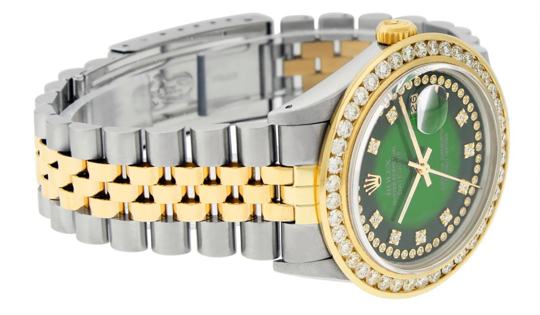 One Mens Pre Owned Yellow Gold Rolex Datejust Polished Bright with Satin Finish, Serviced & Electronically Tested, Stainless Steel Case: 36mm, Yellow Gold Crown, Custom Bezel: New 18K Yellow Gold 3ct Channel Set Diamond Bezel, Diamond Count: 40 Diamonds,
