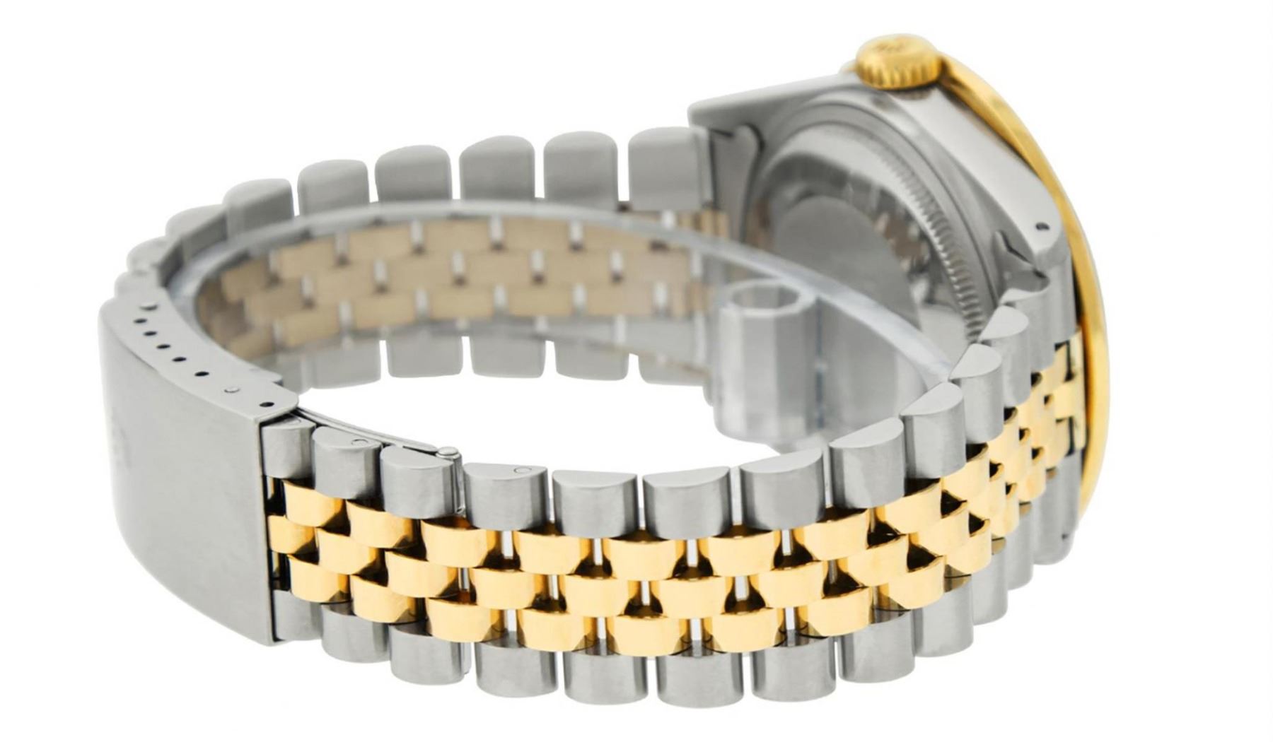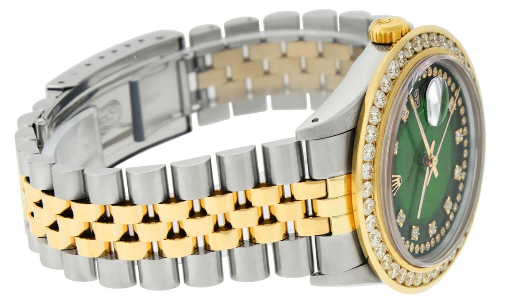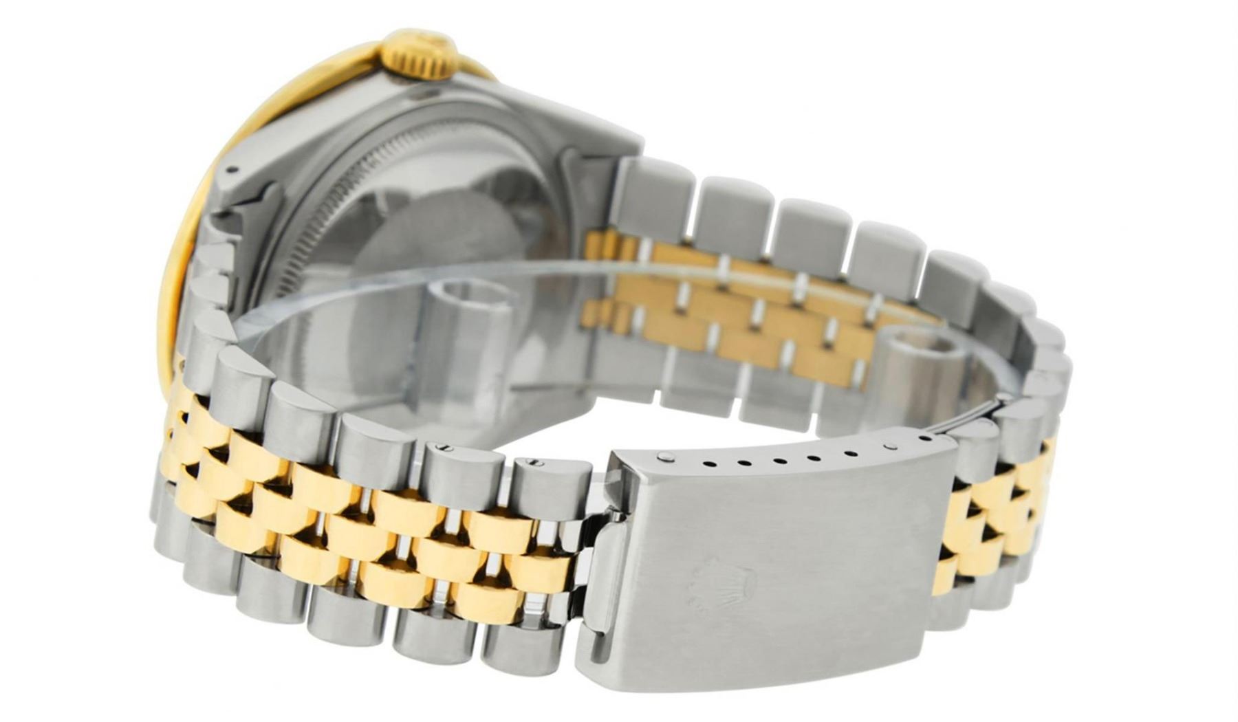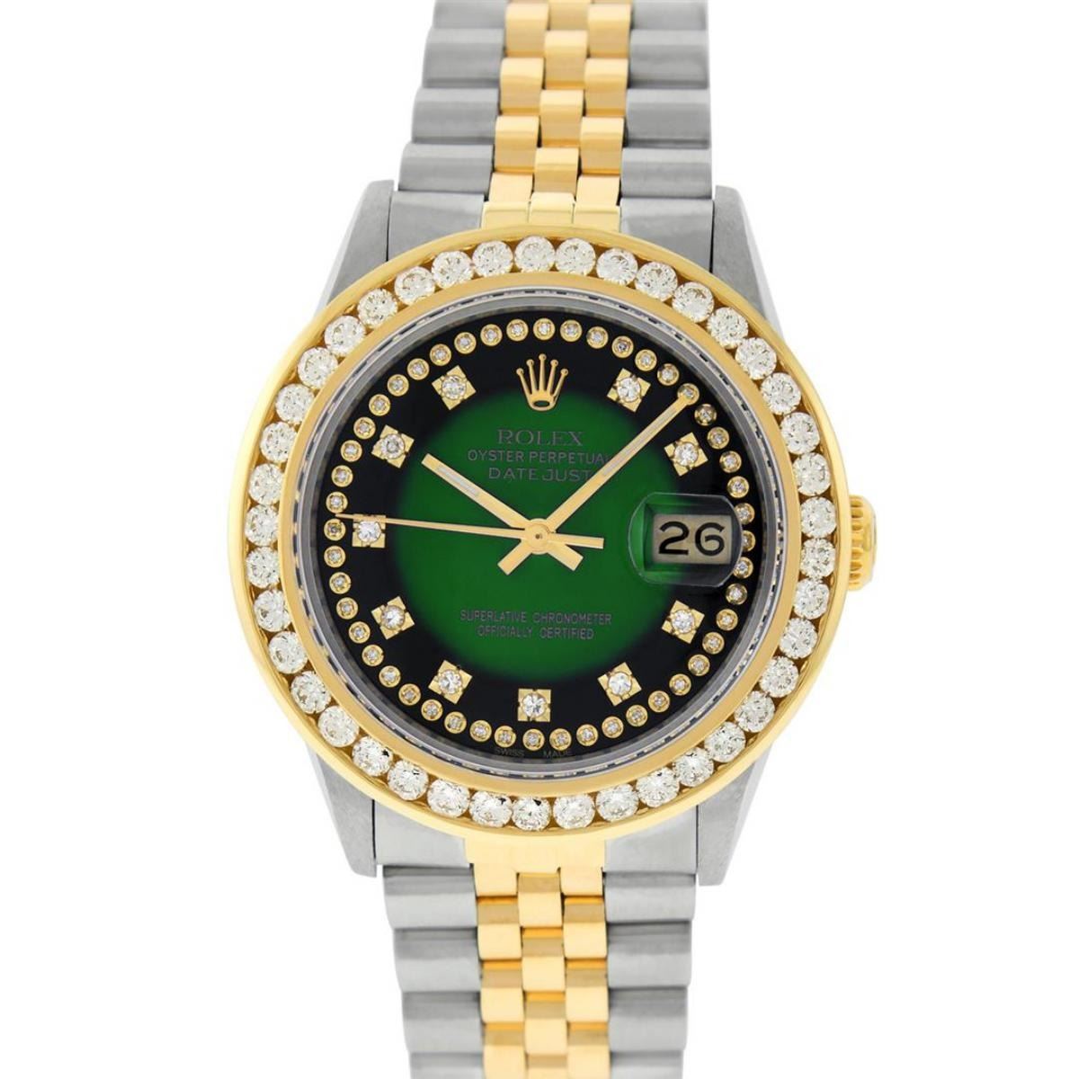 One Mens Pre Owned Yellow Gold Rolex Datejust Polished Bright with Satin Finish, Serviced & Electronically Tested, Stainless Steel Case: 36mm, Yellow Gold Crown, Custom Bezel: New 18K Yellow Gold 3ct Channel Set Diamond Bezel, Diamond Count: 40 Diamonds,