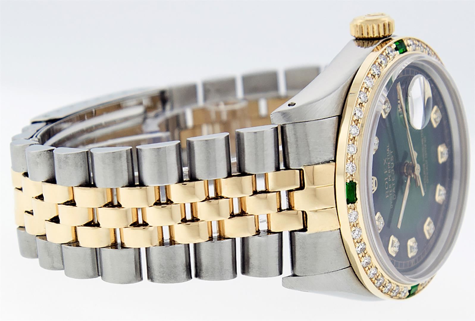 One Mens Pre Owned Yellow Gold Two Tone Rolex Datejust Polished, Serviced & Electronically Tested, Rolex Case: Yellow Gold & Stainless Steel Case: 36mm, Rolex Yellow Gold Crown, Custom Bezel: 18K Yellow Gold Beadset Bezel + Emerald Baguettes, Diamond Count: 36 Diamonds + 4 Emeralds. Custom Crystal: New Sapphire Magnified, Custom Hands: New Luminescent Hands. Rolex Movement: Automatic Winding Movement. Custom Dial: Refinished Green Vignette With Custom Added Diamonds, Diamond Count: 58 Diamonds in Dial, G To H In Color, SI-VS Clarity. Date Window: 3 O'Clock Position Date Display, Quickset, Model: Datejust, Condition: G-6 Extra Fine. Rolex Bracelet: Two Tone Yellow Gold & Stainless Steel Jubilee Band. Bright Polish. 7.0 Inch Length, Adjustable. Standard Clasp, With Rolex Logo. This Watch Has Been Serviced And Polished It Is Free Of All Scratches And Dents.