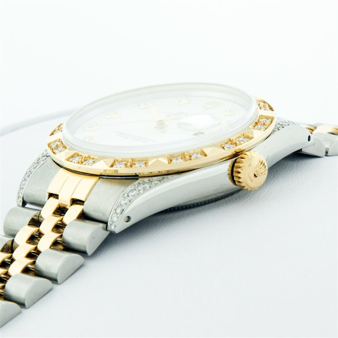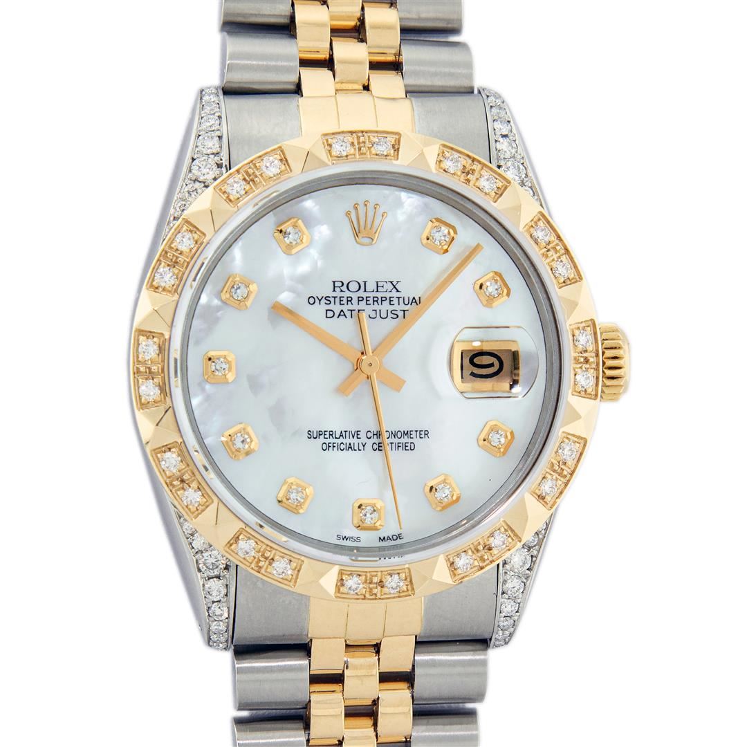 One Mens Yellow Gold & Stainless Steel Datejust Polished Bright with Satin Finish, Serviced & Electronically Tested, Stainless Steel Case: 36mm, Custom Diamond Lugs: 28 Diamonds In Lugs, Color: G to H, Clarity: SI-VS. Yellow Gold Crown, Custom Bezel: New 18K Yellow Gold Pyramid Diamond Bezel, Diamond Count: 24 Diamonds, Total Weight .75 Carat, Clarity: SI-VS, Color: G to H. Custom Crystal: New Scratch Resistant Synthetic Sapphire Cyclops Lens. Custom Hands: New Luminecent Hands. Movement: Automatic Winding Movement. Custom Dial: Mother Of Pearl Diamond, Stone Count: 10 Diamonds On Dial, Color: G to H, Clarity: VS. Date Window: 3 O'Clock Position Date Display, Quickset, Model: Datejust. Condition: G-6 Extra Fine. Bracelet: Yellow Gold And Stainless Steel Jubilee Band. Bright Polish & Satin Finish. 7.0 Inch Length, Adjustable. Standard Clasp, With Rolex Logo. This Watch Has Been Serviced And Polished It Is Free Of All Scratches And Dents.
