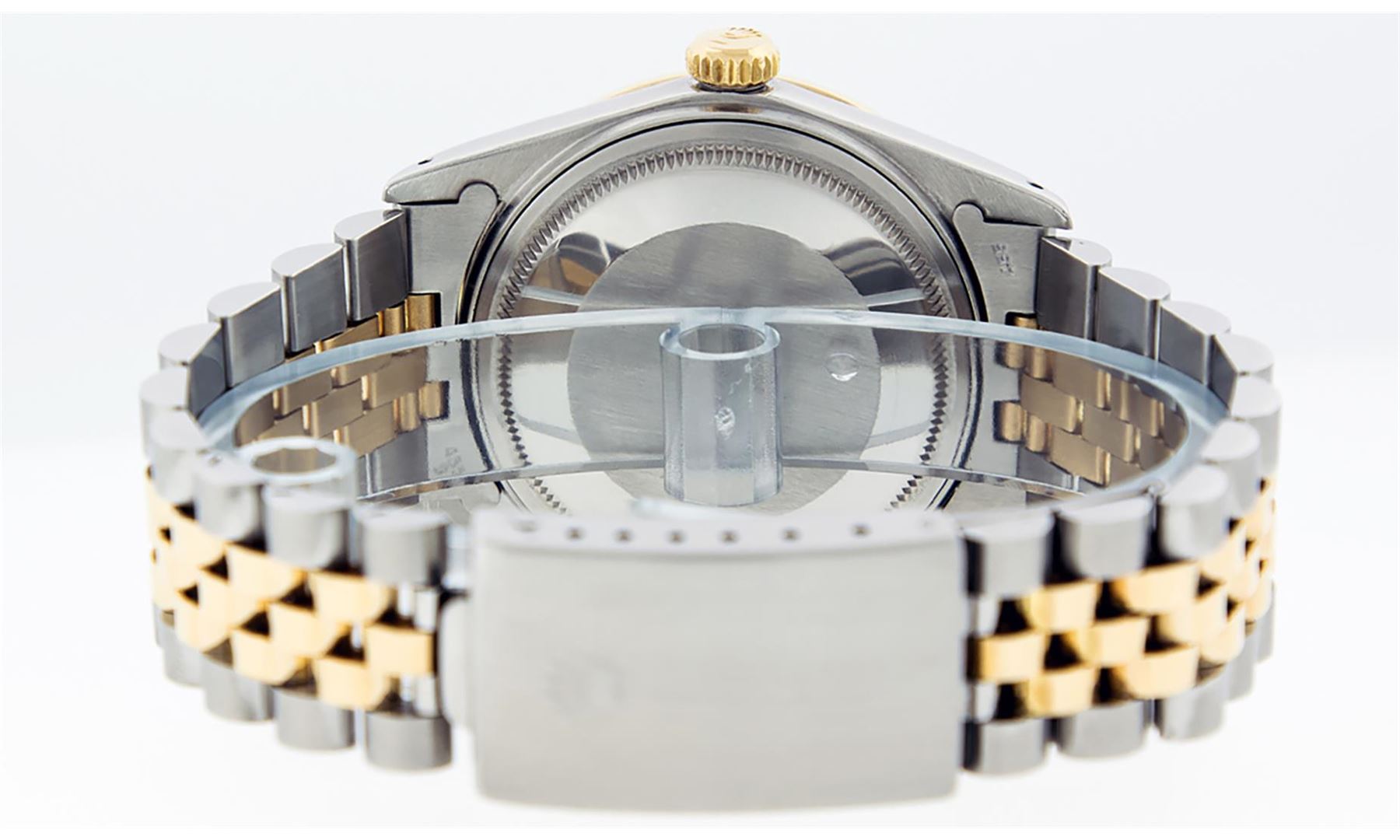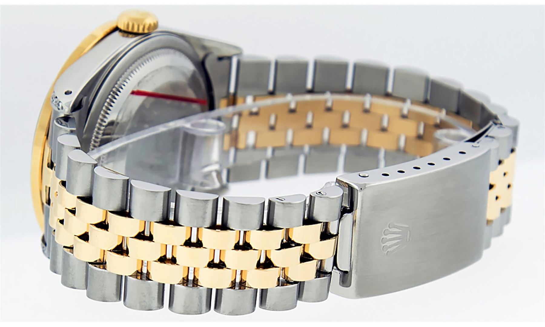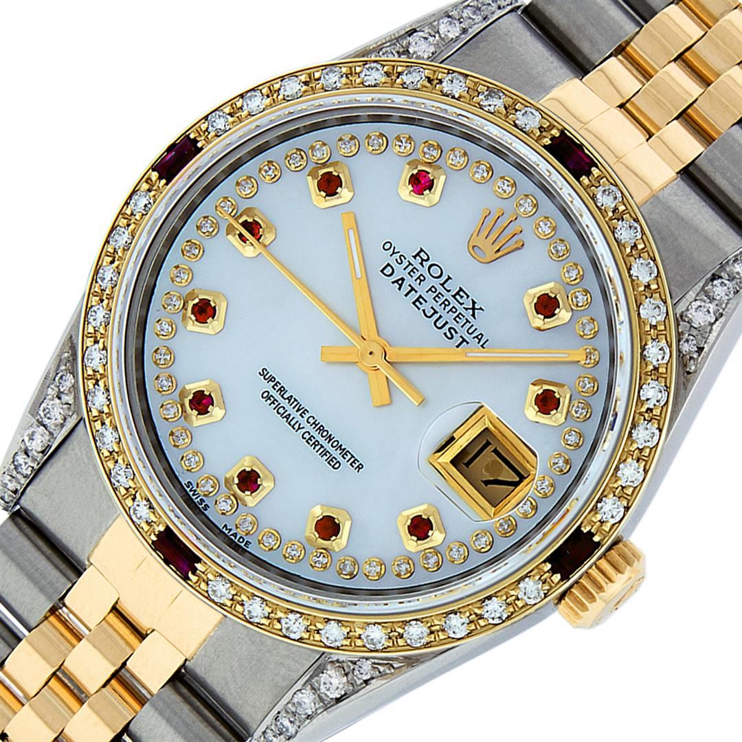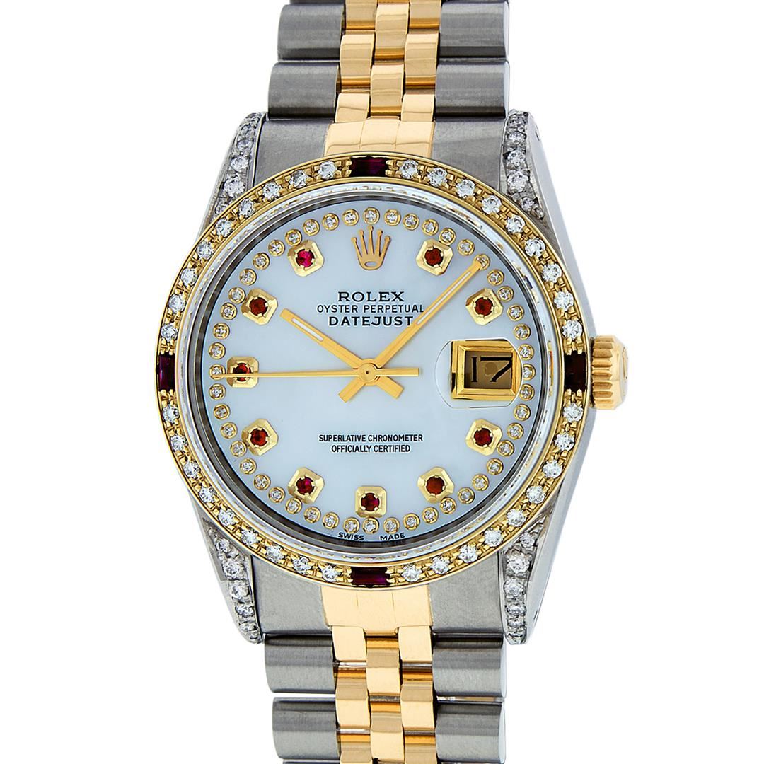 One Mens Yellow Gold Rolex Datejust Polished Bright with Satin Finish, Serviced & Electronically Tested, Stainless Steel Case: 36mm, Custom Diamond Lugs: 28 Diamonds In Lugs, Color: G to H, Clarity: SI-VS. Yellow Gold Crown, Custom Bezel: New 18K Yellow Gold Beadset + Ruby Diamond Bezel, Stone Count: 36 Diamonds + 4 Rubies, Total Weight 1.00 Carat, Clarity: SI-VS, Color: G to H. Custom Crystal: New Scratch Resistant Synthetic Sapphire Cyclops Lens. Custom Hands: New Luminecent Hands. Movement: Automatic Winding Movement . Custom Dial: Mother Of Pearl Ruby String Diamond, Stone Count: 48 Diamonds + 10 Rubies In Dial, Color: G to H, Clarity: VS. Date Window: 3 O'Clock Position Date Display, Quickset, Model: Datejust. Condition: G-6 Extra Fine. Bracelet: Yellow Gold And Stainless Steel Jubilee Band. Bright Polish & Satin Finish. 7.0 Inch Length, Adjustable. Standard Clasp, With Rolex Logo. This Watch Has Been Serviced And Polished It Is Free Of All Scratches And Dents.
