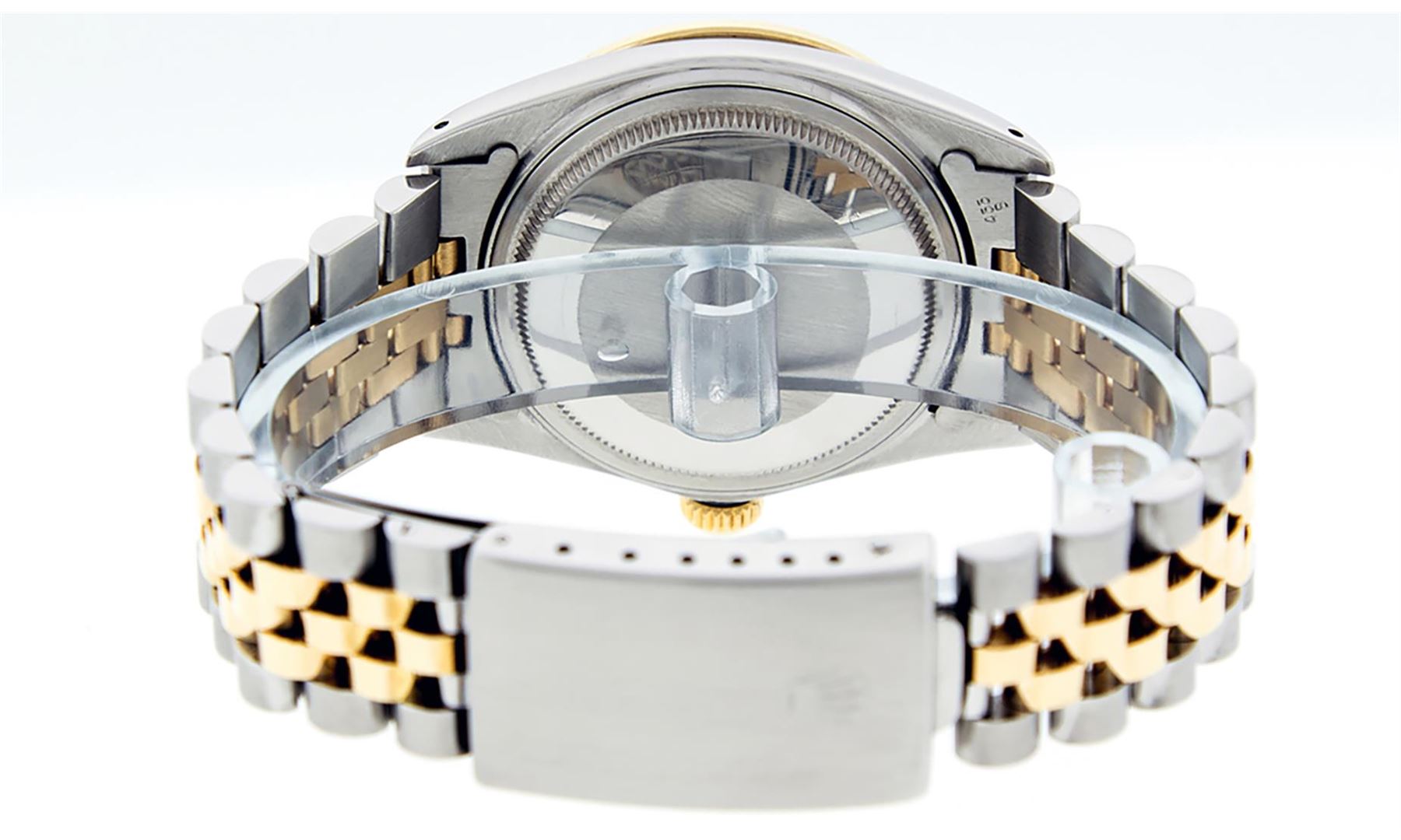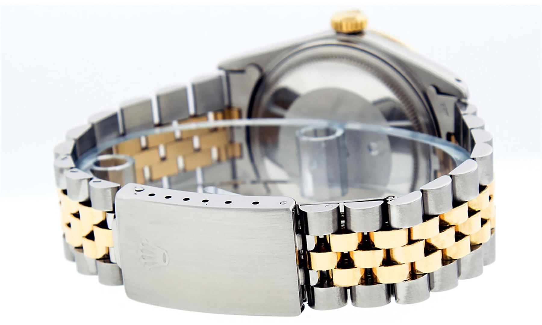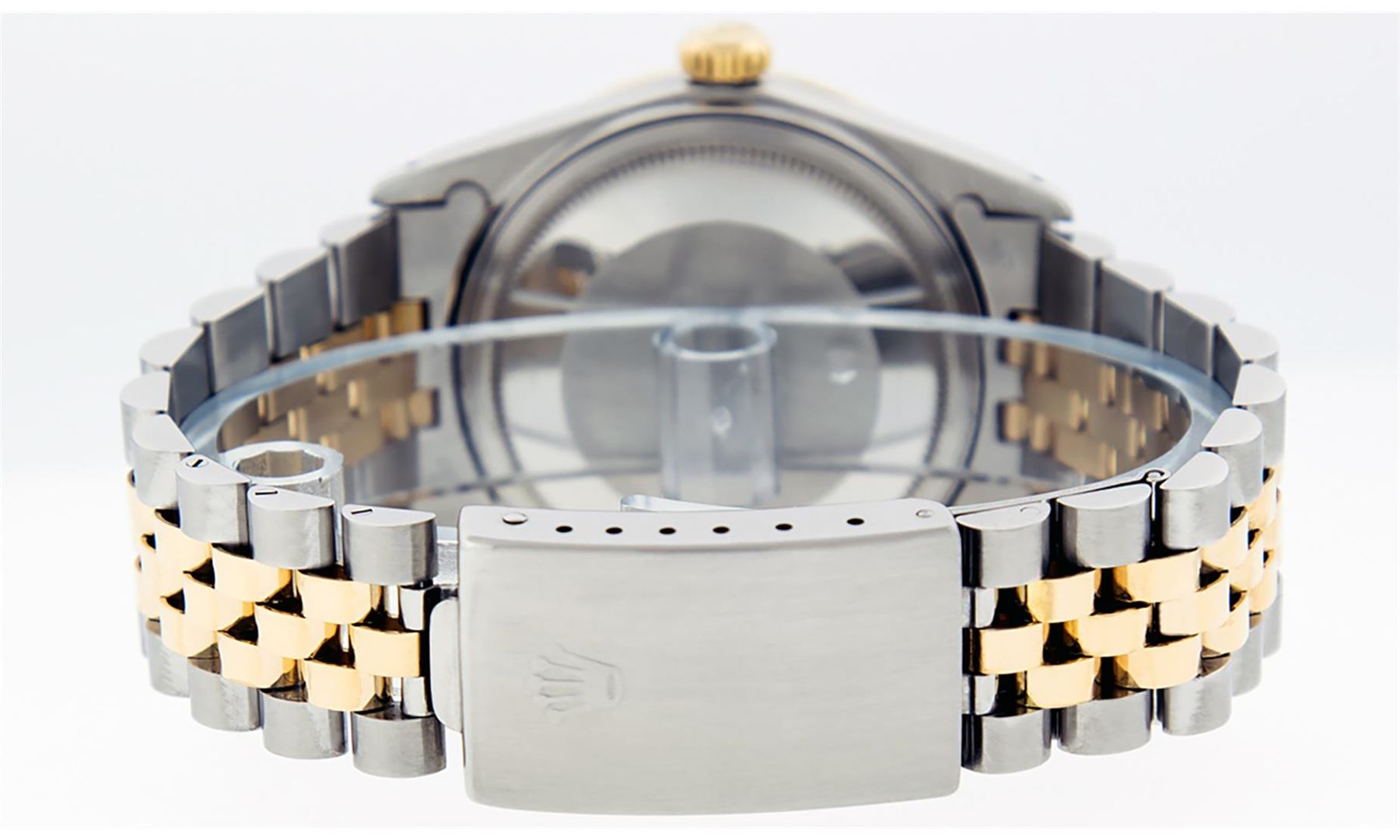 One Mens Yellow Gold Rolex Datejust Polished Bright with Satin Finish, Serviced & Electronically Tested, Stainless Steel Case: 36mm, Custom Diamond Lugs: 28 Diamonds In Lugs, Color: G to H, Clarity: SI-VS. Yellow Gold Crown, Custom Bezel: New 18K Yellow Gold Beadset + Ruby Diamond Bezel, Stone Count: 36 Diamonds + 4 Rubies, Total Weight 1.00 Carat, Clarity: SI-VS, Color: G to H. Custom Crystal: New Scratch Resistant Synthetic Sapphire Cyclops Lens. Custom Hands: New Luminecent Hands. Movement: Automatic Winding Movement . Custom Dial: Mother Of Pearl Ruby String Diamond, Stone Count: 48 Diamonds + 10 Rubies In Dial, Color: G to H, Clarity: VS. Date Window: 3 O'Clock Position Date Display, Quickset, Model: Datejust. Condition: G-6 Extra Fine. Bracelet: Yellow Gold And Stainless Steel Jubilee Band. Bright Polish & Satin Finish. 7.0 Inch Length, Adjustable. Standard Clasp, With Rolex Logo. This Watch Has Been Serviced And Polished It Is Free Of All Scratches And Dents.