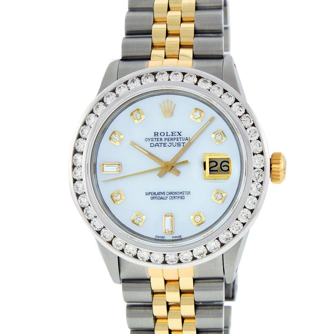 One Mens 14K Yellow Gold Rolex Datejust Polished Bright with Satin Finish, Serviced & Electronically Tested, Stainless Steel Case: 36mm, Yellow Gold Crown, Custom Bezel: New 18K Yellow Gold 3ct Channel Set Diamond Bezel, Diamond Count: 40 Diamonds, Total Weight 3.00 Carat, Clarity: SI-VS, Color: G to H. Custom Crystal: New Scratch Resistant Synthetic Sapphire Cyclops Lens. Custom Hands: New Luminecent Hands. Movement: Automatic Winding Movement Caliber 3035. Custom Dial: Mother Of Pearl Diamond Dial, Diamond Count: 8 Diamonds + 2 Baguette Diamonds In Dial, Color: G to H, Clarity: SI-VS. Date Window: 3 O'Clock Position Date Display, Quickset, Model: 16013 Datejust. Condition: G-6 Extra Fine. Bracelet: 14K Yellow Gold And Stainless Steel Jubilee Band. Bright Polish & Satin Finish. 7.0 Inch Length, Adjustable. Standard Clasp, With Rolex Logo. This Watch Has Been Serviced And Polished It Is Free Of All Scratches And Dents.