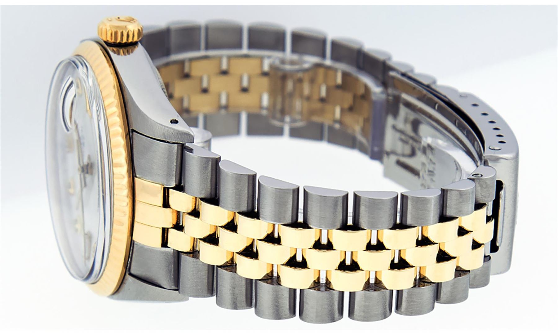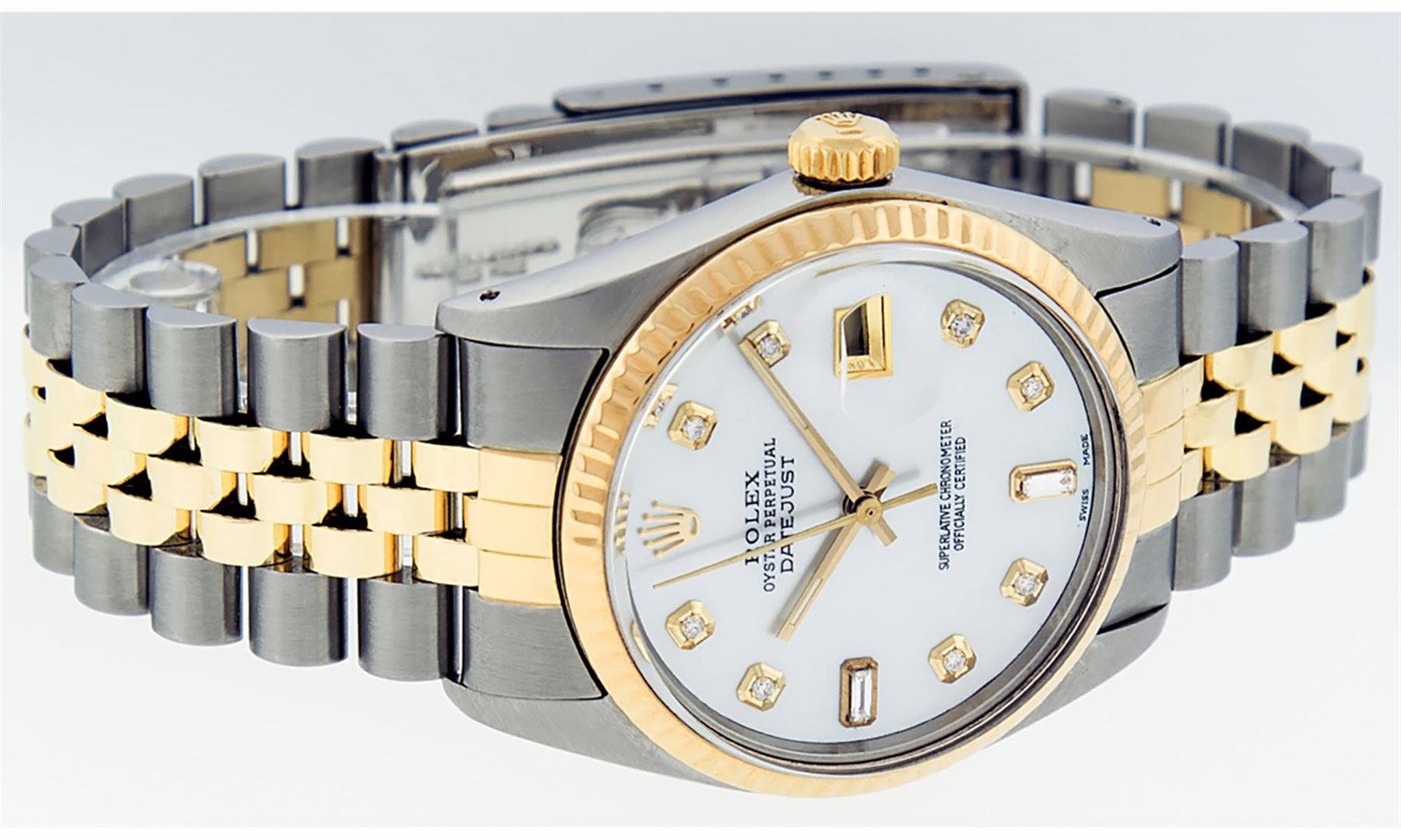 One Mens Pre Owned Yellow Gold Two Tone Rolex Datejust Polished, Serviced & Electronically Tested, Rolex Yellow Gold & Stainless Steel Case: 36mm, Rolex Yellow Gold Crown, Rolex Bezel: Yellow Gold Fluted Bezel. Custom Crystal: New Acrylic Cyclops Lens. Custom Hands: New Luminecent Hands. Rolex Movement: Automatic Winding Movement. Custom Dial: Refinished To Mother Of Pearl With Added Diamonds, Stone Count: 8 Diamonds + 2 Diamond Baguettes in Dial, G To H In Color, SI-VS Clarity. Date Window: 3 O'Clock Position Date Display, Quickset, Model: Datejust. Condition: G-6 Extra Fine. Rolex Bracelet: Two Tone Yellow Gold & Stainless Steel Jubilee Band. Bright Polish. 7.0 Inch Length, Adjustable. Standard Clasp, With Rolex Logo. This Watch Has Been Serviced And Polished It Is Free Of All Scratches And Dents.