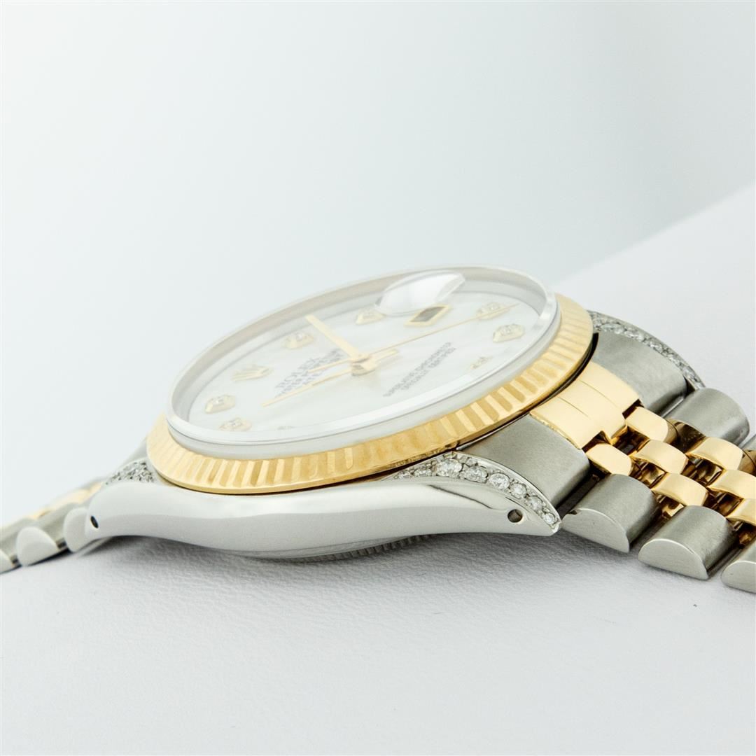 One Mens Pre Owned Yellow Gold Rolex Datejust Polished Bright with Satin Finish, Serviced & Electronically Tested, Stainless Steel Case: 36mm, Custom Diamond Lugs: 28 Diamonds On Lugs, Color: G to H, Clarity: SI-VS. Yellow Gold Crown, Rolex Bezel: Yellow Gold Fluted Bezel. Custom Crystal: New Scratch Resistant Acrylic Cyclops Lens. Custom Hands: New Luminecent Hands. Movement: Automatic Winding Movement. Custom Dial: Dial Refinished To Mother Of Pearl With Custom Added Diamonds, Stone Count: 10 Diamonds On Dial, Color: G to H, Clarity: VS2. Date Window: 3 O'Clock Position Date Display, Quickset, Model: Datejust. Condition: G-6 Extra Fine. Rolex Bracelet: Yellow Gold And Stainless Steel Jubilee Band. Bright Polish & Satin Finish. 7.0 Inch Length, Adjustable. Standard Clasp, With Rolex Logo. This Watch Has Been Serviced And Polished It Is Free Of All Scratches And Dents.