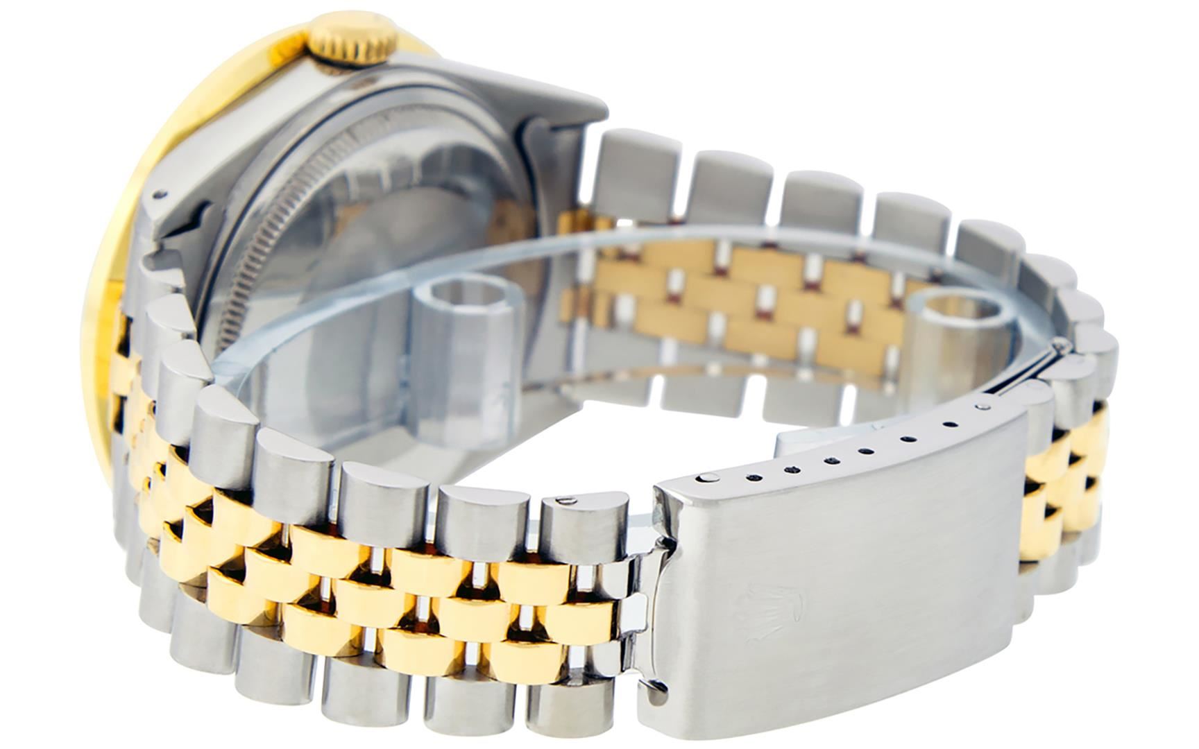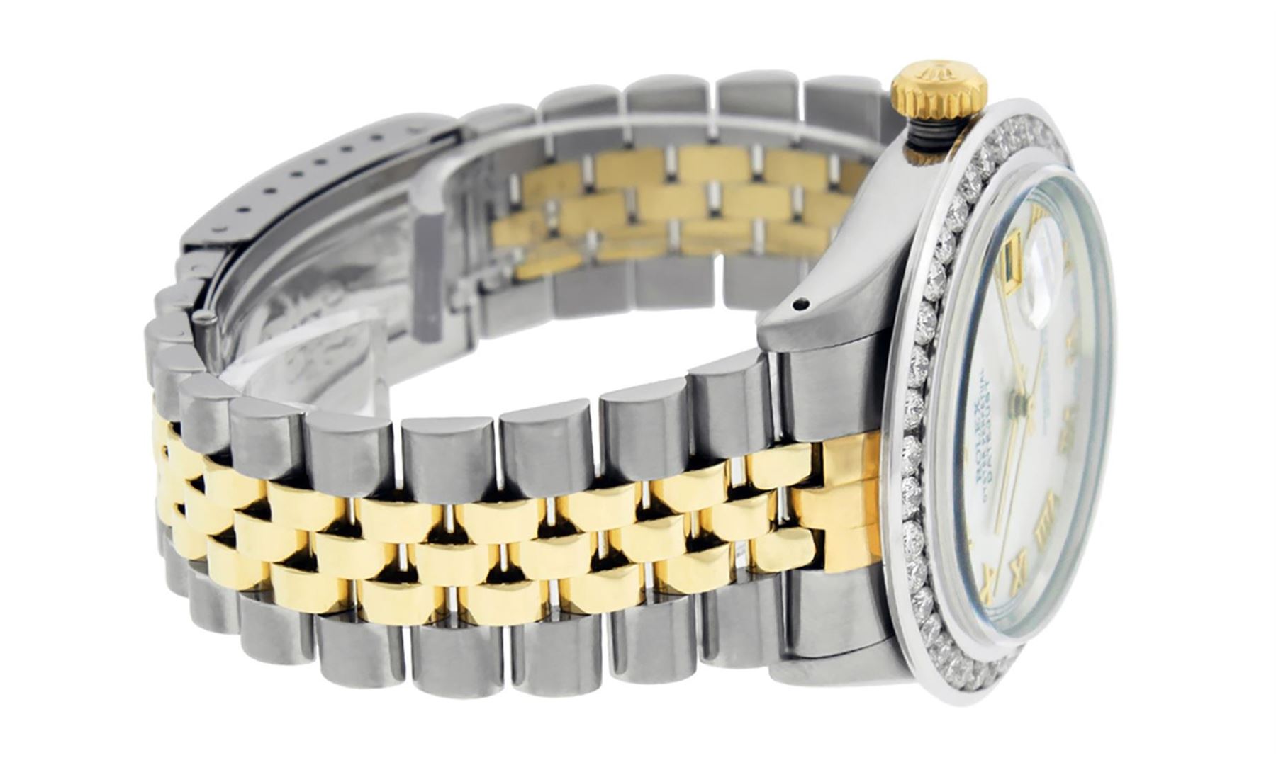 One Mens Pre Owned Yellow Gold and Stainless Steel Rolex Datejust Polished Bright with Satin Finish, Serviced & Electronically Tested, Rolex Stainless Steel Case: 36mm, Rolex Yellow Gold Crown, Custom Bezel: New 18K White Gold 3ct Channel Set Diamond Bezel, Diamond Count: 40 Diamonds, Total Weight 3.00 Carat, Clarity: SI-VS, Color: G to H. Custom Crystal: New Sapphire Magnified Lens. Custom Hands: New Luminecent Hands. Rolex Movement: Automatic Winding Movement. Rolex Dial: Refinished White Roman Dial With Square Track. Date Window: 3 O'Clock Position Date Display, Quickset, Model: Datejust Condition: G-6 Extra Fine. Rolex Bracelet: Yellow Gold And Stainless Steel Jubilee Band. Bright Polish & Satin Finish. 7.0 Inch Length, Adjustable. Standard Clasp, With Rolex Logo. This Watch Has Been Serviced And Polished It Is Free Of All Scratches And Dents.