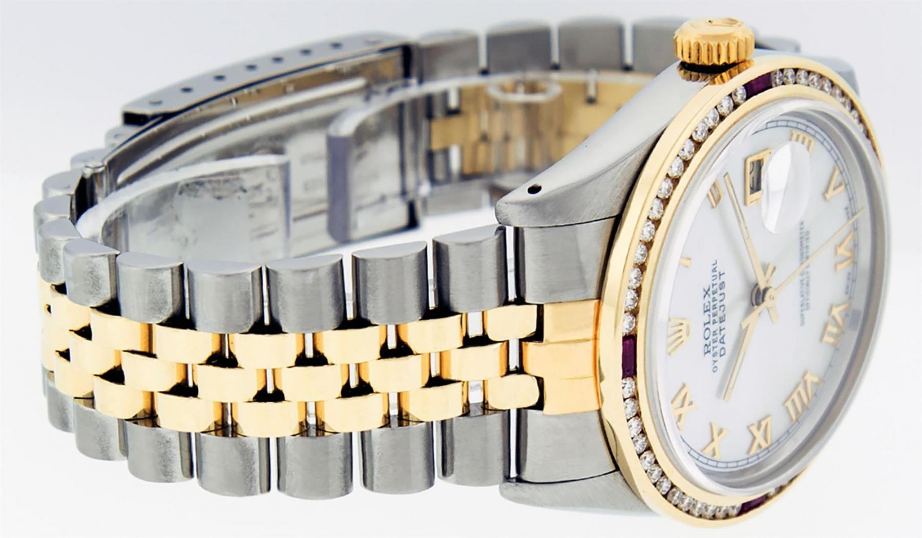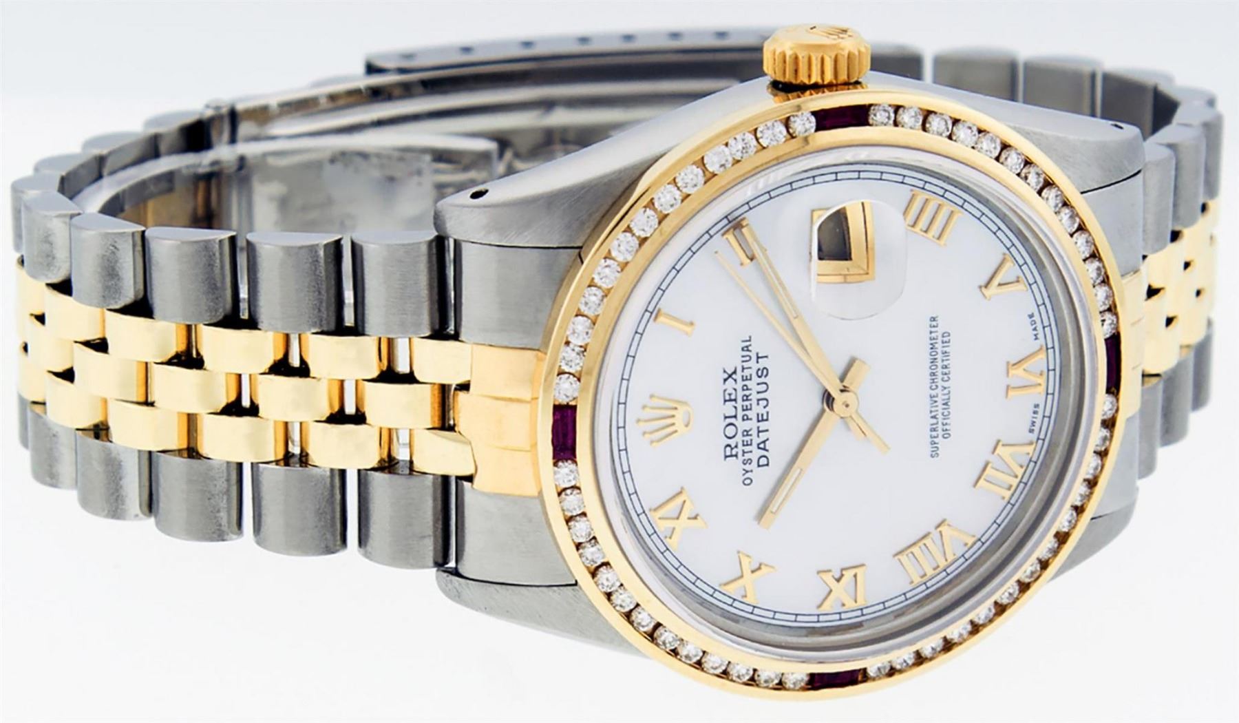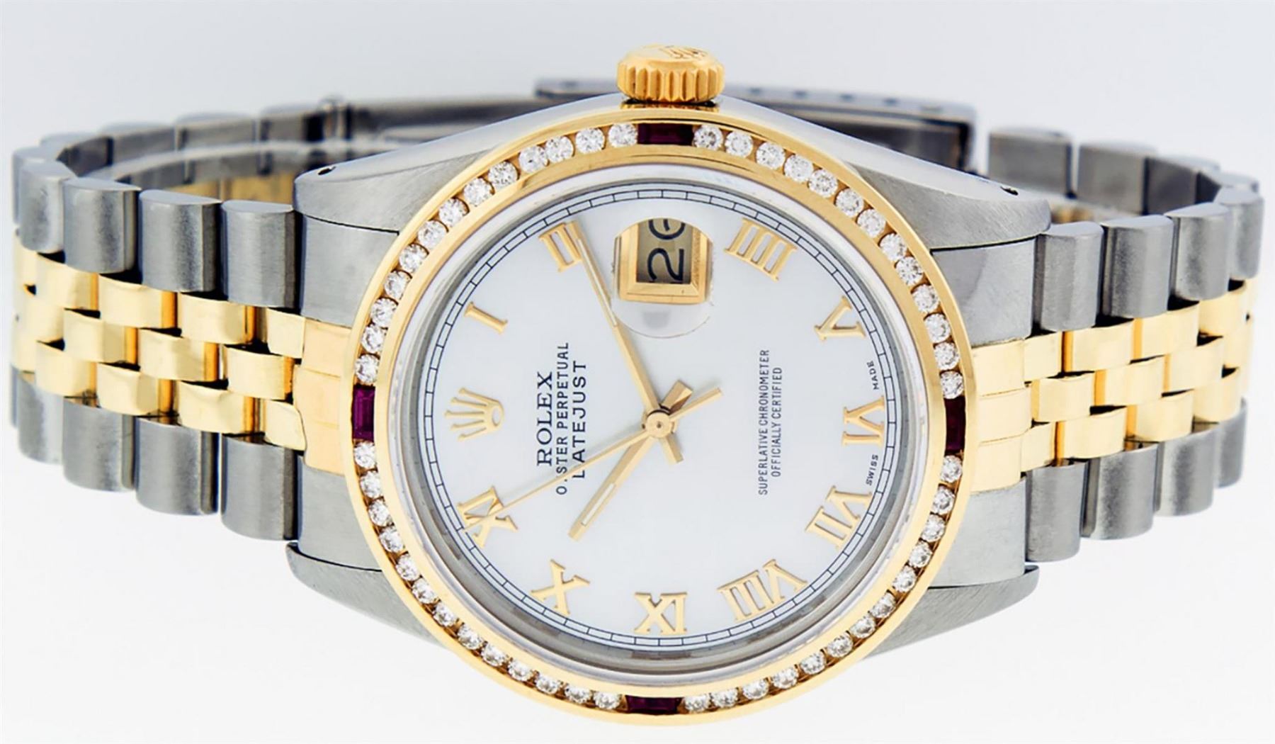 One Mens Yellow Gold Two Tone Rolex Datejust Polished, Serviced & Electronically Tested, Yellow Gold & Stainless Steel Case: 36mm, Yellow Gold Crown, Custom Bezel: 18K Yellow Gold Ruby Channel Set Diamond Bezel, Diamond Count: 52 Diamonds + 4 Rubies, Total Weight 1.30 Carat, Clarity: SI-VS, Color: G to H. Custom Crystal: New Scratch Resistant Synthetic Sapphire Cyclops Lens. Custom Hands: New Luminecent Hands. Movement: Automatic Winding Movement. Custom Dial: Mother Of Pearl Roman With Square Track. Date Window: 3 O'Clock Position Date Display, Quickset, Model: Datejust. Condition: G-6 Extra Fine. Bracelet: Two Tone Yellow Gold & Stainless Steel Jubilee Band. Bright Polish. 7.0 Inch Length, Adjustable. Standard Clasp, With Rolex Logo. This Watch Has Been Serviced Time Tested And Is In Excellent Condition It Is Free Of All Scratches And Dents.