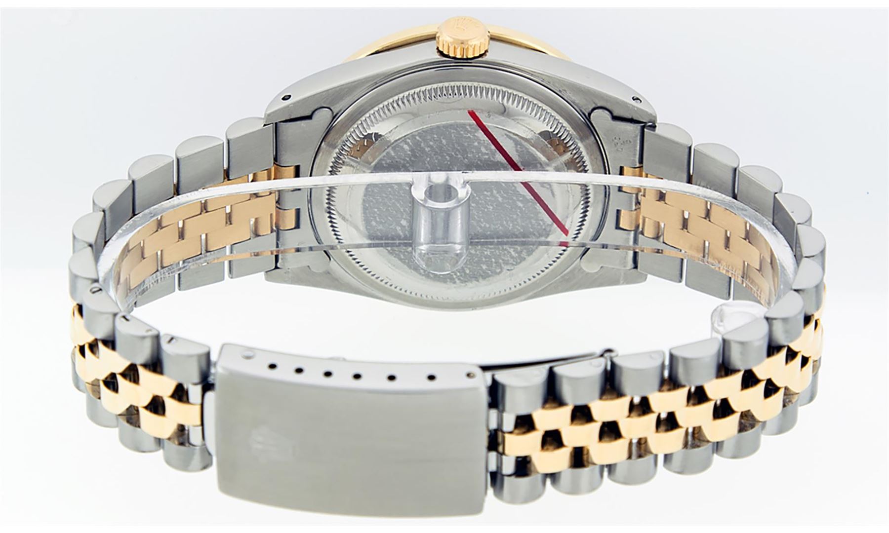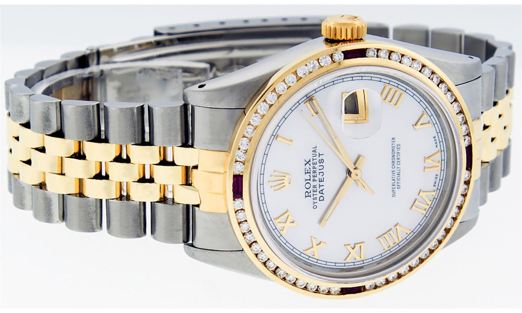One Mens Pre Owned Yellow Gold Two Tone Rolex Datejust Polished, Serviced & Electronically Tested, Yellow Gold & Stainless Steel Case: 36mm, Yellow Gold Crown, Custom Bezel: 18K Yellow Gold Ruby Channel Set Diamond Bezel, Diamond Count: 52 Diamonds + 4 Rubies, Total Weight 1.30 Carat, Clarity: SI-VS, Color: G to H. Custom Crystal: New Sapphire With Date Window. Custom Hands: New Luminescent Hands. Rolex Movement: Automatic Winding Movement. Custom Dial: Mother Of Pearl Roman With Square Track. Date Window: 3 O'clock Position Date Display, Quickset, Model: Datejust. Condition: G-6 Extra Fine. Rolex Bracelet: Two Tone Yellow Gold & Stainless Steel Jubilee Band. Bright Polish. 7.0 Inch Length, Adjustable. Standard Clasp, With Rolex Logo. This Watch Has Been Serviced Time Tested And Is In Excellent Condition It Is Free Of All Scratches And Dents.