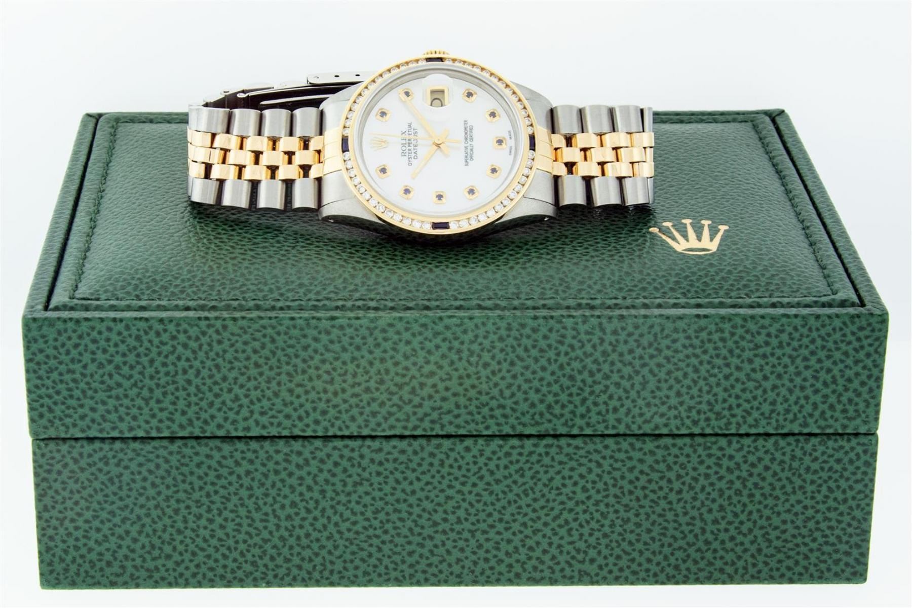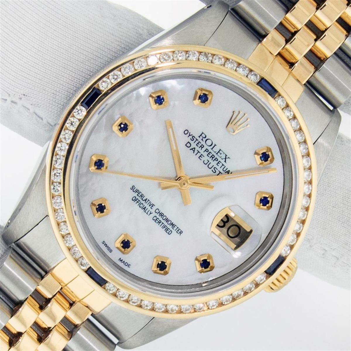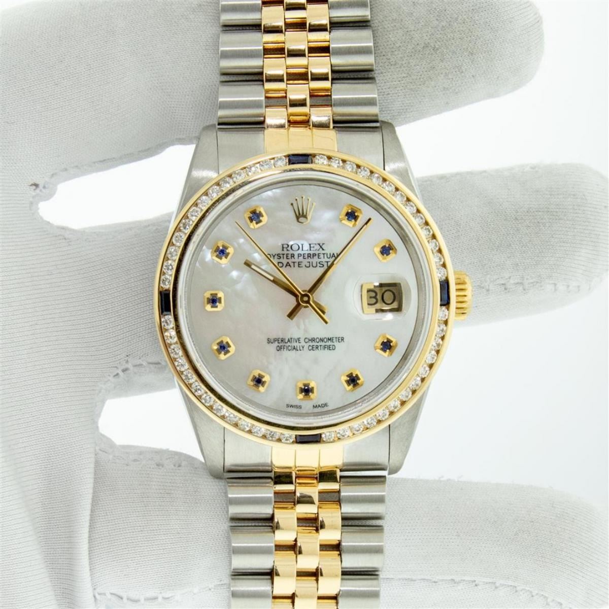 One Mens Yellow Gold Two Tone Rolex Datejust Polished, Serviced & Electronically Tested, Yellow Gold & Stainless Steel Case: 36mm, Yellow Gold Crown, Custom Bezel: 18K Yellow Gold Sapphire Channel Set Diamond Bezel, Diamond Count: 52 Diamonds + 4 Sapphires, Total Weight 1.30 Carat, Clarity: SI-VS, Color: G to H. Custom Crystal: New Synthetic Sapphire Cyclops Lens. Custom Hands: New Hands. Movement: Automatic Winding Movement. Custom Dial: Mother Of Pearl Dial With Sapphire Hour Markers, Stone Count: 10 Sapphires in Dial. Date Window: 3 O'Clock Position Date Display, Quickset, Model: Condition: G-6 Extra Fine. Bracelet: Two Tone Yellow Gold & Stainless Steel Jubilee. Bright Polish. 7.0 Inch Length, Adjustable. Standard Clasp, With Rolex Logo. This Watch Has Been Serviced Time Tested And Is In Excellent Condition It Is Free Of All Scratches And Dents. This Watch Comes With A Rolex Box.