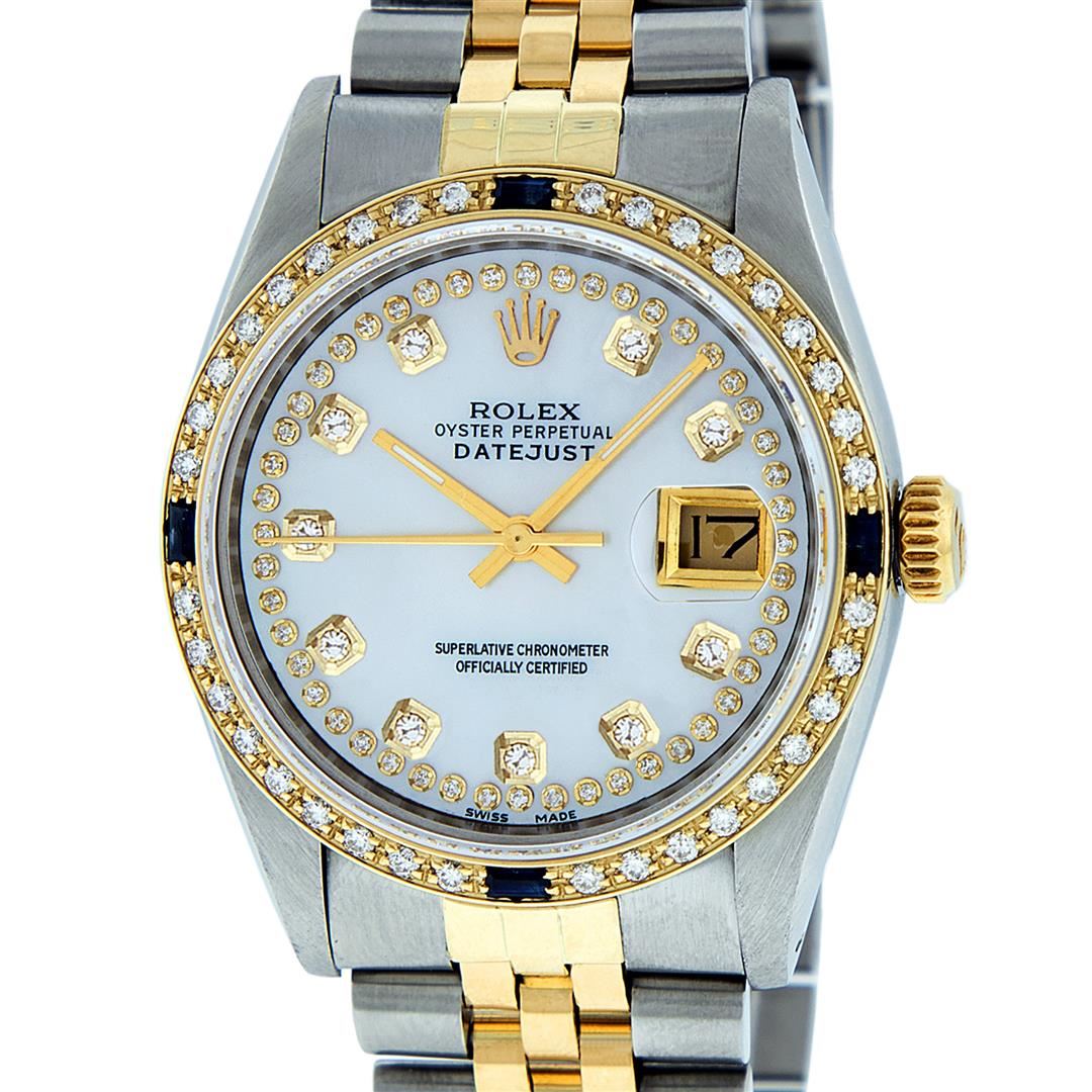 One Mens Pre Owned Yellow Gold Two Tone Rolex Datejust Polished, Serviced & Electronically Tested, Rolex Yellow Gold & Stainless Steel Case: 36mm, Rolex Yellow Gold Crown, Custom Bezel: New 18K Yellow Gold Bead set + Sapphire Diamond Bezel, Diamond Count: 36 Diamonds + 4 Sapphires, Clarity: SI-VS, Color: G to H. Custom Crystal: New Sapphire With Date Window. Rolex Movement: Automatic Winding Movement. Custom Dial: Mother Of String Diamond Dial, Diamond Count: 58 Diamonds, Color: G To H In Color, Clarity: SI-VS, Date Window: 3 O'clock Position Date Display, Quickset, Model: Datejust, Condition: G-6 Extra Fine. Rolex Bracelet: Two Tone Yellow Gold & Stainless Steel Jubilee Band. Bright Polish. 7.0 Inch Length, Adjustable. Standard Clasp, With Rolex Logo. This Watch Has Been Serviced Time Tested And Is In Excellent Condition It Is Free Of All Scratches And Dents.