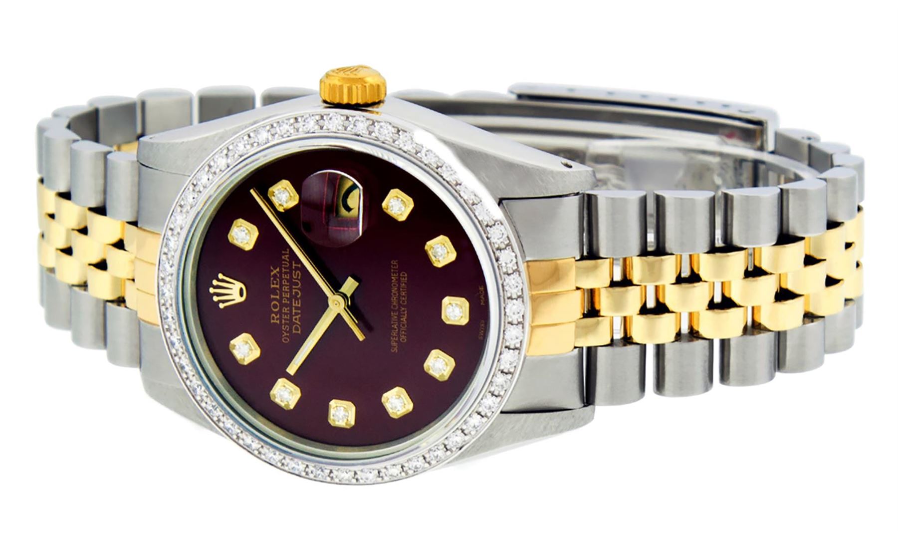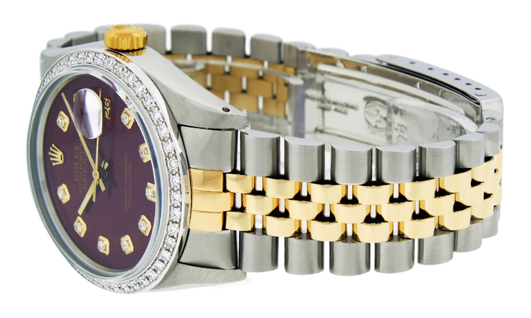 One Mens Pre Owned Yellow Gold Two Tone Rolex Datejust Polished, Serviced & Electronically Tested, Rolex 18K Yellow Gold & Stainless Steel Case: 36mm, Rolex 18K Yellow Gold Crown, Custom Bezel: New 18K White Gold Beadset Diamond Bezel, Diamond Count: 44 Diamonds, Clarity: SI-VS, Color: G to H. Crystal: New Sapphire Magnified Date. Custom Hands: New Luminecent Hands. Rolex Movement: Automatic Winding Movement. Custom Dial: Refinished Maroon With Custom Diamonds, Diamond Count: 10 Diamonds in Dial G To H In Color, Clarity: VS, Date Window: 3 O'Clock Position Date Display, Quickset, Model: Condition: G-6 Extra Fine. Rolex Bracelet: Two Tone Yellow Gold & Stainless Steel Jubilee. Bright Polish. 7.0 Inch Length, Adjustable. Standard Clasp, With Rolex Logo. This Watch Has Been Serviced Time Tested And Is In Excellent Condition It Is Free Of All Scratches And Dents.