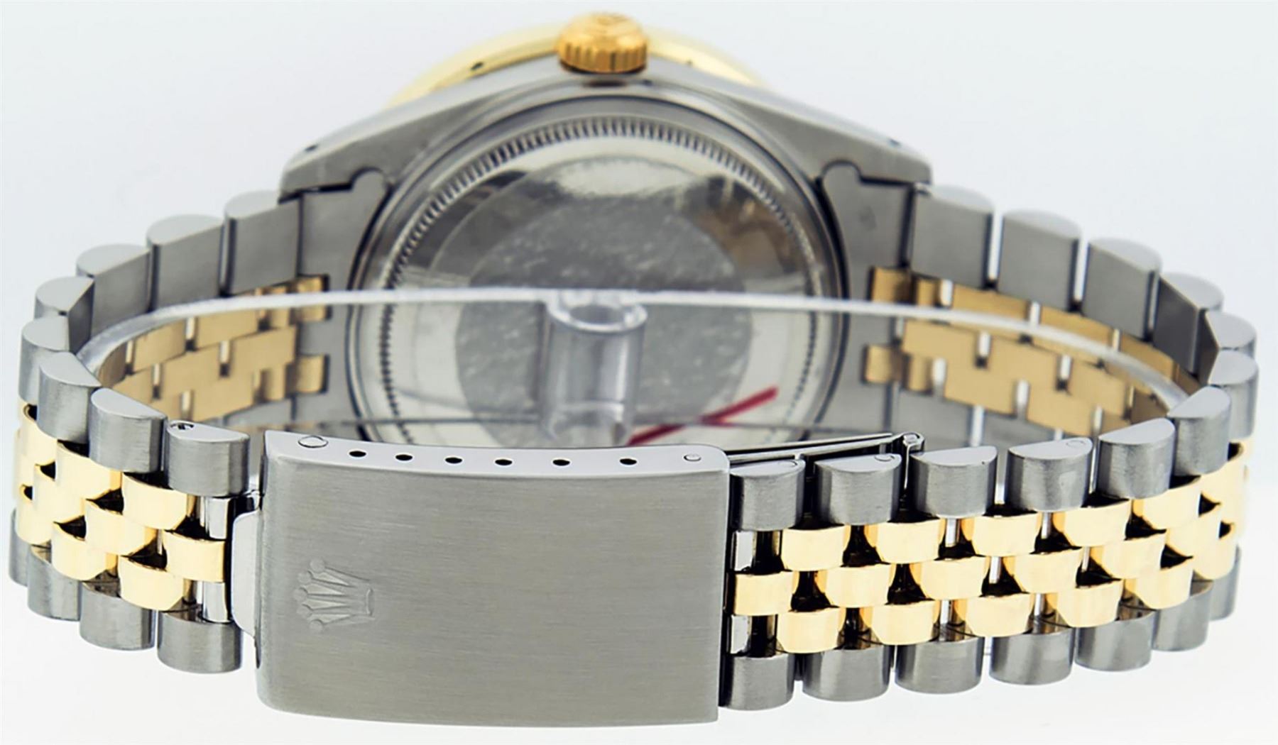 One Mens Yellow Gold Rolex Datejust Polished Bright with Satin Finish, Serviced & Electronically Tested, Stainless Steel Case: 36mm, Yellow Gold Crown, Custom Bezel: New 18K Yellow Gold 3ct Channel Set Diamond Bezel, Diamond Count: 40 Diamonds In Bezel, Total Weight 3.00 Carat, Clarity: SI-VS, Color: G to H. Custom Crystal: New Scratch Resistent Synthetic Sapphire Cyclops Lens. Custom Hands: New Luminecent Hands. Movement: Automatic Winding Movement. Custom Dial: Maroon Single Cut Diamond Dial, Diamond Count: 10 Diamonds In Dial, Color: G to H, Clarity: VS. Date Window: 3 O'Clock Position Date Display, Quickset, Model: Datejust. Condition: G-6 Extra Fine. Bracelet: Yellow Gold And Stainless Steel Jubilee Band. Bright Polish & Satin Finish. 7.0 Inch Length, Adjustable. Standard Clasp, With Rolex Logo. This Watch Has Been Serviced And Polished It Is Free Of All Scratches And Dents.