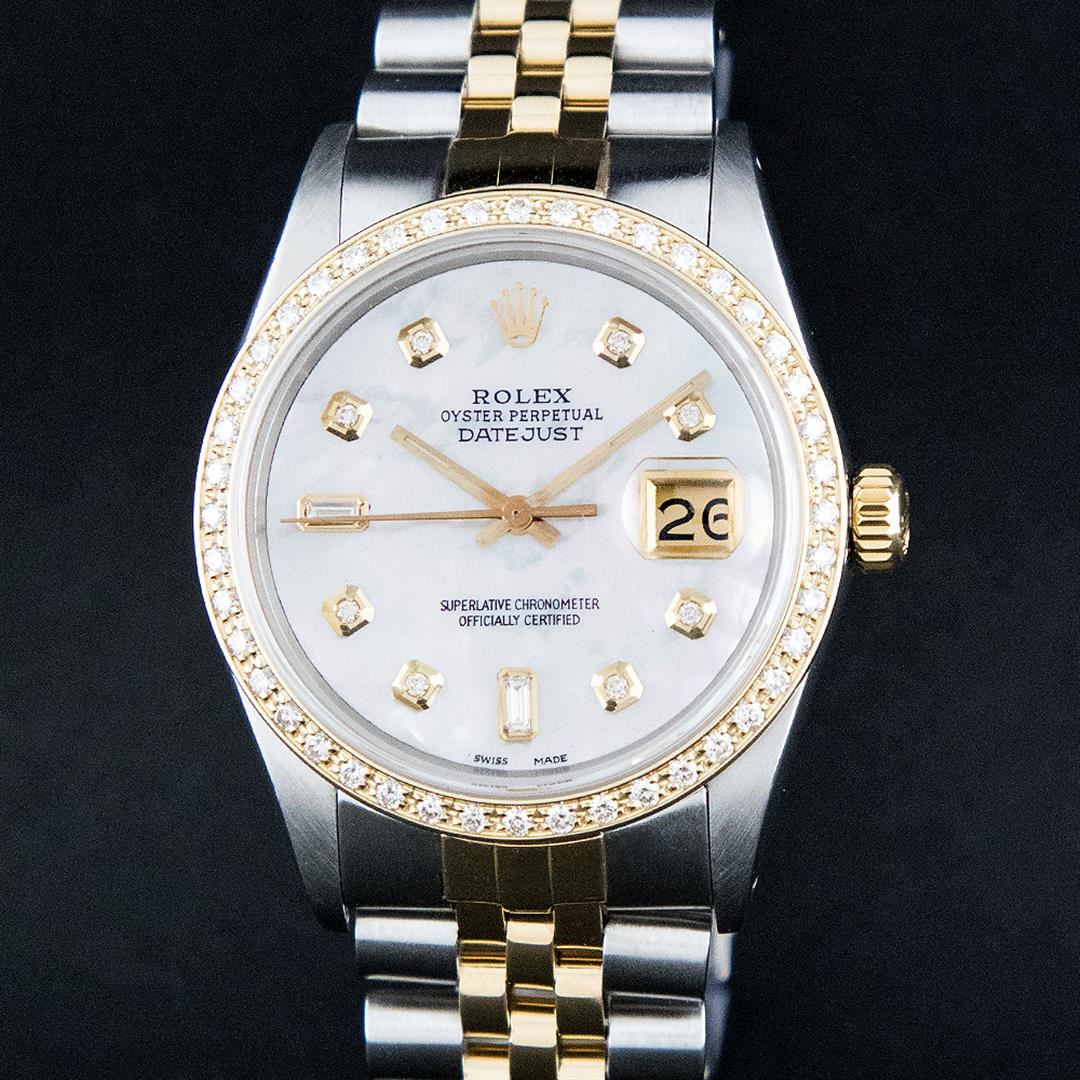 One Mens Pre Owned Yellow Gold Two Tone Rolex Datejust Polished, Serviced & Electronically Tested, Rolex Yellow Gold & Stainless Steel Case: 36mm, Yellow Gold Crown, Custom Bezel: New 18K Yellow Gold Beadset Diamond Bezel, Diamond Count: 44 Diamonds, Clarity: SI-VS, Color: G to H. Custom Crystal: New Sapphire Magnified Date. Rolex Movement: Automatic Winding Movement. Custom Dial: Mother Of Pearl Diamond Dial with 2 Baguette Hour Markers, Diamond Count: 8 Diamonds + 2 Baguette Diamond Hour Markers, Color: G To H In Color, Clarity: SI-VS, Date Window: 3 O'Clock Position Date Display, Quickset, Model: Datejust. Condition: G-6 Extra Fine. Rolex Bracelet: Two Tone Yellow Gold & Stainless Steel Jubilee. Bright Polish. 7.0 Inch Length, Adjustable. Standard Clasp, With Rolex Logo. This Watch Has Been Serviced Time Tested And Is In Excellent Condition It Is Free Of All Scratches And Dents.