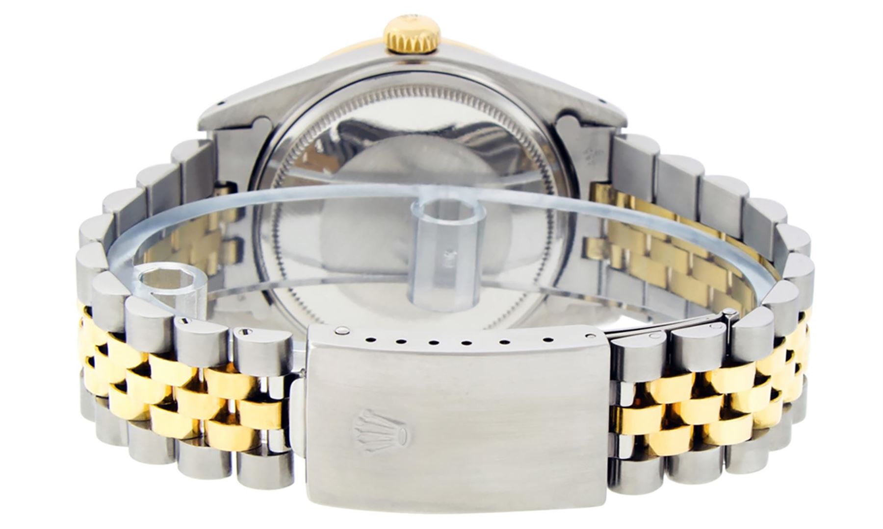 One Mens Yellow Gold Two Tone Rolex Datejust Polished, Serviced & Electronically Tested, Yellow Gold & Stainless Steel Case: 36mm, Yellow Gold Crown, Bezel: Yellow Gold Fluted Bezel. Custom Crystal: New Acrylic Cyclops Lens. Custom Hands: New Luminecent Hands. Movement: Automatic Winding Movement . Custom Dial: Mother Of Pearl Diamond Dial, Stone Count: 8 Diamonds + 2 Synthetic Emerald Baguettes in Dial, G To H In Color, SI-VS Clarity. Date Window: 3 O'Clock Position Date Display, Quickset, Model: Datejust. Condition: G-6 Extra Fine. Bracelet: Two Tone Yellow Gold & Stainless Steel Jubilee. Bright Polish. 7.0 Inch Length, Adjustable. Standard Clasp, With Rolex Logo. This Watch Has Been Serviced And Polished It Is Free Of All Scratches And Dents.