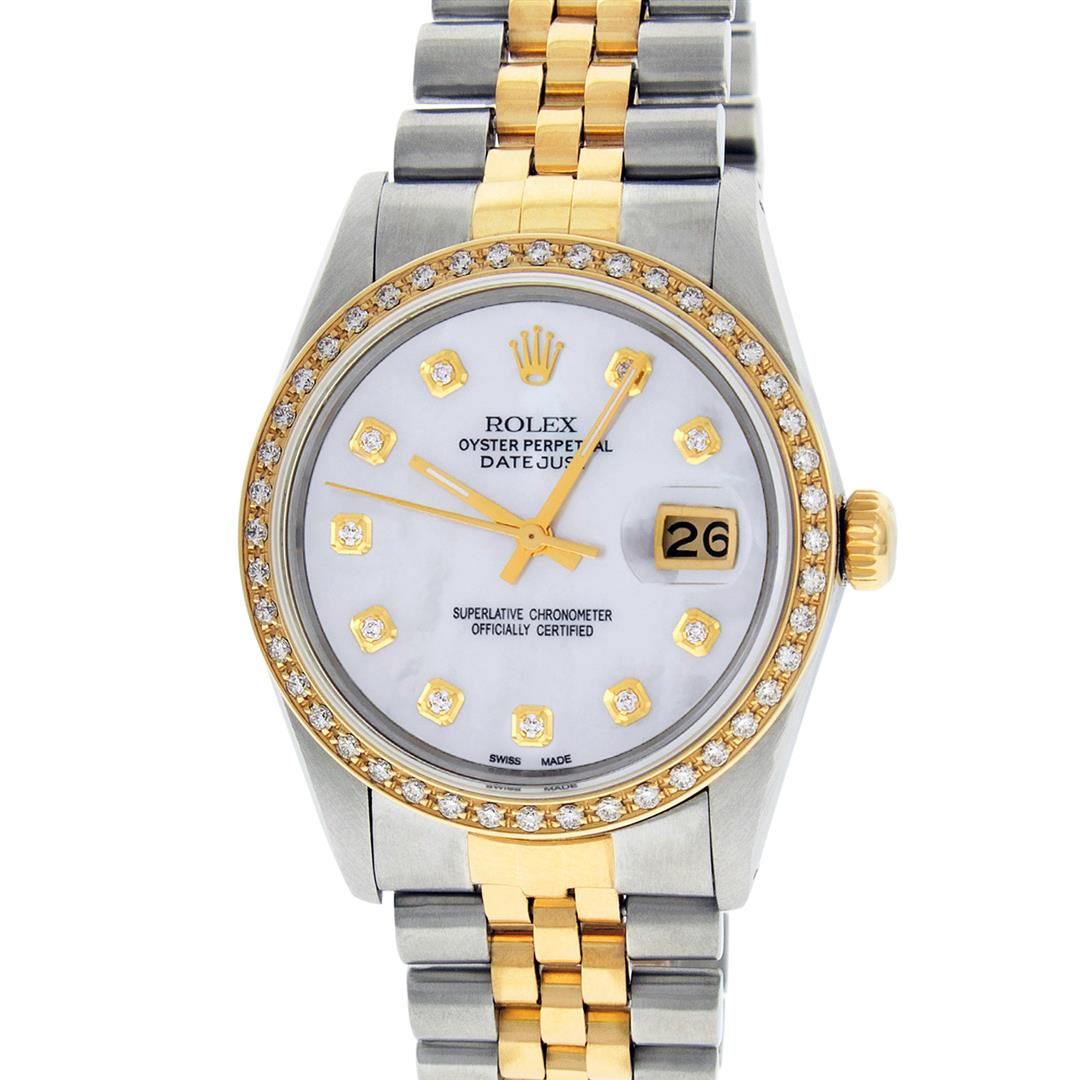One Mens Yellow Gold Two Tone Rolex Datejust Polished, Serviced & Electronically Tested, Yellow Gold & Stainless Steel Case: 36mm, Yellow Gold Crown, Custom Bezel: New 18K Yellow Gold Beadset Diamond Bezel, Diamond Count: 44 Diamonds In Bezel, Total Weight 1.00 Carat, Clarity: SI-VS, Color: G to H. Custom Crystal: New Scratch Resistant Synthetic Sapphire Cyclops Lens. Custom Hands: New Luminecent Hands. Movement: Automatic Winding Movement. Custom Dial: Mother Of Pearl With Diamond Hour Markers. Diamond Count: 10 Diamonds In Dial, Clarity: SI-VS, Color: Color G to H Date Window: 3 O'Clock Position Date Display, Quickset, Model: Datejust. Condition: G-6 Extra Fine. Bracelet: Two Tone Yellow Gold & Stainless Steel Jubilee Band. Bright Polish. 7.0 Inch Length, Adjustable. Standard Clasp, With Rolex Logo. This Watch Has Been Serviced Time Tested And Is In Excellent Condition It Is Free Of All Scratches And Dents.