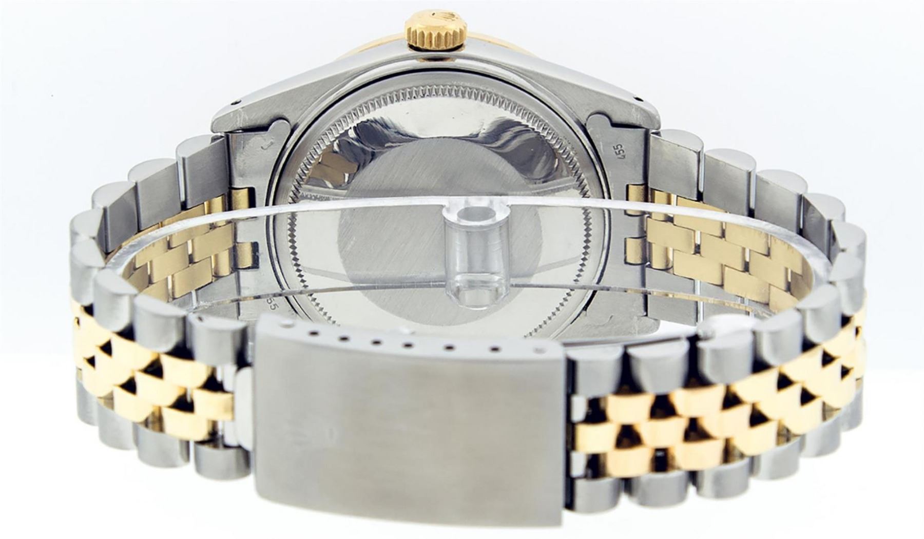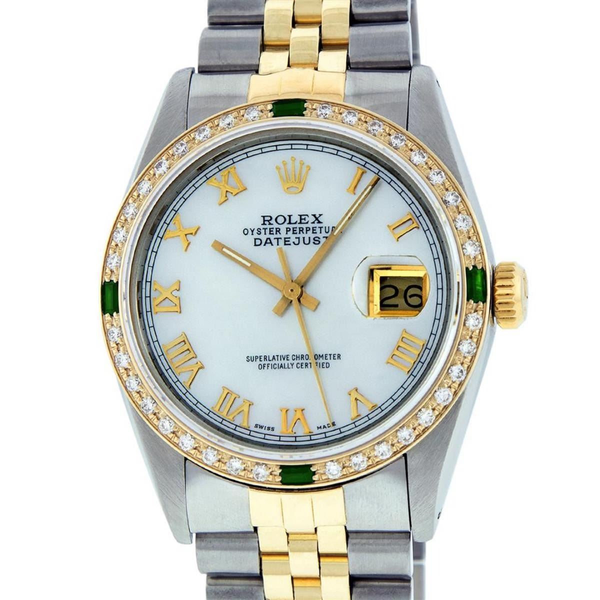 One Mens Pre Owned Yellow Gold Two Tone Rolex Datejust Polished, Serviced & Electronically Tested, Yellow Gold & Stainless Steel Case: 36mm, Yellow Gold Crown, Custom Bezel: New 18K Yellow Gold Beadset & Emerald Diamond Bezel, Stone Count: 36 Diamonds + 4