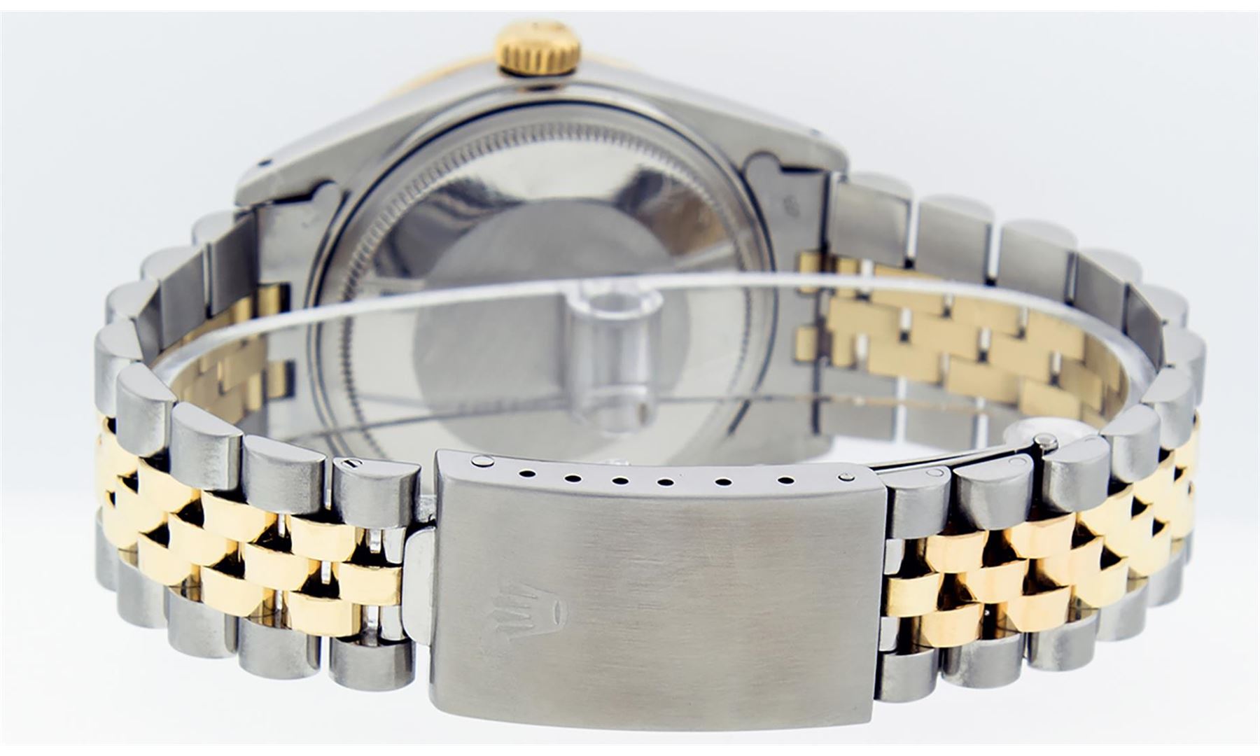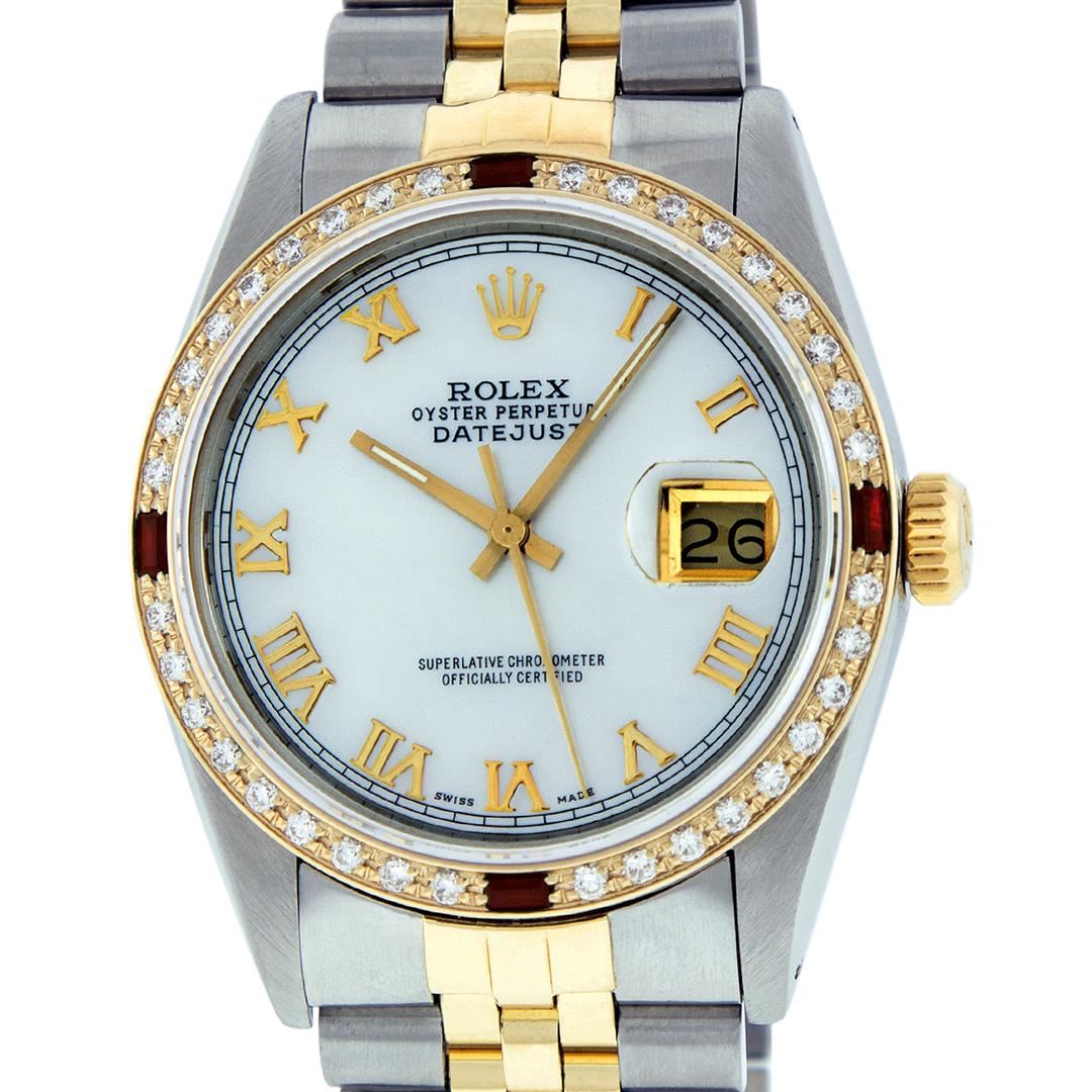 One Mens Yellow Gold Two Tone Rolex Datejust Polished, Serviced & Electronically Tested, Yellow Gold & Stainless Steel Case: 36mm, Yellow Gold Crown, Custom Bezel: New 18K Yellow Gold Beadset & Ruby Diamond Bezel, Stone Count: 36 Diamonds + 4 Rubies, Total Weight 1.00 Carat, Clarity: SI-VS, Color: G to H. Custom Crystal: New Scratch Resistant Synthetic Sapphire Cyclops Lens. Custom Hands: New Luminecent Hands. Movement: Automatic Winding Movement. Custom Dial: Mother Of Pearl Roman Dial With Square Track. Date Window: 3 O'Clock Position Date Display, Quickset, Model: Datejust. Condition: G-6 Extra Fine. Bracelet: Two Tone Yellow Gold & Stainless Steel Jubilee. Bright Polish. 7.0 Inch Length, Adjustable. Standard Clasp, With Rolex Logo. This Watch Has Been Serviced Time Tested And Is In Excellent Condition It Is Free Of All Scratches And Dents.