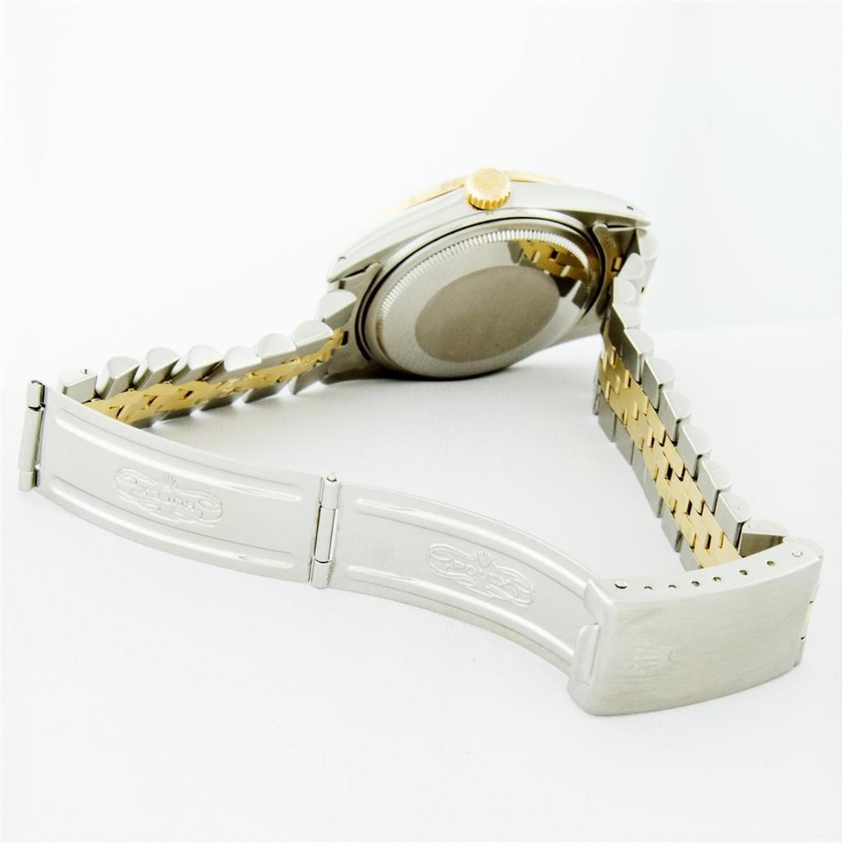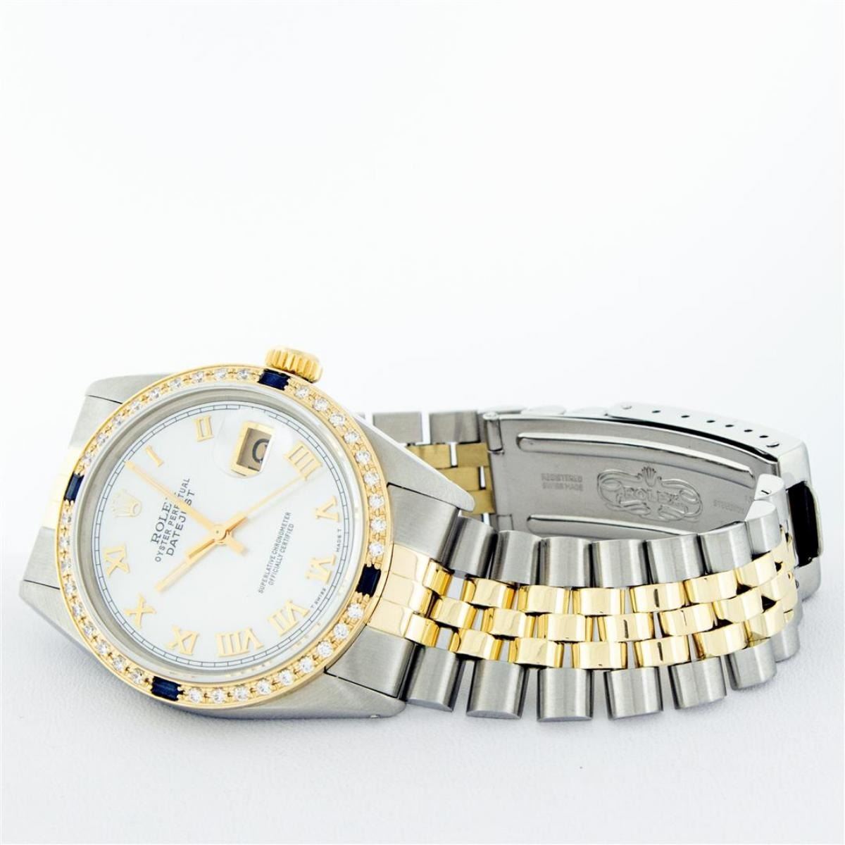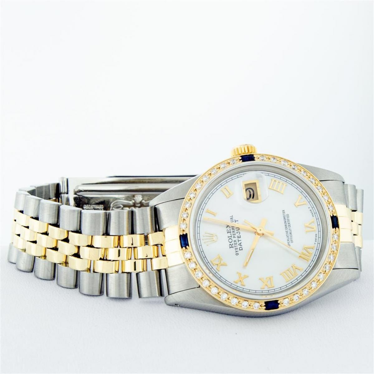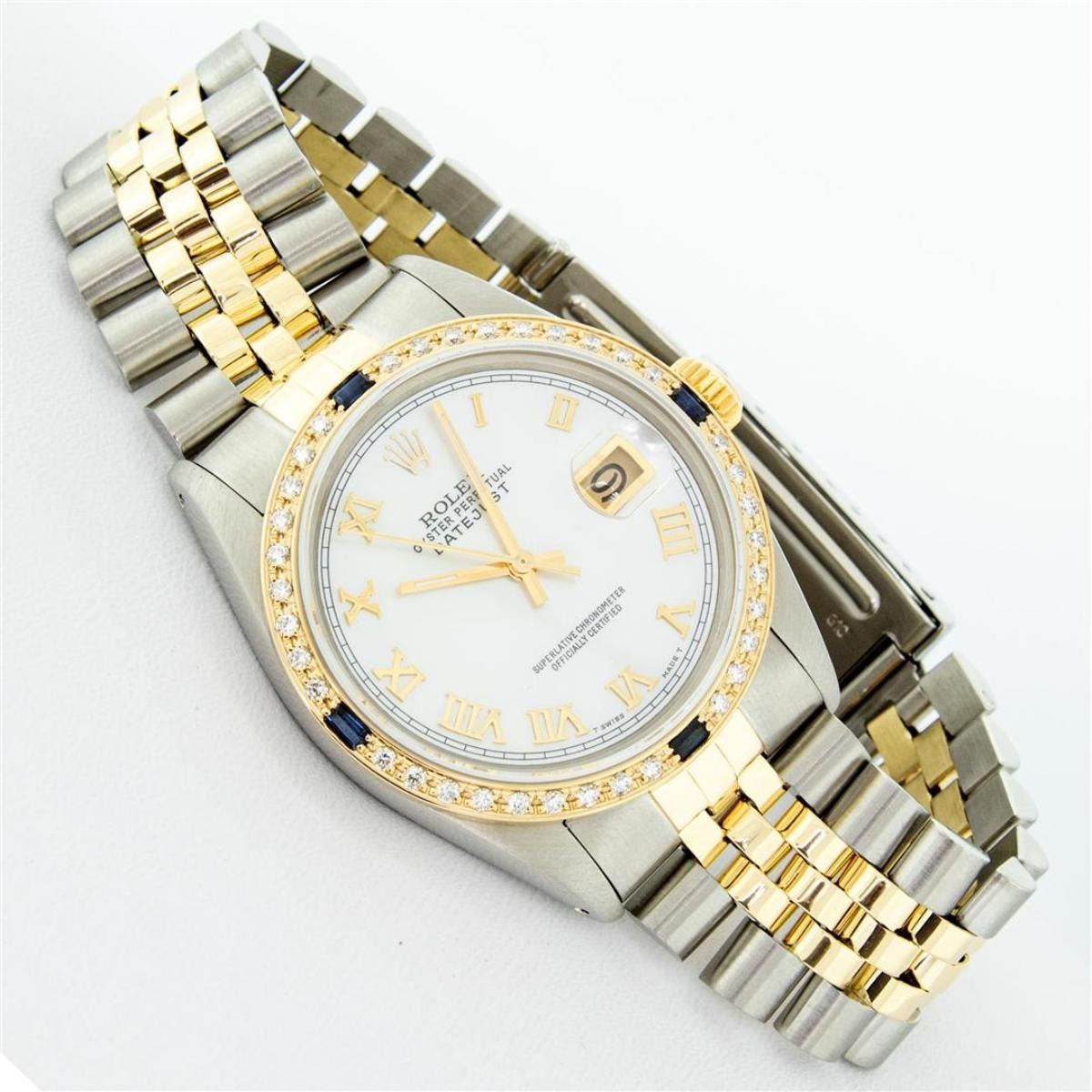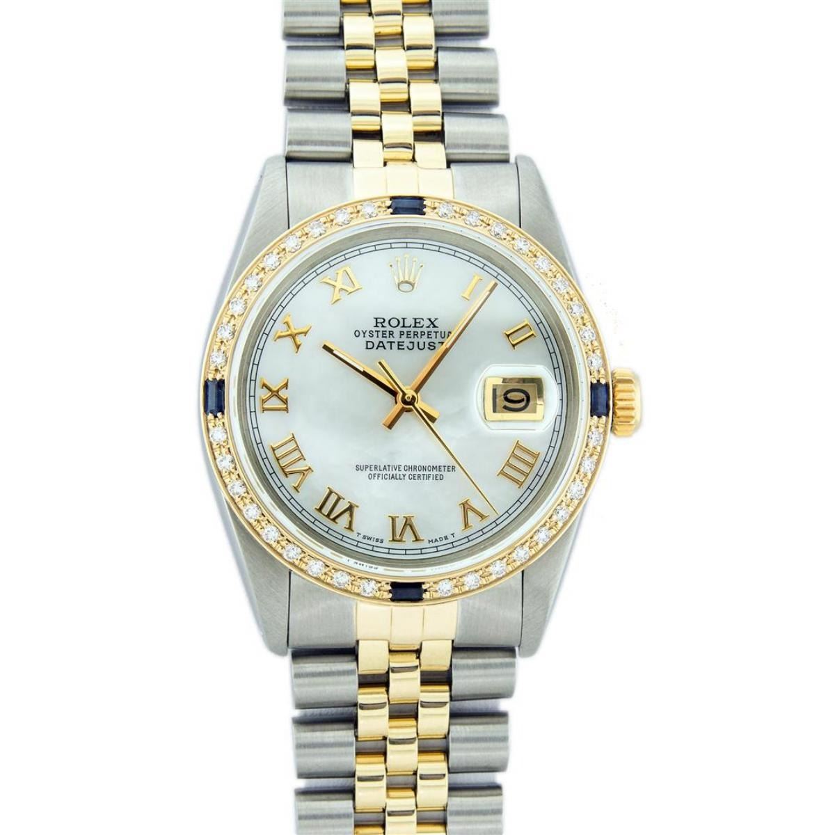One Mens Yellow Gold Two Tone Rolex Datejust Polished, Serviced & Electronically Tested, Yellow Gold & Stainless Steel Case: 36mm, Yellow Gold Crown, Custom Bezel: 18K Yellow Gold Beadset & Sapphire Diamond Bezel, Stone Count: 36 Diamonds + 4 Sapphires, Total Weight 1.00 Carat, Clarity: SI-VS, Color: G to H. Custom Crystal: New Scratch Resistant Synthetic Sapphire Cyclops Lens. Custom Hands: New Luminecent Hands. Movement: Automatic Winding Movement. Custom Dial: Mother Of Pearl Roman Dial With Square Track. Date Window: 3 O'Clock Position Date Display, Quickset, Model: Datejust. Condition: G-6 Extra Fine. Bracelet: Two Tone Yellow Gold & Stainless Steel Jubilee Band. Bright Polish. 7.0 Inch Length, Adjustable. Standard Clasp, With Rolex Logo. This Watch Has Been Serviced Time Tested And Is In Excellent Condition It Is Free Of All Scratches And Dents.