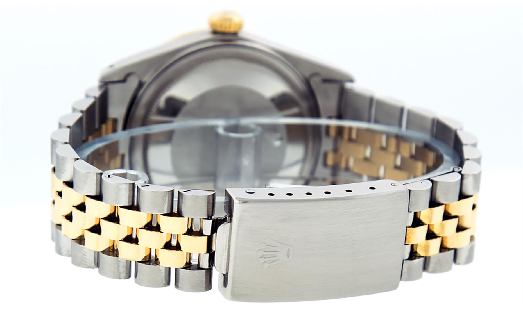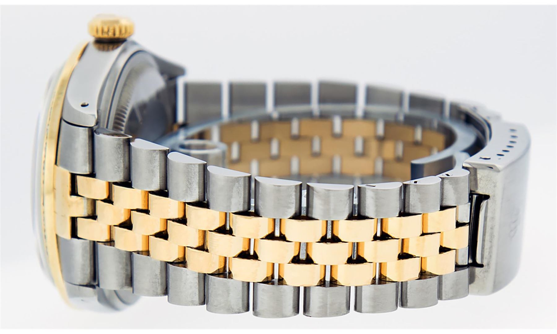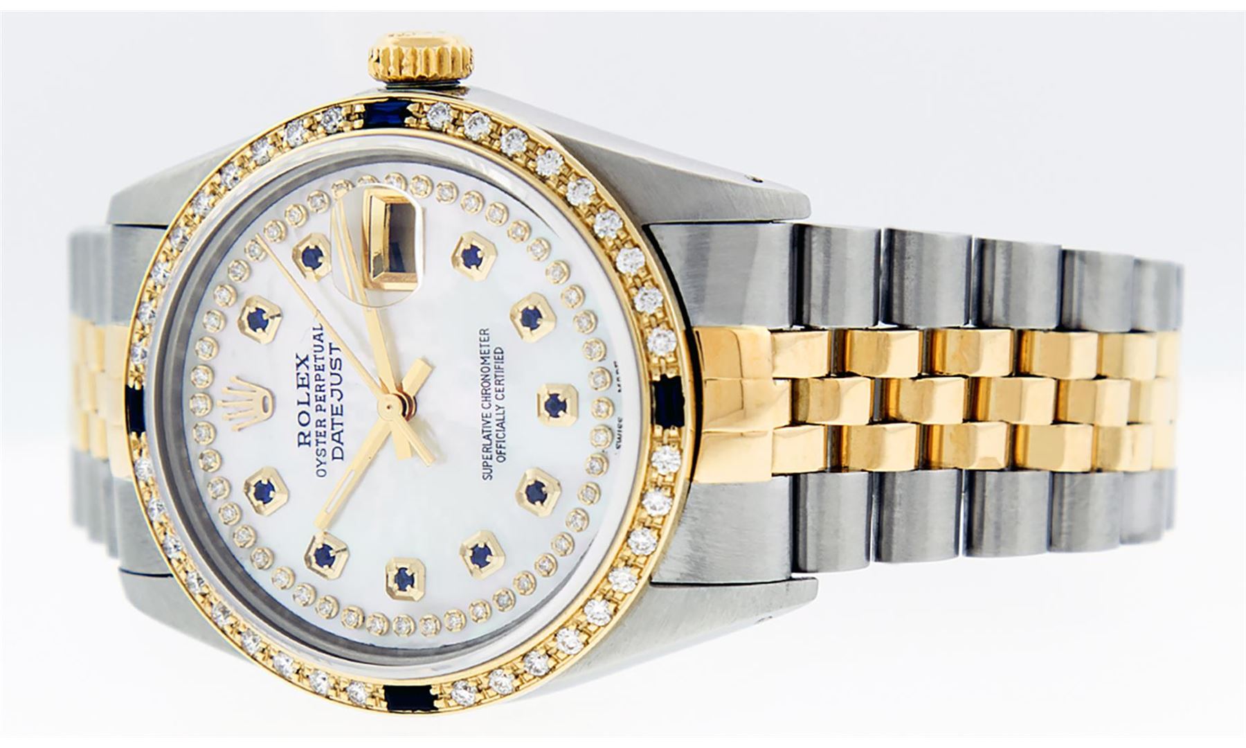 One Mens Pre Owned Yellow Gold Two Tone Rolex Datejust Polished, Serviced & Electronically Tested, Rolex Yellow Gold & Stainless Steel Case: 36mm, Rolex Yellow Gold Crown, Custom Bezel: New 18K Yellow Gold Sapphire Bead set Diamond Bezel, Diamond Count: 3