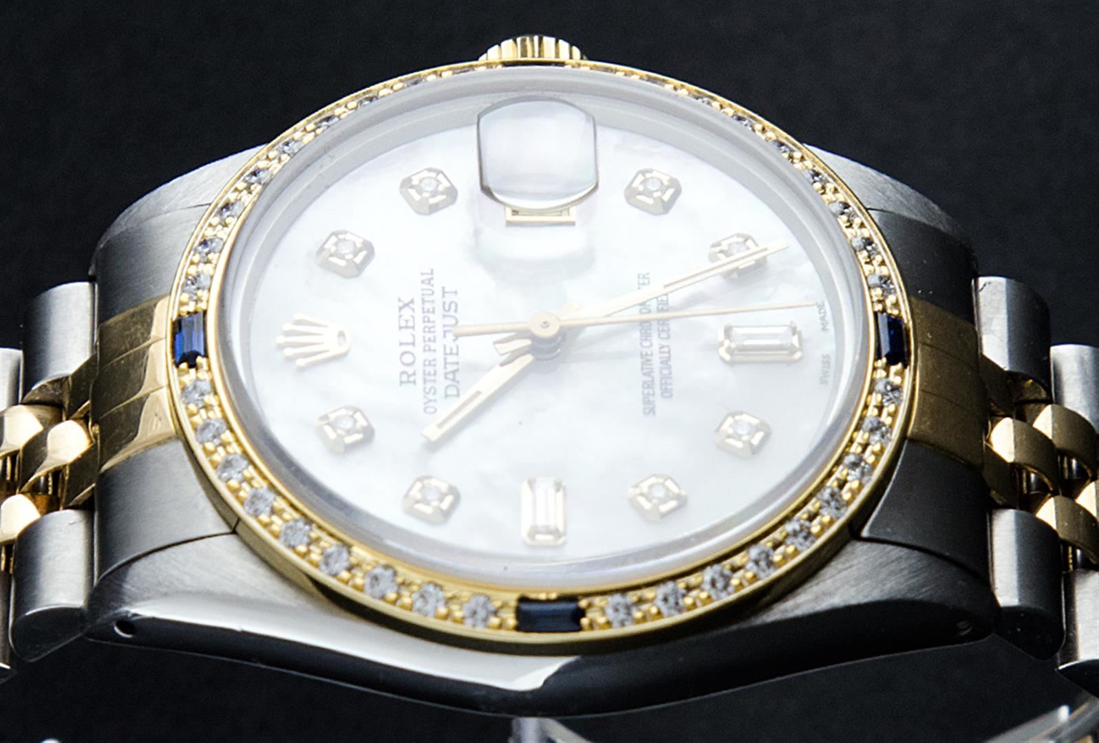 One Mens Pre Owned Yellow Gold Two Tone Rolex Datejust Polished, Serviced & Electronically Tested, Rolex Case: Yellow Gold & Stainless Steel Case:36mm, Yellow Gold Crown, Custom Bezel: New 18K Yellow Gold Sapphire Beadset Diamond Bezel, Diamond Count: 36 Diamonds + 4 Sapphires Total Weight 1.00 Carat, Clarity: SI-VS, Color: G to H. Custom Crystal: New Sapphire Cyclops Lens. Rolex Movement: Automatic Winding Movement. Custom Dial: Mother Of Pearl Dial Set With Diamond Hour Markers and Baguette Markers On 6 and 9, Diamond Count: 8 + 2 Baguette Diamonds in Dial G To H In Color , Date Window: 3 O'Clock Position Date Display, Quickset, Model: Condition: G-6 Extra Fine. Rolex Bracelet: Two Tone Yellow Gold & Stainless Steel Jubilee. Bright Polish. 7.0 Inch Length, Adjustable. Standard Clasp, With Rolex Logo. This Watch Has Been Serviced Time Tested And Is In Excellent Condition It Is Free Of All Scratches And Dents.