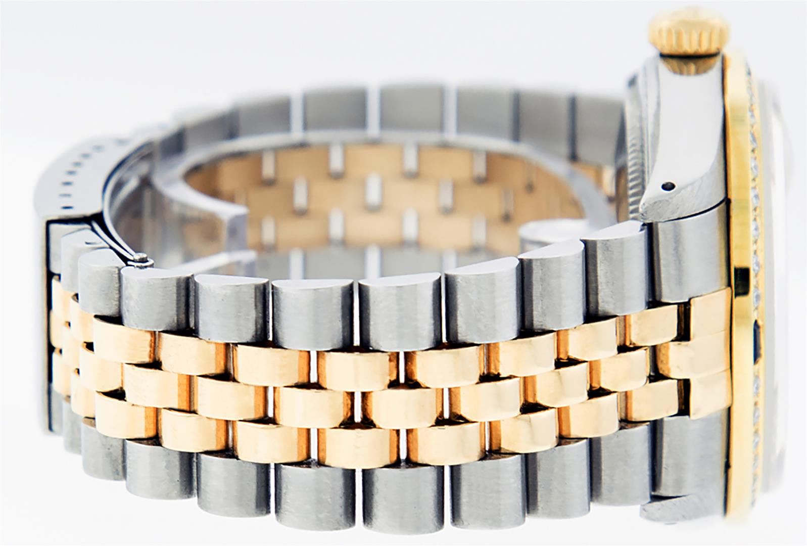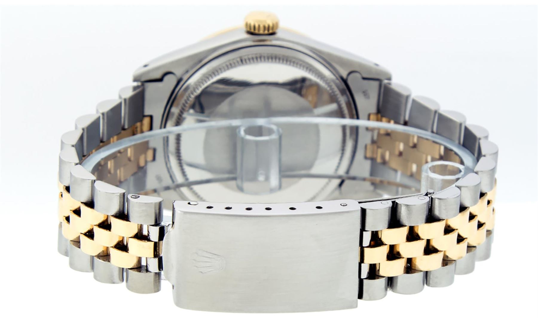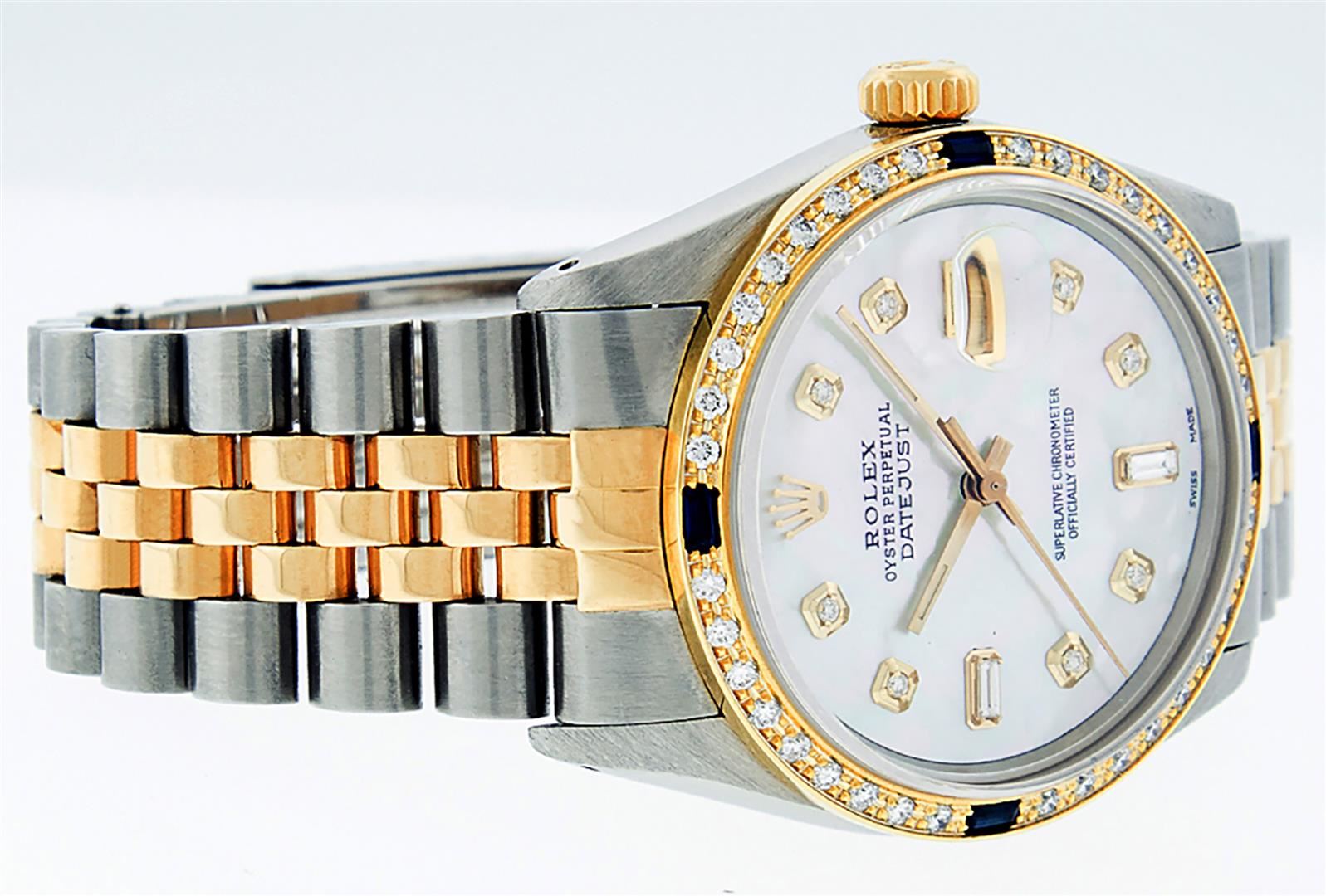 One Mens Pre Owned Yellow Gold Two Tone Rolex Datejust Polished, Serviced & Electronically Tested, Rolex Case: Yellow Gold & Stainless Steel Case:36mm, Yellow Gold Crown, Custom Bezel: New 18K Yellow Gold Sapphire Beadset Diamond Bezel, Diamond Count: 36 Diamonds + 4 Sapphires, Clarity: SI-VS, Color: G to H. Custom Crystal: New Sapphire Cyclops Lens. Rolex Movement: Automatic Winding Movement. Custom Dial: Mother Of Pearl Dial Set With Diamond Hour Markers and Baguette Markers On 6 and 9, Diamond Count: 8 + 2 Baguette Diamonds in Dial G To H In Color , Date Window: 3 O'Clock Position Date Display, Quickset, Model: Condition: G-6 Extra Fine. Rolex Bracelet: Two Tone Yellow Gold & Stainless Steel Jubilee. Bright Polish. 7.0 Inch Length, Adjustable. Standard Clasp, With Rolex Logo. This Watch Has Been Serviced Time Tested And Is In Excellent Condition It Is Free Of All Scratches And Dents.