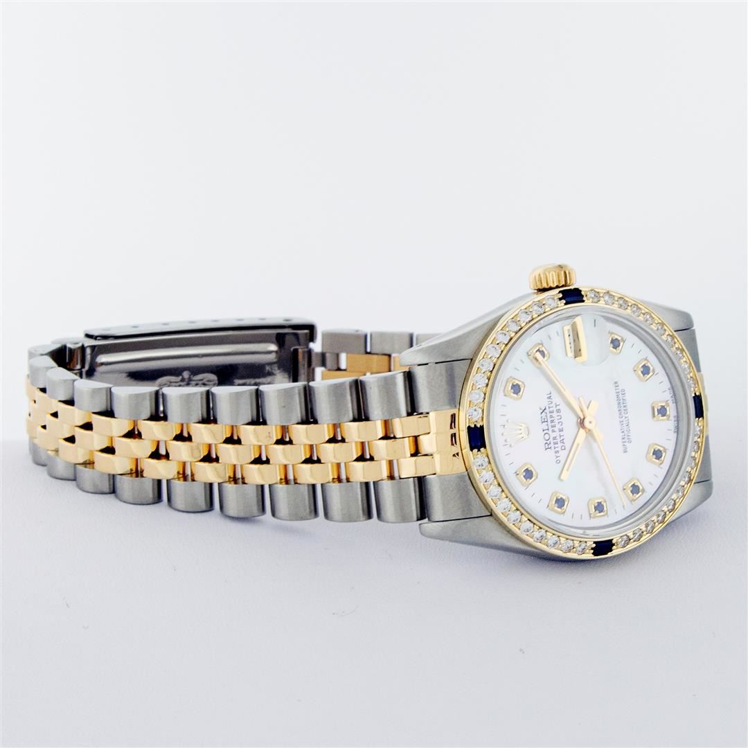 One Mens Pre Owned Yellow Gold Two Tone Rolex Datejust Polished, Serviced & Electronically Tested, Yellow Gold & Stainless Steel Case: 36mm, Yellow Gold Crown, Custom Bezel: New 18K Yellow Gold Sapphire Bead set Diamond Bezel, Diamond Count: 36 Diamonds + 4 Sapphires, Clarity: SI-VS, Color: G to H. Custom Crystal: New Sapphire With Date Window. Custom Hands: New Luminescent Hands. Rolex Movement: Automatic Winding Movement. Custom Dial: Mother Of Pearl Sapphire Dial, Gem Count: 10 Sapphires On Dial, G To H In Color, SI-VS Clarity. Date Window: 3 O'clock Position Date Display, Quickset, Model: Datejust. Condition: G-6 Extra Fine. Rolex Bracelet: Two Tone Yellow Gold & Stainless Steel Jubilee Band. Bright Polish. 7.0 Inch Length, Adjustable. Standard Clasp, With Rolex Logo. This Watch Has Been Serviced Time Tested And Is In Excellent Condition It Is Free Of All Scratches And Dents.