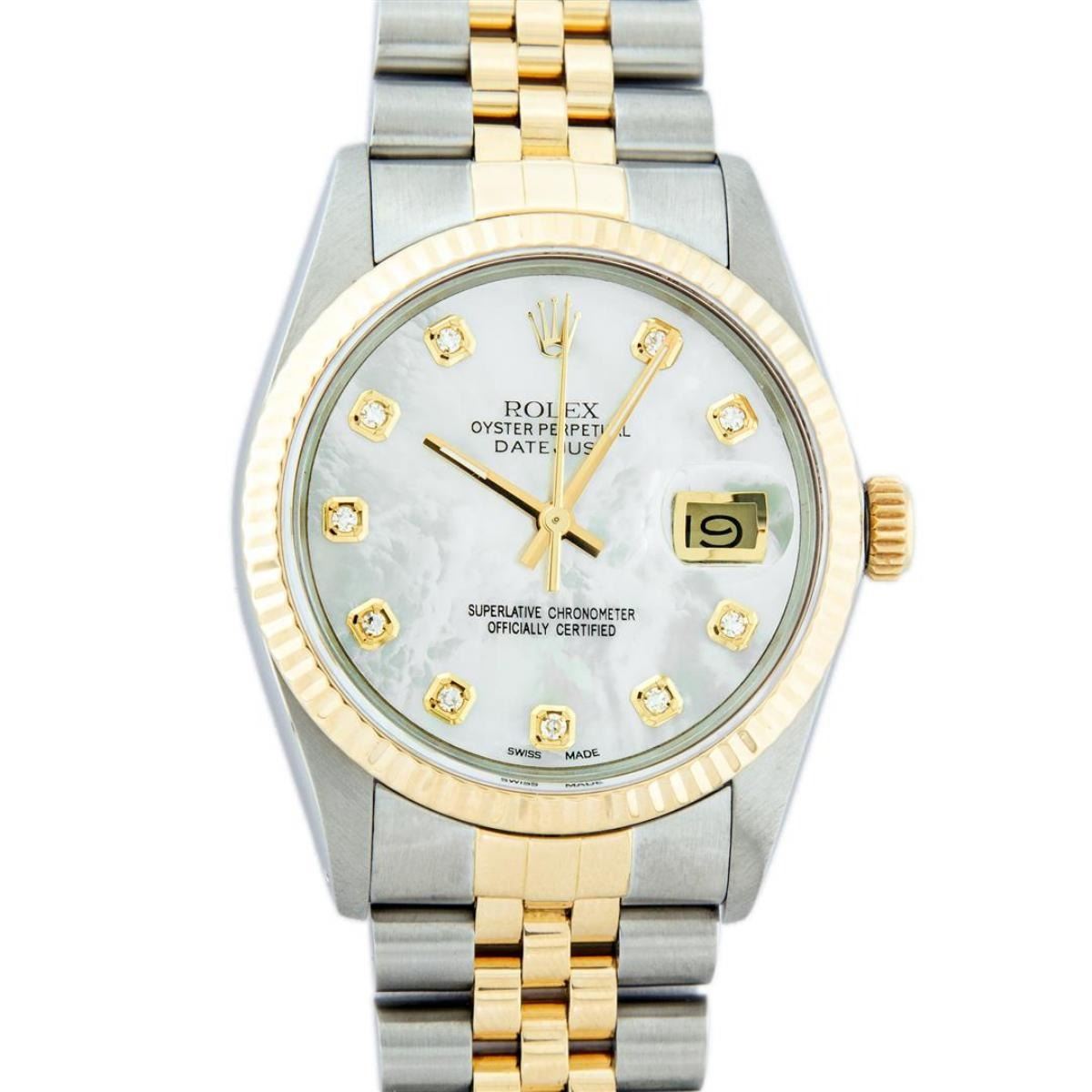 One Mens Yellow Gold Two Tone Rolex Datejust Polished, Serviced & Electronically Tested, Yellow Gold & Stainless Steel Case: 36mm, Yellow Gold Crown, Bezel: 18K Yellow Gold Fluted Bezel. Custom Crystal: New Acrylic Cyclops Lens. Custom Hands: New Hands. Movement: Automatic Winding Movement. Custom Dial: Mother Of Pearl Dial Set With Diamond Hour Markers, Diamond Count: 10 Diamonds in Dial G To H In Color, VS Clarity. Date Window: 3 O'Clock Position Date Display, Quickset, Model: Condition: G-6 Extra Fine. Bracelet: Two Tone Yellow Gold & Stainless Steel Jubilee. Bright Polish. 7.0 Inch Length, Adjustable. Standard Clasp, With Rolex Logo. Watch Has Been Serviced And Polished It Is Free Of All Scratches And Dents. This Watch Has Been Serviced Time Tested And Is In Excellent Condition It Is Free Of All Scratches And Dents.