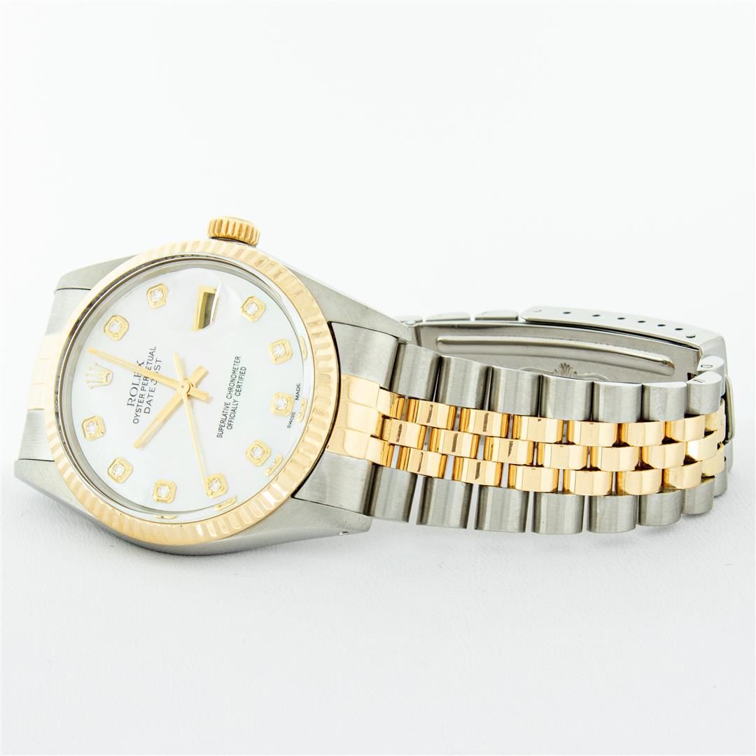 One Mens Pre Owned Yellow Gold Two Tone Rolex Datejust Polished, Serviced & Electronically Tested, Rolex Yellow Gold & Stainless Steel Case: 36mm, Rolex Yellow Gold Crown, Rolex Bezel: 18K Yellow Gold Fluted Bezel. Custom Crystal: New Acrylic Cyclops Lens. Custom Hands: New Hands. Rolex Movement: Automatic Winding Movement. Custom Dial: Refinished To Mother Of Pearl Dial With Added Diamond Hour Markers, Diamond Count: 10 Diamonds in Dial G To H In Color, VS Clarity. Date Window: 3 O'Clock Position Date Display, Quickset, Model: Condition: G-6 Extra Fine. Rolex Bracelet: Two Tone Yellow Gold & Stainless Steel Jubilee Band. Bright Polish. 7.0 Inch Length, Adjustable. Standard Clasp, With Rolex Logo. Watch Has Been Serviced And Polished It Is Free Of All Scratches And Dents. This Watch Has Been Serviced Time Tested And Is In Excellent Condition It Is Free Of All Scratches And Dents.