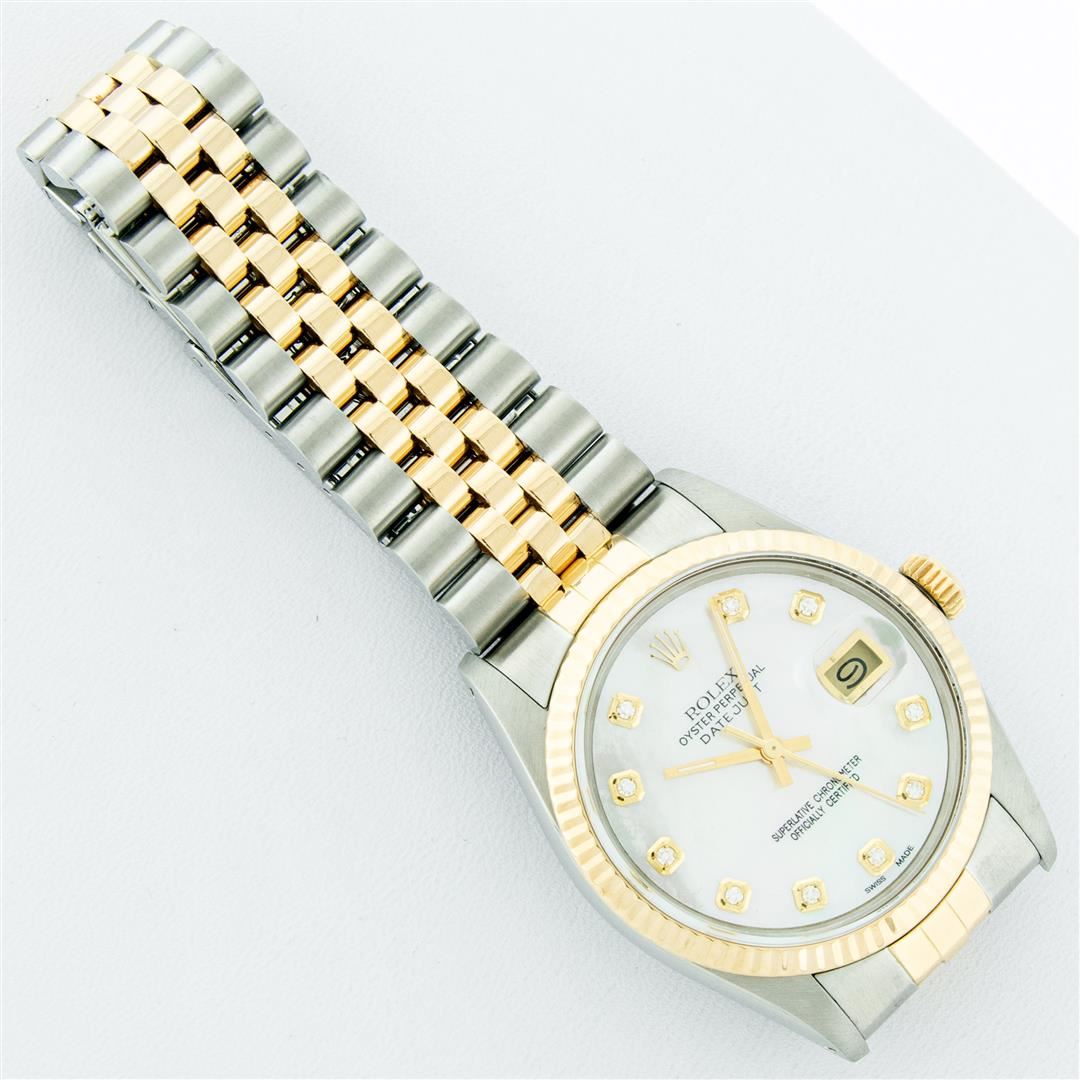 One Mens Pre Owned Yellow Gold Two Tone Rolex Datejust Polished, Serviced & Electronically Tested, Rolex Yellow Gold & Stainless Steel Case: 36mm, Rolex Yellow Gold Crown, Rolex Bezel: 18K Yellow Gold Fluted Bezel. Custom Crystal: New Acrylic Cyclops Lens. Custom Hands: New Hands. Rolex Movement: Automatic Winding Movement. Custom Dial: Refinished To Mother Of Pearl Dial With Added Diamond Hour Markers, Diamond Count: 10 Diamonds in Dial G To H In Color, VS Clarity. Date Window: 3 O'Clock Position Date Display, Quickset, Model: Condition: G-6 Extra Fine. Rolex Bracelet: Two Tone Yellow Gold & Stainless Steel Jubilee Band. Bright Polish. 7.0 Inch Length, Adjustable. Standard Clasp, With Rolex Logo. Watch Has Been Serviced And Polished It Is Free Of All Scratches And Dents. This Watch Has Been Serviced Time Tested And Is In Excellent Condition It Is Free Of All Scratches And Dents.