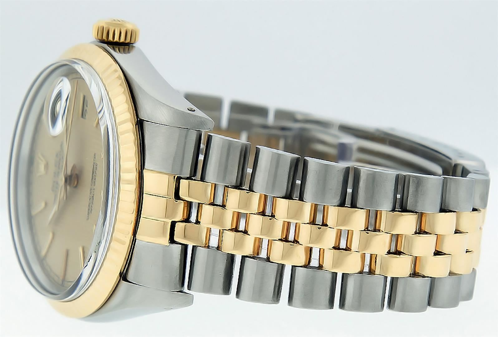 One Mens Yellow Gold Two Tone Rolex Datejust Polished, Serviced & Electronically Tested, Yellow Gold & Stainless Steel Case: 36mm, Yellow Gold Crown, Bezel: Yellow Gold Fluted Bezel. Custom Crystal: New Acrylic Cyclops Lens. Hands: Luminescent Hands. Movement: Automatic Winding Movement. Dial: Champagne Tapestry Index Dial With Roman Square Track. Date Window: 3 O'Clock Position Date Display, Quickset, Model: Datejust. Condition: G-6 Extra Fine. Bracelet: Two Tone Yellow Gold & Stainless Steel Jubilee. Bright Polish. 7.0 Inch Length, Adjustable. Standard Clasp, With Rolex Logo. This Watch Has Been Serviced Time Tested And Is In Excellent Condition It Is Free Of All Scratches And Dents.
