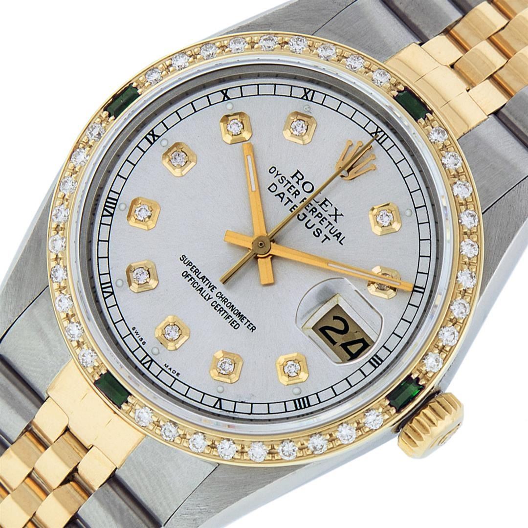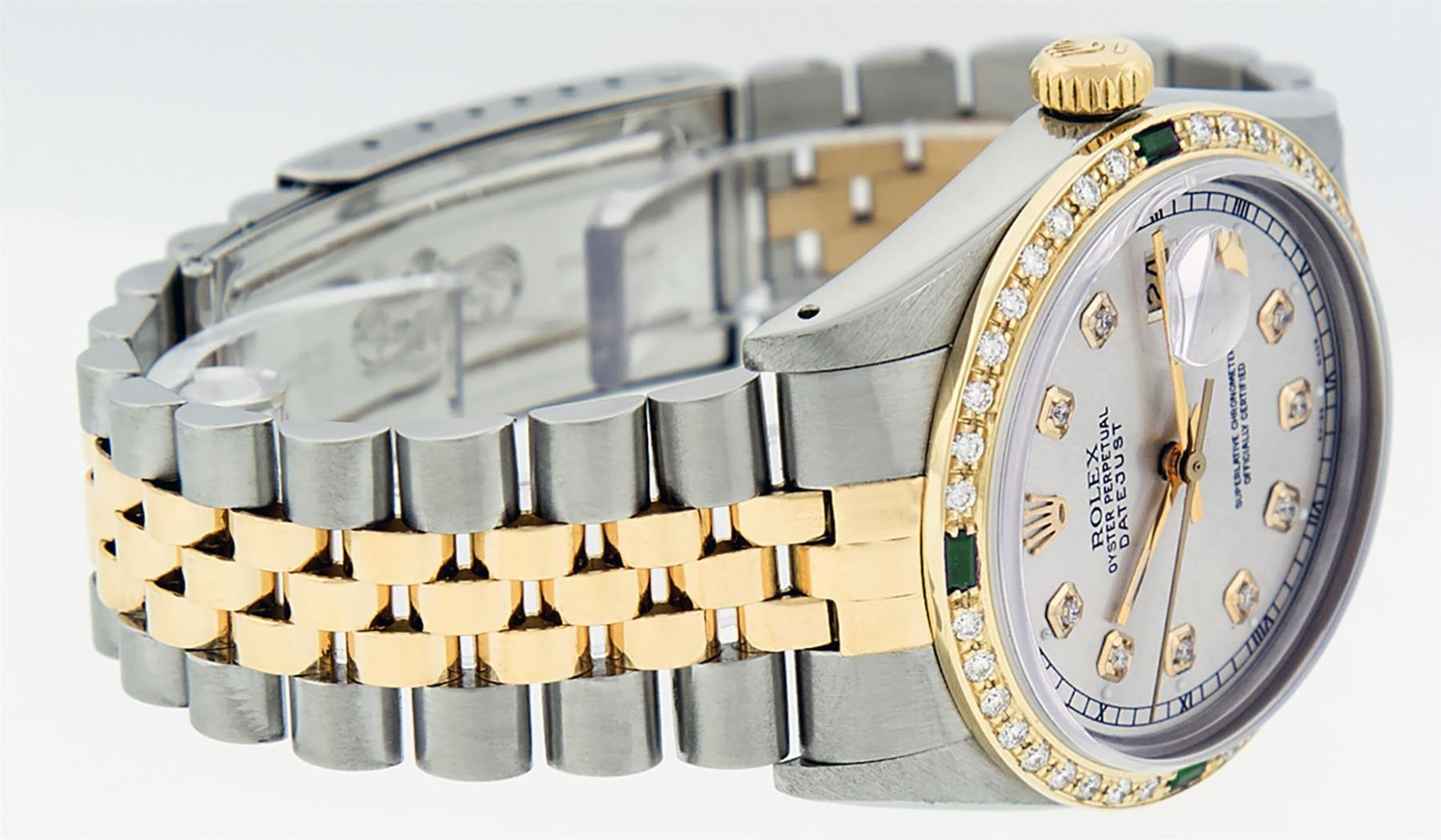 One Mens Pre Owned Yellow Gold Two Tone Rolex Datejust Polished, Serviced & Electronically Tested, Rolex Yellow Gold & Stainless Steel Case: 36mm, Rolex Yellow Gold Crown, Custom Bezel: New 18K Yellow Gold Emerald Bead set Diamond Bezel, Diamond Count: 36
