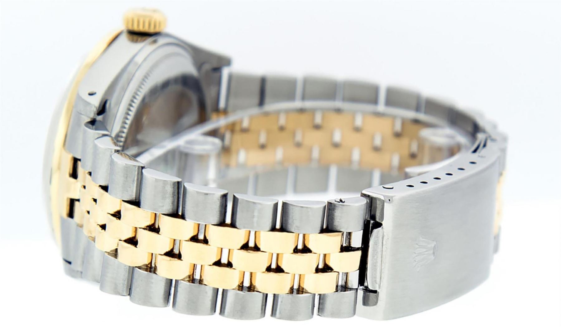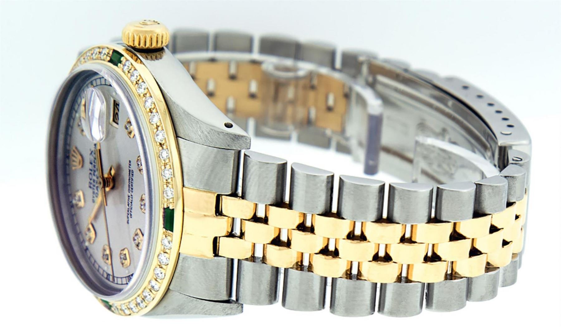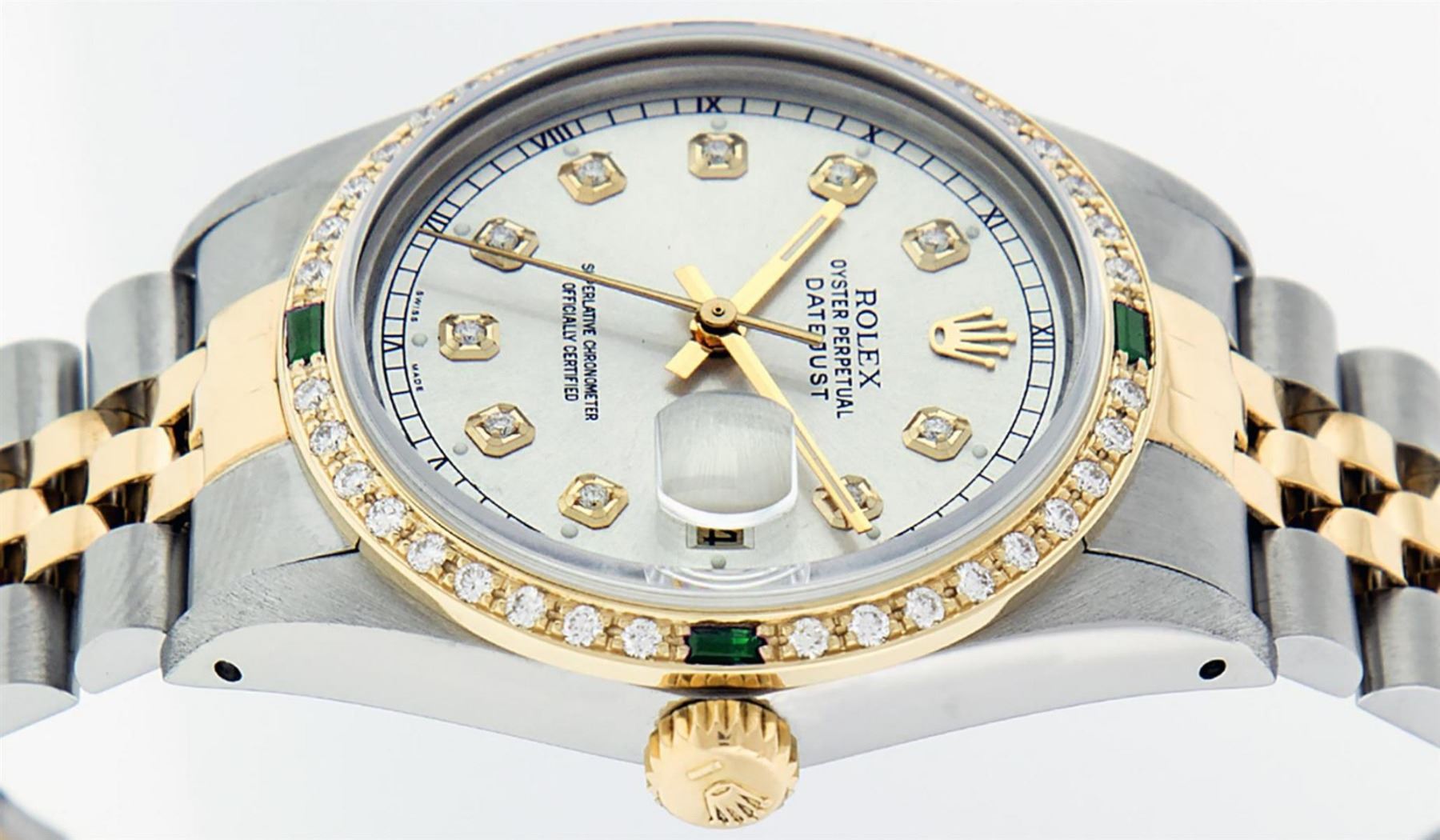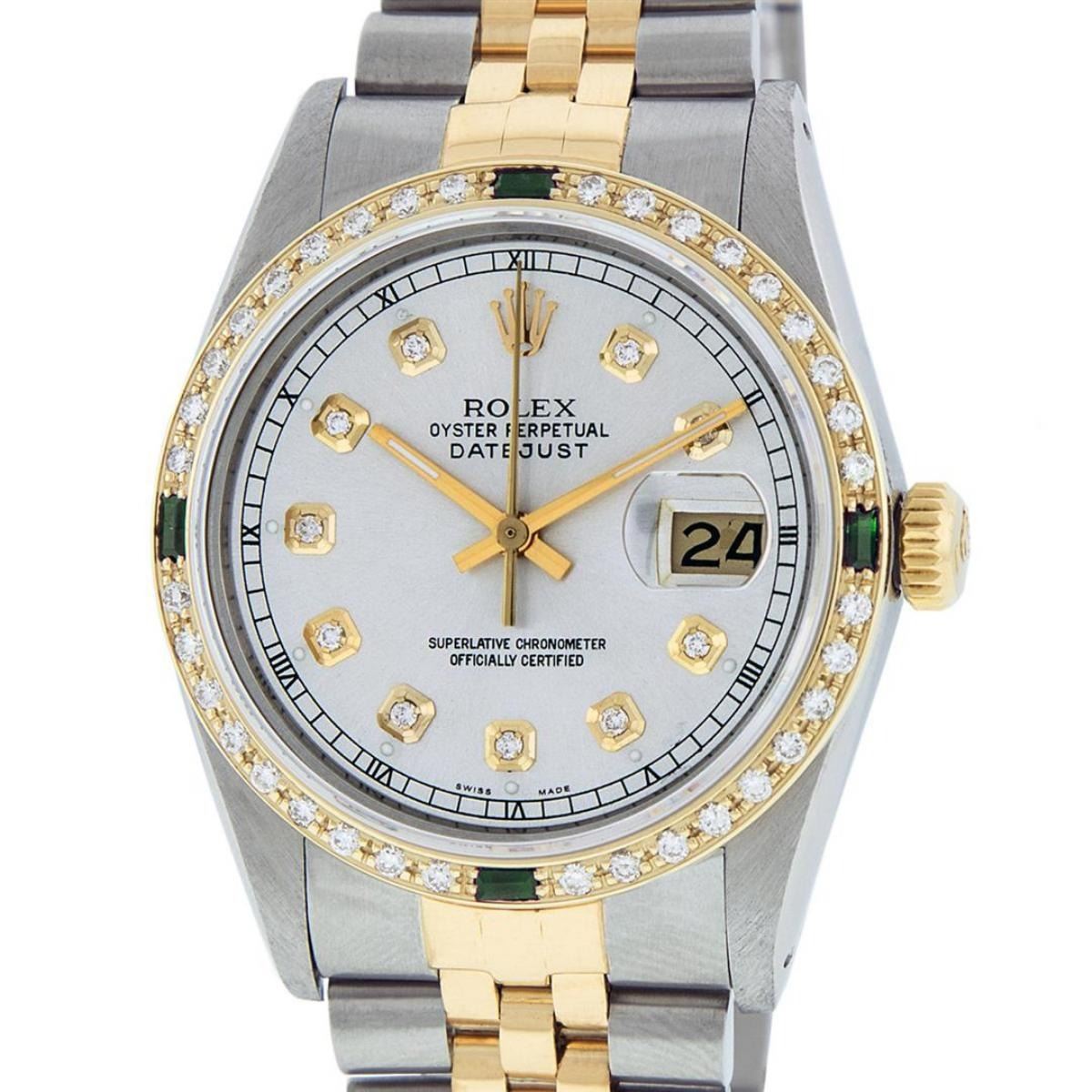 One Mens Yellow Gold Two Tone Rolex Datejust Polished, Serviced & Electronically Tested, Yellow Gold & Stainless Steel Case: 36mm, Yellow Gold Crown, Custom Bezel: New 18K Yellow Gold Emerald Beadset Diamond Bezel, Diamond Count: 36 Diamonds + 4 Emeralds, Total Weight 1.00 Carat, Clarity: SI-VS, Color: G to H. Custom Crystal: New Scratch Resistant Synthetic Sapphire Cyclops Lens. Custom Hands: New Luminecent Hands. Movement: Automatic Winding Movement. Custom Dial: Silver Diamond With Square Roman Track & Lumi Dots. Diamond Count: 10 Diamonds In Dial, Clarity: SI-VS, Color: Color G to H Date Window: 3 O'Clock Position Date Display, Quickset, Model: Datejust, Condition: G-6 Extra Fine. Bracelet:Two Tone Yellow Gold & Stainless Steel Jubilee. Bright Polish. 7.0 Inch Length, Adjustable. Standard Clasp, With Rolex Logo. This Watch Has Been Serviced Time Tested And Is In Excellent Condition It Is Free Of All Scratches And Dents.