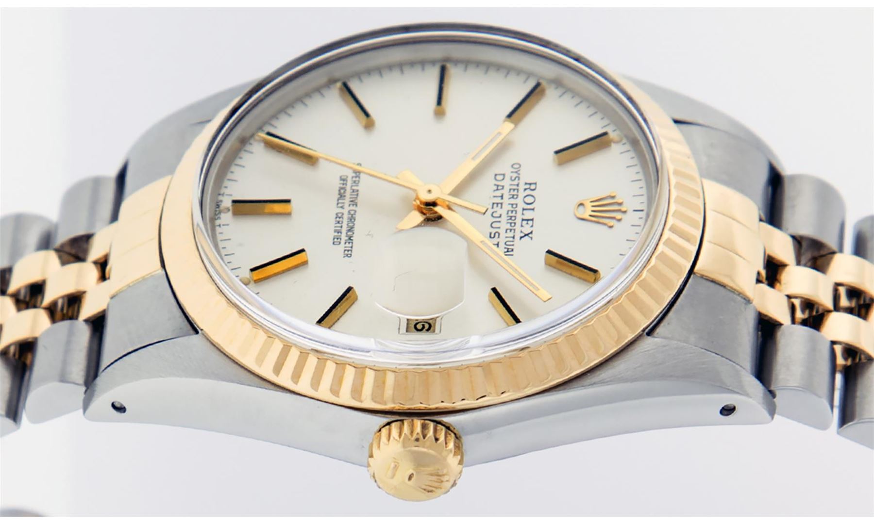 One Mens Rolex Pre Owned Two Tone Yellow Gold And Stainless Steel Rolex Datejust Polished, Serviced & Electronically Tested, Rolex Yellow Gold & Stainless Steel Case: 36mm, Rolex 14K Yellow Gold Crown, Rolex Bezel: 14K Yellow Gold Fluted Bezel. Custom Crystal: New Acrylic With Magnified Date Window. Custom Hands: New Luminescent Hands. Rolex Movement: Automatic Winding Movement 3035. Rolex Dial: Silver Index With Index Hour Markers and Small Track With Lumi Dots. Date Window: 3 O'Clock Position Date Display, Quickset, Model: Datejust. Condition: G-6 Extra Fine. Rolex Bracelet: Two Tone 14K Yellow Gold & Stainless Steel Jubilee Band. Bright Polish. 7.0 Inch Length, Adjustable. Standard Clasp, With Rolex Logo. This Watch Has Been Serviced Time Tested And Is In Excellent Condition It Is Free Of All Scratches And Dents.