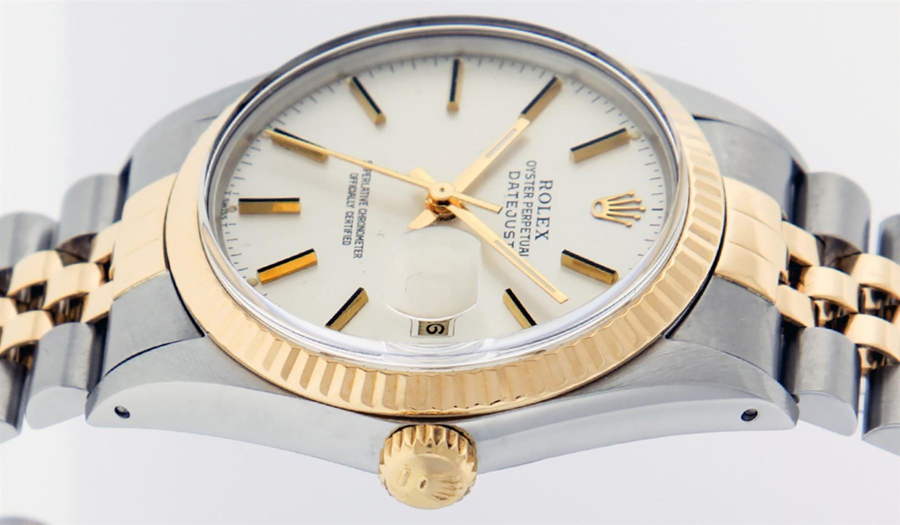 One Mens Rolex Pre Owned Two Tone Yellow Gold And Stainless Steel Rolex Datejust Polished, Serviced & Electronically Tested, Rolex Yellow Gold & Stainless Steel Case: 36mm, Rolex 14K Yellow Gold Crown, Rolex Bezel: 14K Yellow Gold Fluted Bezel. Custom Crystal: New Acrylic With Magnified Date Window. Custom Hands: New Luminescent Hands. Rolex Movement: Automatic Winding Movement 3035. Rolex Dial: Silver Index With Index Hour Markers and Small Track With Lumi Dots. Date Window: 3 O'Clock Position Date Display, Quickset, Model: Datejust. Condition: G-6 Extra Fine. Rolex Bracelet: Two Tone 14K Yellow Gold & Stainless Steel Jubilee Band. Bright Polish. 7.0 Inch Length, Adjustable. Standard Clasp, With Rolex Logo. This Watch Has Been Serviced Time Tested And Is In Excellent Condition It Is Free Of All Scratches And Dents.