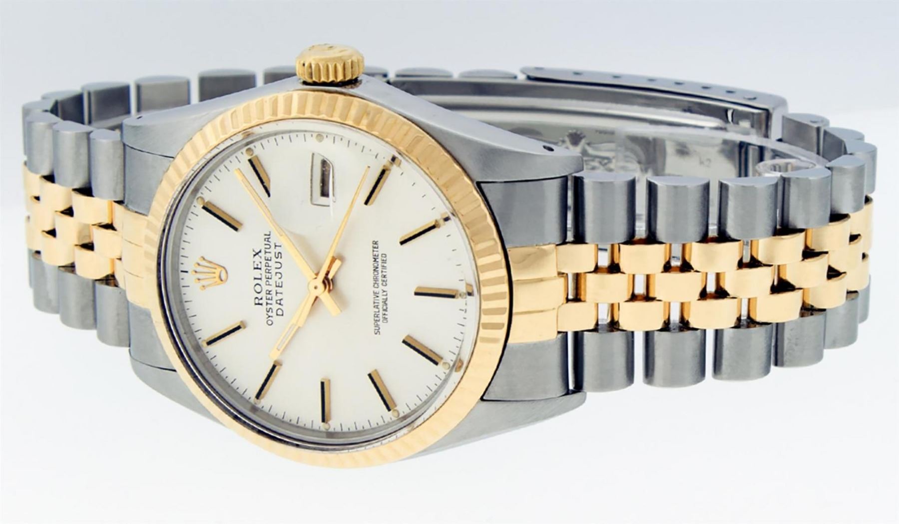 One Mens Pre Owned Yellow Gold Two Tone Rolex Datejust Polished, Serviced & Electronically Tested, Rolex Yellow Gold & Stainless Steel Case: 36mm, Rolex 14K Yellow Gold Crown, Rolex Bezel: Yellow Gold Fluted Bezel. Custom Crystal: New Acrylic Cyclops Lens. Custom Hands: New Luminescent Hands. Rolex Movement: Automatic Winding Movement. Rolex Dial: Silver Index With Index Hour Markers and Small Track With Lumi Dots. Date Window: 3 O'Clock Position Date Display, Quickset, Model: Datejust. Condition: G-6 Extra Fine. Rolex Bracelet: Two Tone Yellow Gold & Stainless Steel Jubilee Band. Bright Polish. 7.0 Inch Length, Adjustable. Standard Clasp, With Rolex Logo. This Watch Has Been Serviced Time Tested And Is In Excellent Condition It Is Free Of All Scratches And Dents.