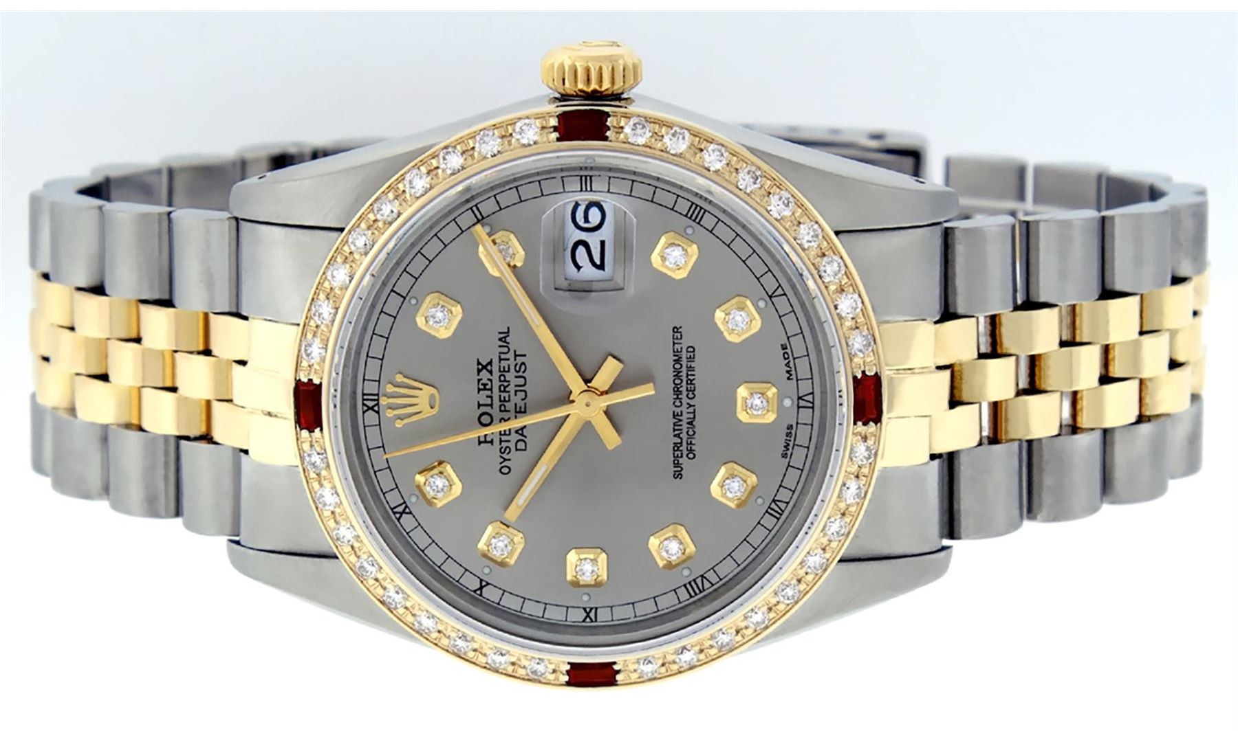 One Mens Pre Owned Yellow Gold Two Tone Rolex Datejust Polished, Serviced & Electronically Tested, Yellow Gold & Stainless Steel Case: 36mm, Yellow Gold Crown, Custom Bezel: New 18K Yellow Gold Ruby Bead set Diamond Bezel, Diamond Count: 36 Diamonds + 4 Rubies, Clarity: SI-VS, Color: G to H. Custom Crystal: New Sapphire With Date Window. Custom Hands: New Luminescent Hands. Rolex Movement: Automatic Winding Movement. Custom Dial: Refinished To Slate Grey With Custom Added Diamonds. Diamond Count: 10 Diamonds On Dial, Clarity: SI-VS, Color: Color G to H Date Window: 3 O'clock Position Date Display, Quickset, Model: Datejust, Condition: G-6 Extra Fine. Rolex Bracelet: Two Tone Yellow Gold & Stainless Steel Jubilee Band. Bright Polish. 7.0 Inch Length, Adjustable. Standard Clasp, With Rolex Logo. This Watch Has Been Serviced Time Tested And Is In Excellent Condition It Is Free Of All Scratches And Dents.