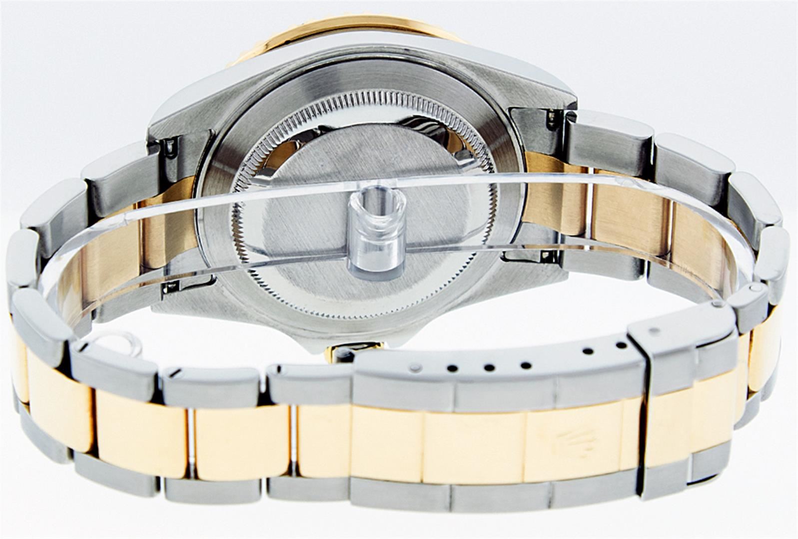 One Mens Pre Owned Rolex 18K Yellow Gold And Stainless Steel Two Tone Submariner With Date Polished, Serviced & Electronically Tested, Rolex Stainless Steel Case: 40mm, Rolex Yellow Gold Crown, Rolex Bezel: Yellow Gold Rotatable Bezel With Blue Insert. Crystal: Sapphire With Cyclops Lens. Rolex Movement: Automatic Winding Movement Caliber 3135. Rolex Dial: Rolex Blue Submariner Dial with Luminous Index Hour Markers, Date Window: 3 O'Clock Position Date Display, Model: Submariner 16613, Quickset, Condition: G-6 Extra Fine. Rolex Bracelet: Stainless Steel and Yellow Gold Oyster Band With Gold Through The Buckle. Bright Polish & Satin Finish. 7.0 Inch Length, Adjustable. Standard Yellow Gold Clasp, With Rolex Logo.