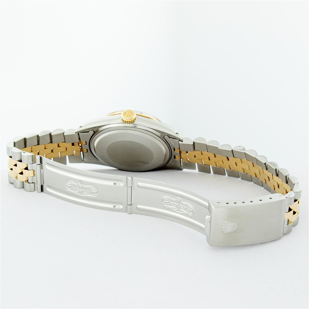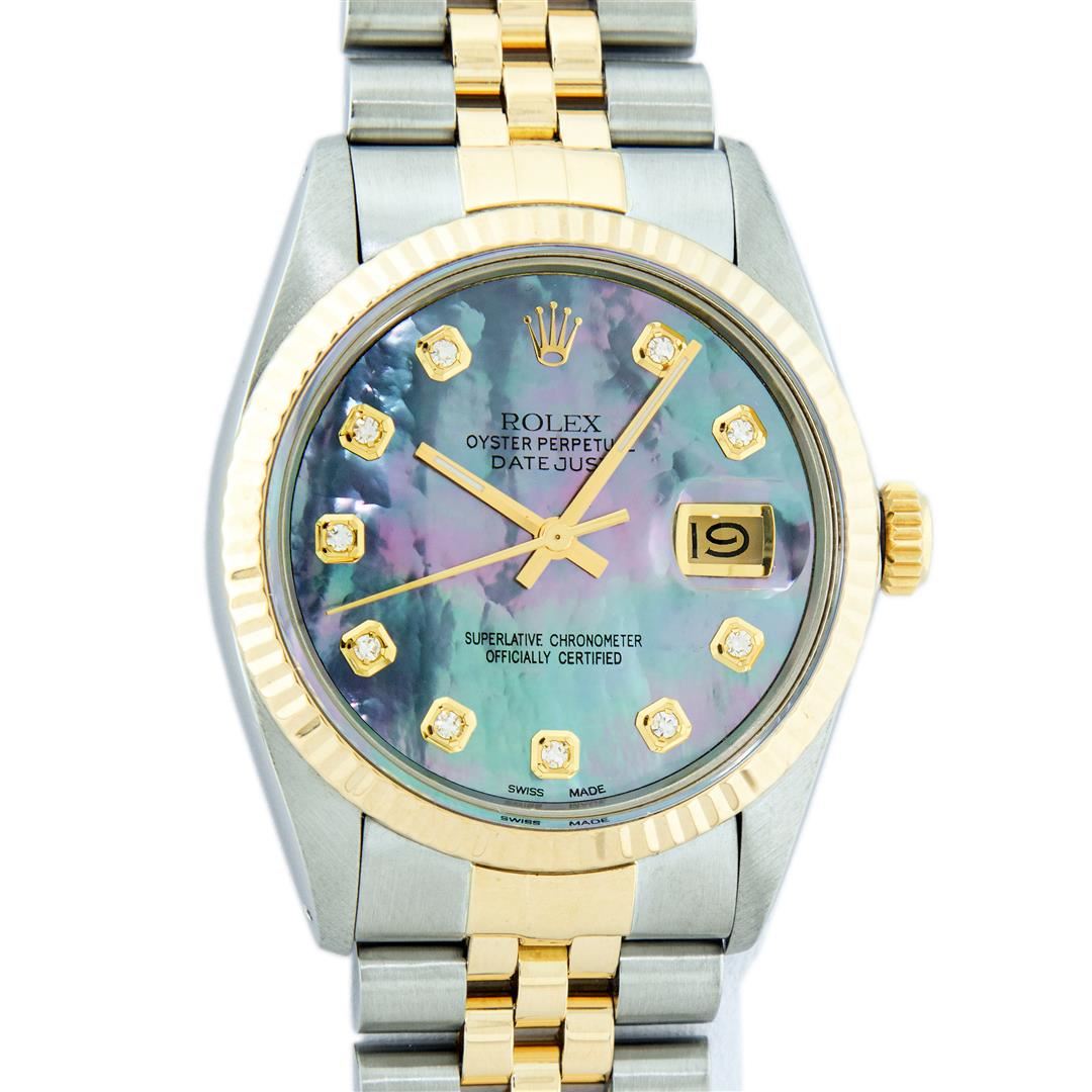 One Mens Yellow Gold Two Tone Rolex Datejust Polished, Serviced & Electronically Tested, Yellow Gold & Stainless Steel Case: 36mm, Yellow Gold Crown, Bezel: Yellow Gold Fluted Bezel. Custom Crystal: New Acrylic Cyclops Lens. Custom Hands: New Luminecent Hands. Movement: Automatic Winding Movement. Custom Dial: Tahitian Mother Of Pearl Diamond Dial, Stone Count: 10 Diamonds On Dial, G To H In Color, SI-VS Clarity. Date Window: 3 O'Clock Position Date Display, Quickset, Model: Datejust. Condition: G-6 Extra Fine. Bracelet: Two Tone Yellow Gold & Stainless Steel Jubilee. Bright Polish. 7.0 Inch Length, Adjustable. Standard Clasp, With Rolex Logo. This Watch Has Been Serviced And Polished It Is Free Of All Scratches And Dents.