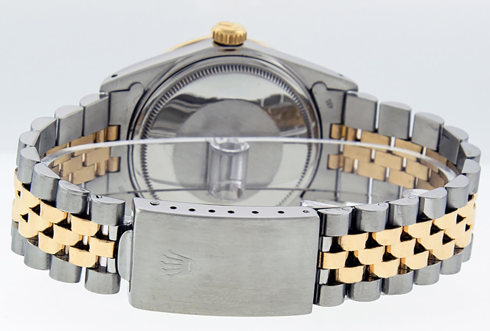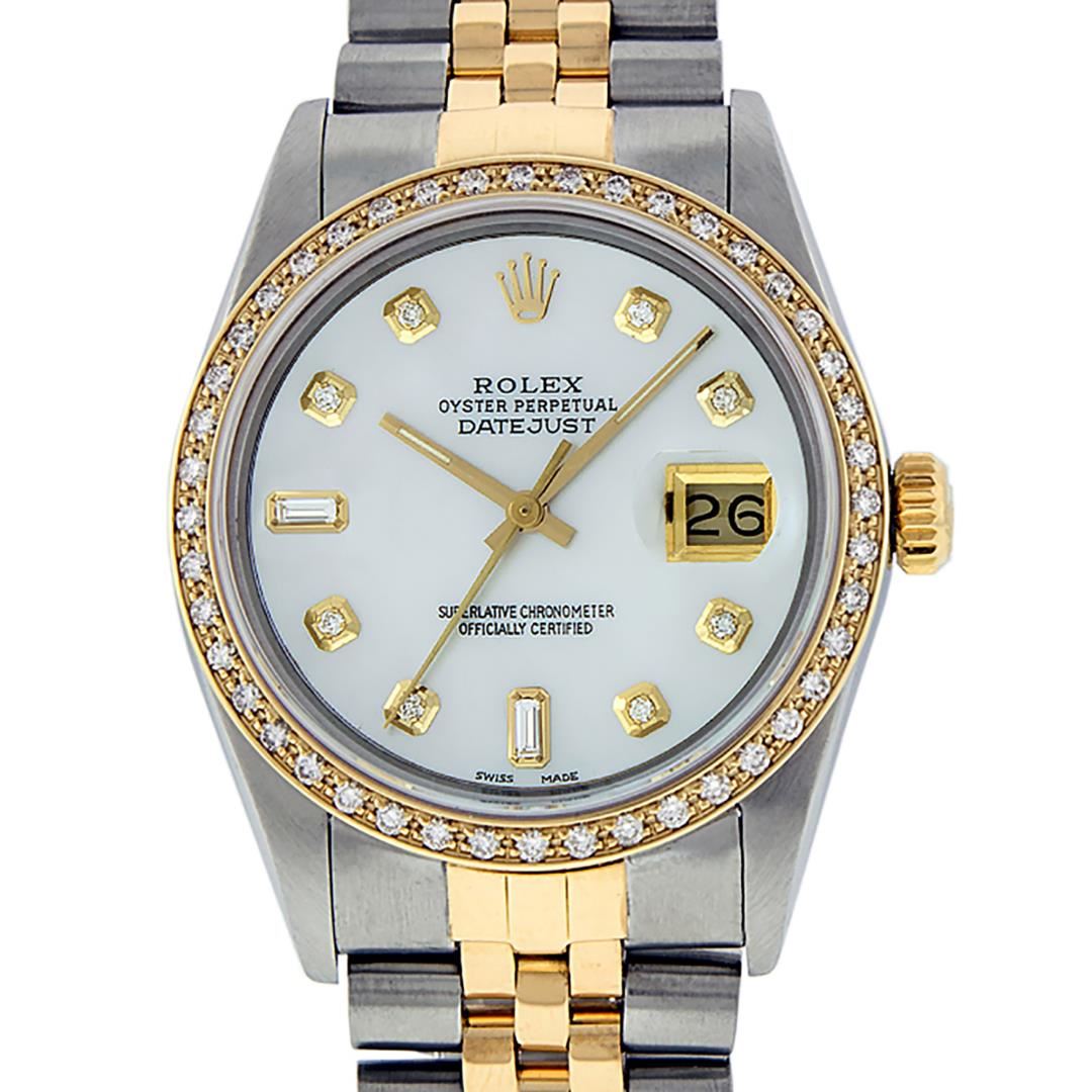 One Mens Pre Owned Yellow Gold And Stainless Steel Two Tone Rolex Datejust Polished, Serviced And Electronically Tested, Rolex Yellow Gold And Stainless Steel Case: 36mm, Yellow Gold Crown, Custom Bezel: New 18K Yellow Gold Beadset Diamond Bezel, Diamond Count: 44 Diamonds. Custom Crystal: New Sapphire With Magnified Date. Rolex Movement: Automatic Winding Movement 3035. Custom Dial: Custom White Dial With Added Diamond Hour Markers, Diamond Count: 8 Diamonds + 2 Baguette Diamond Hour Markers. Date Window: 3 O'Clock Position Date Display, Quickset, Model: Quickset Datejust. Condition: G-6 Extra Fine. Rolex Bracelet: Two Tone Yellow Gold And Stainless Steel Jubilee Band. Bright Polish. 7.0 Inch Length, Adjustable. Standard Clasp, With Rolex Logo. This Watch Has Been Serviced Time Tested And Is In Excellent Condition It Is Free Of All Scratches And Dents.