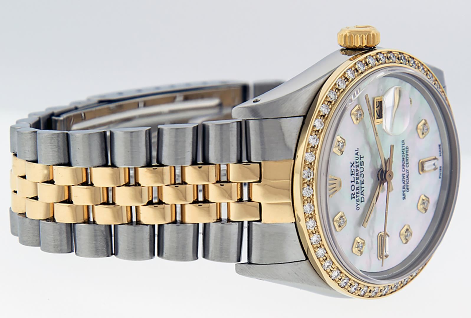 One Mens Pre Owned Yellow Gold And Stainless Steel Two Tone Rolex Datejust Polished, Serviced And Electronically Tested, Rolex Yellow Gold And Stainless Steel Case: 36mm, Yellow Gold Crown, Custom Bezel: New 18K Yellow Gold Beadset Diamond Bezel, Diamond Count: 44 Diamonds. Custom Crystal: New Sapphire With Magnified Date. Rolex Movement: Automatic Winding Movement 3035. Custom Dial: Custom White Dial With Added Diamond Hour Markers, Diamond Count: 8 Diamonds + 2 Baguette Diamond Hour Markers. Date Window: 3 O'Clock Position Date Display, Quickset, Model: Quickset Datejust. Condition: G-6 Extra Fine. Rolex Bracelet: Two Tone Yellow Gold And Stainless Steel Jubilee Band. Bright Polish. 7.0 Inch Length, Adjustable. Standard Clasp, With Rolex Logo. This Watch Has Been Serviced Time Tested And Is In Excellent Condition It Is Free Of All Scratches And Dents.