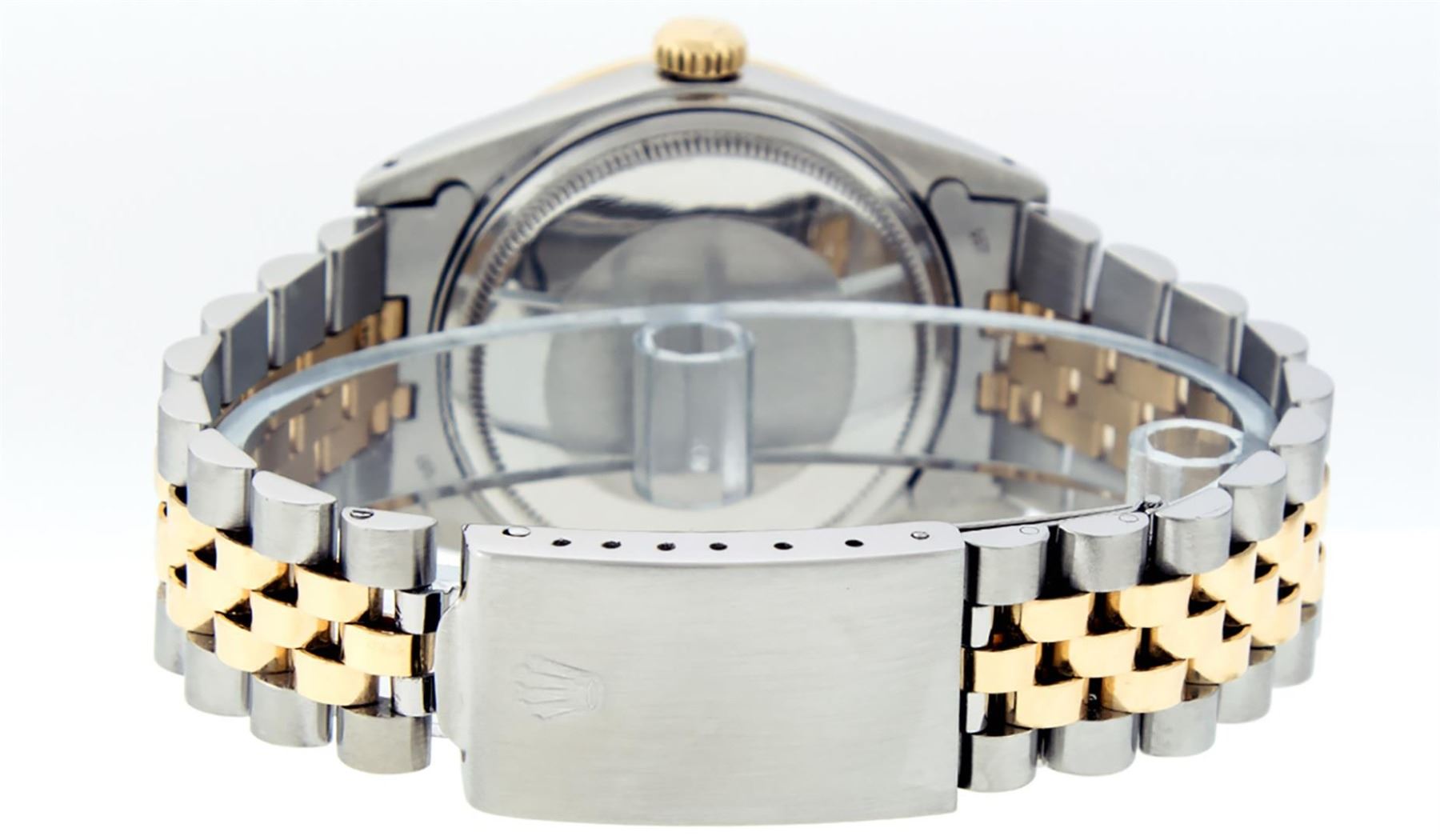 One Mens Pre Owned Yellow Gold Two Tone Rolex Datejust Polished, Serviced & Electronically Tested, Rolex Yellow Gold & Stainless Steel Case: 36mm, Rolex Yellow Gold Crown, Custom Bezel: New 18K Yellow Gold Sapphire Beadset Diamond Bezel, Stone Count: 36 Diamonds + 4 Sapphires, Clarity: SI-VS, Color: G to H. Custom Crystal: New Sapphire Magnified Date. Custom Hands: New Luminescent Hands. Rolex Movement: Automatic Winding Movement. Custom Dial: Refinished White With Custom Diamond Hour Markers, Diamond Count: 10 Diamonds, Clarity: VS2-SI1, Color: G to H. Date Window: 3 O'Clock Position Date Display, Quickset, Model: Datejust. Condition: G-6 Extra Fine. Rolex Bracelet: Two Tone Yellow Gold & Stainless Steel Jubilee. Bright Polish. 7.0 Inch Length, Adjustable. Standard Clasp, With Rolex Logo. This Watch Has Been Serviced Time Tested And Is In Excellent Condition It Is Free Of All Scratches And Dents.